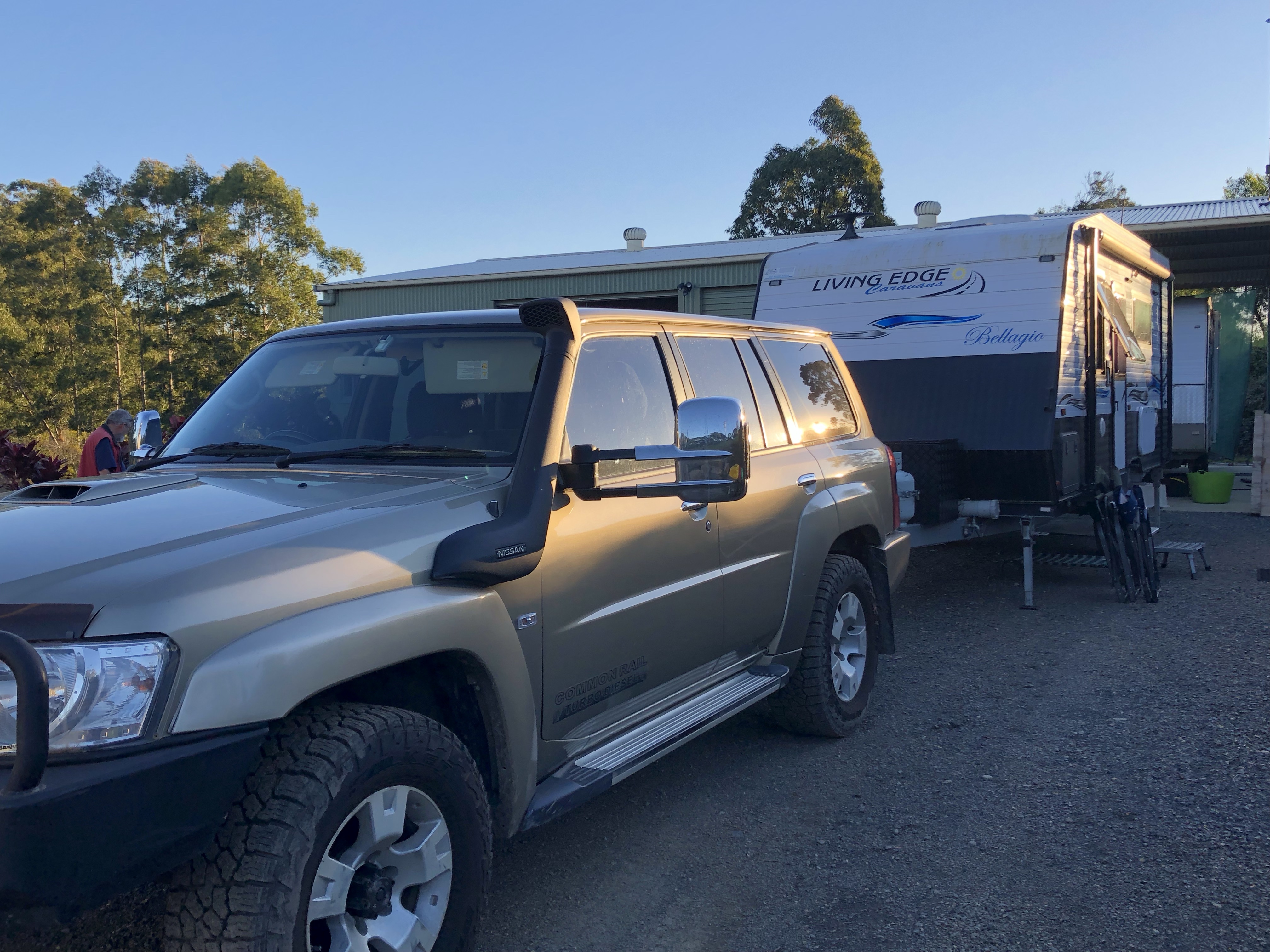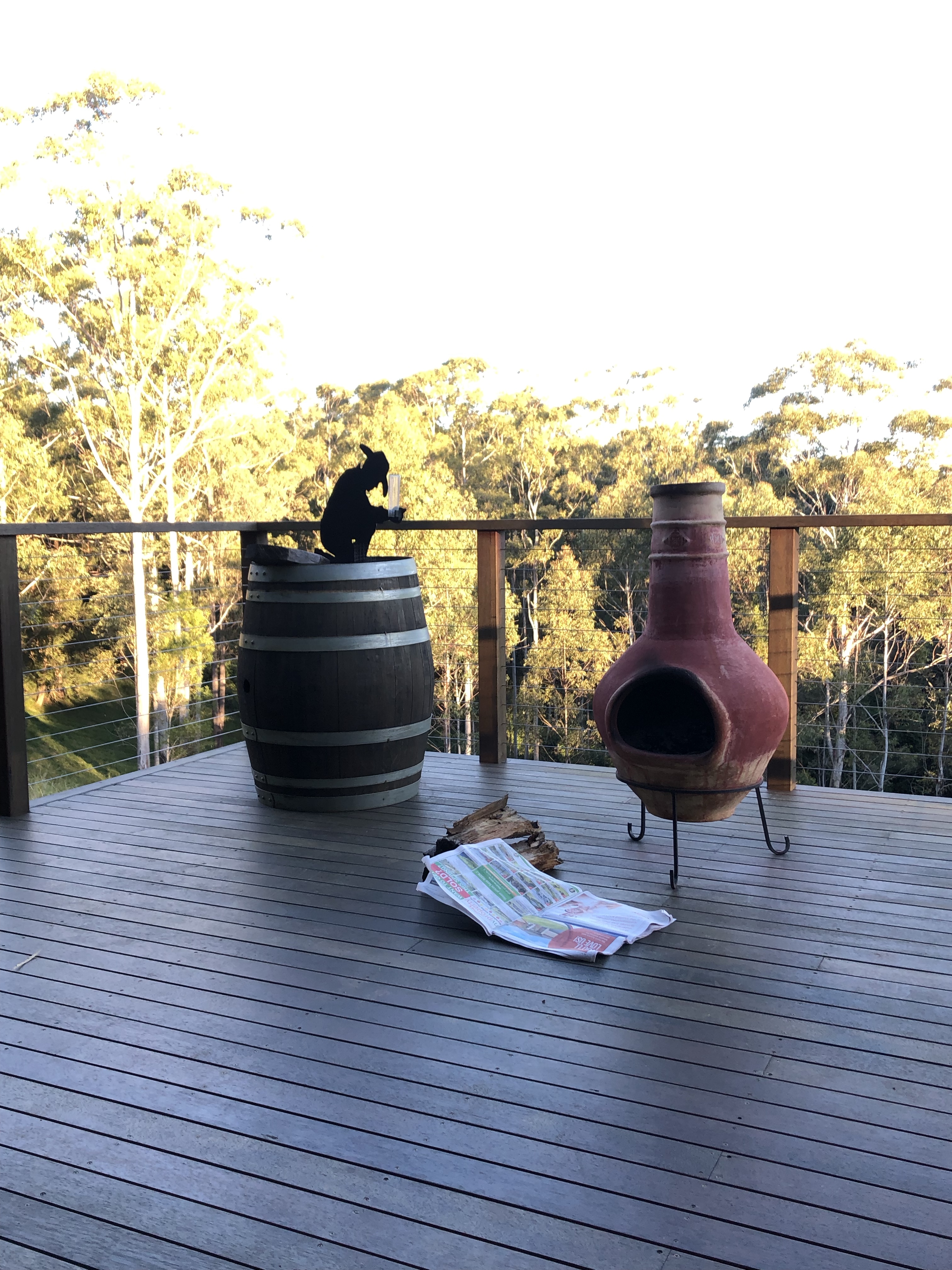 Newee Creek – we were greeted by a very excited Little Wally who ran around in circles barking hello then pausing for the occasional lick. Narelle was more circumspect, greeting us with a Hug. We relaxed together out on the fabulous verandah catching up with a cuppa. Later, once Pete arrived home from the Rose Garden with a gorgeous bunch of roses, we settled down beside the cosy Chininee as rhe sun set, watching the evening stars and passing satelites brighten up the evening sky.