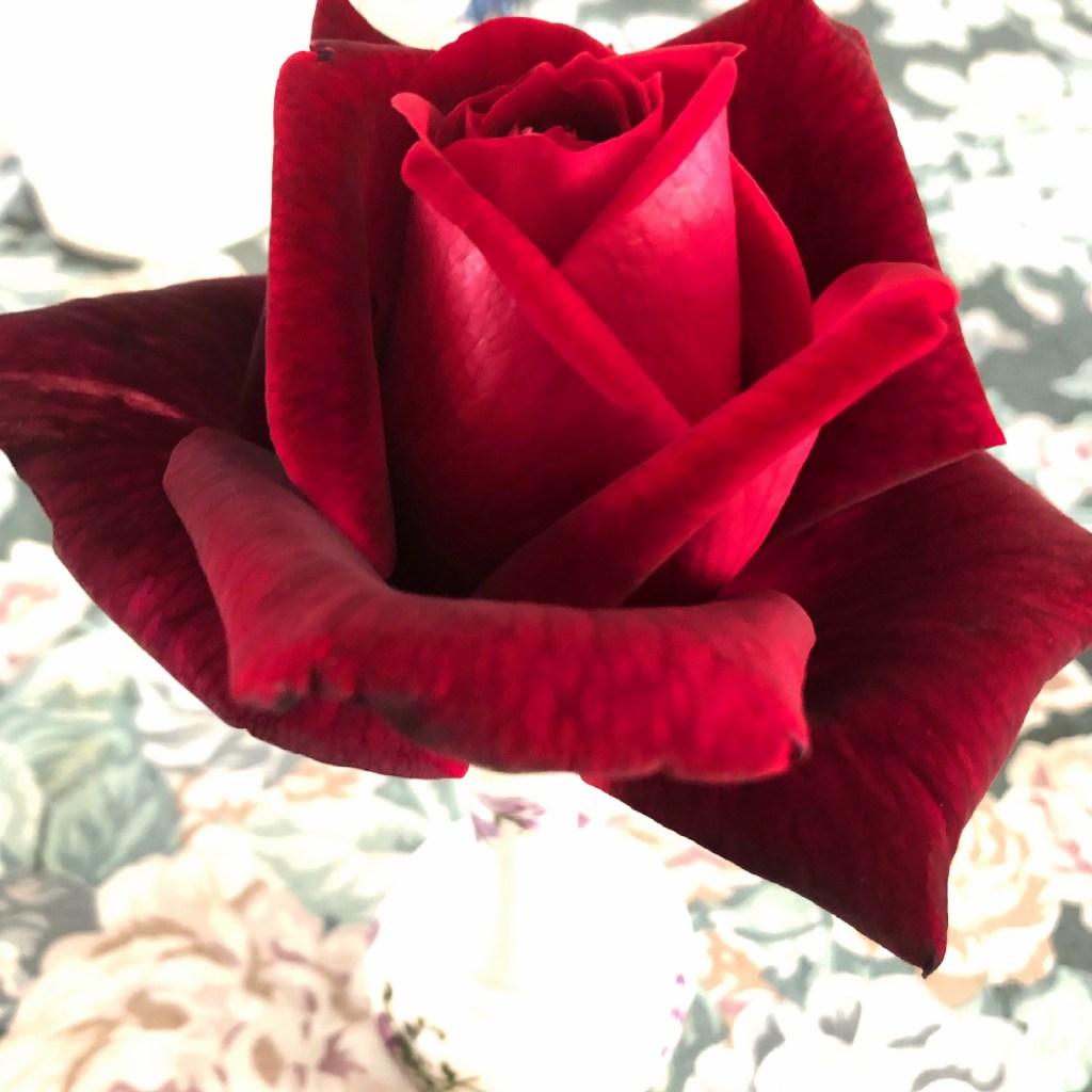 On Monday Norm and I visited my cousin Val, and her two sons, David and Tony up at Elanora. We had originally tried to catch up with Val last year just when COVID first descended upon us and we were denied access over the Queensland border. It was so nice to finally spend time together. It was Val’s birthday on 18 June, so we were able to celebrate it just a little late. Val had a most exquisite rose from her garden, which we both think might be a ‘President Lincoln’. The petals were like dark red velvet and it had a very delicate purfume.