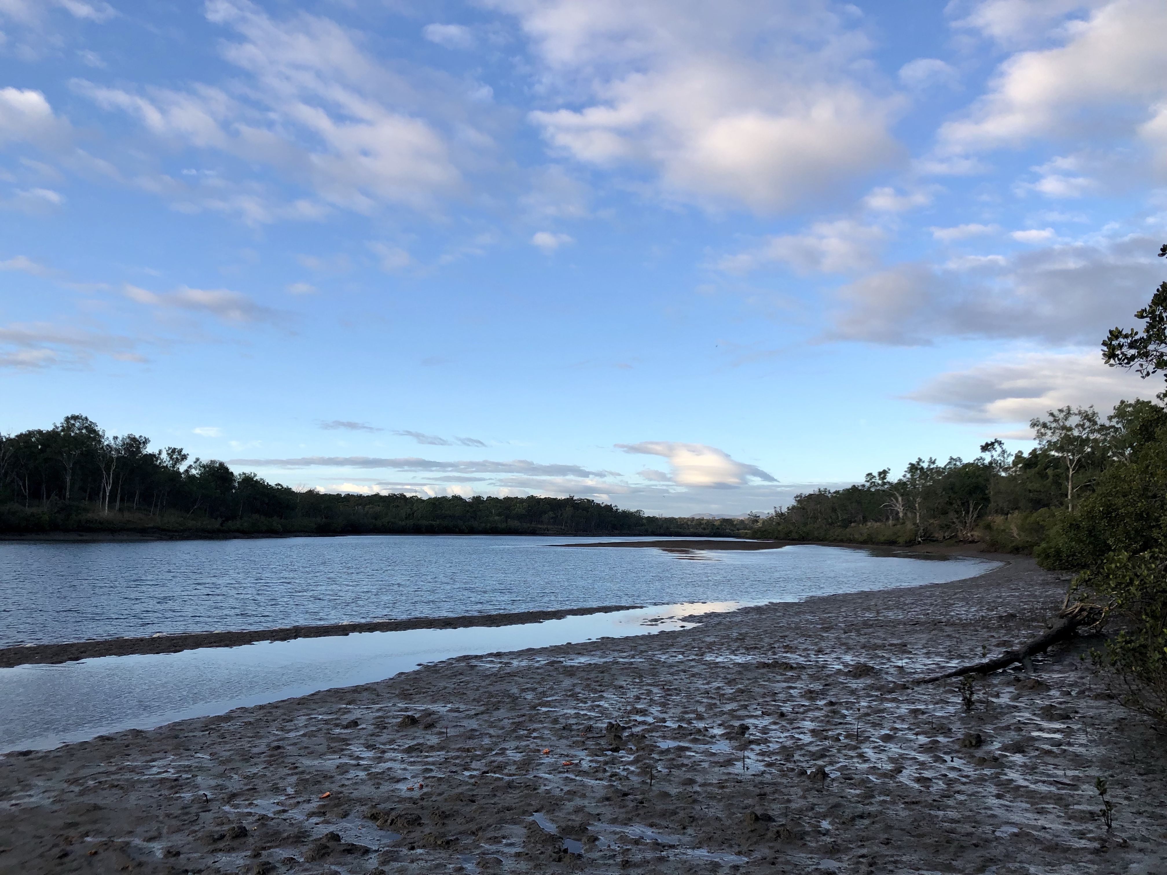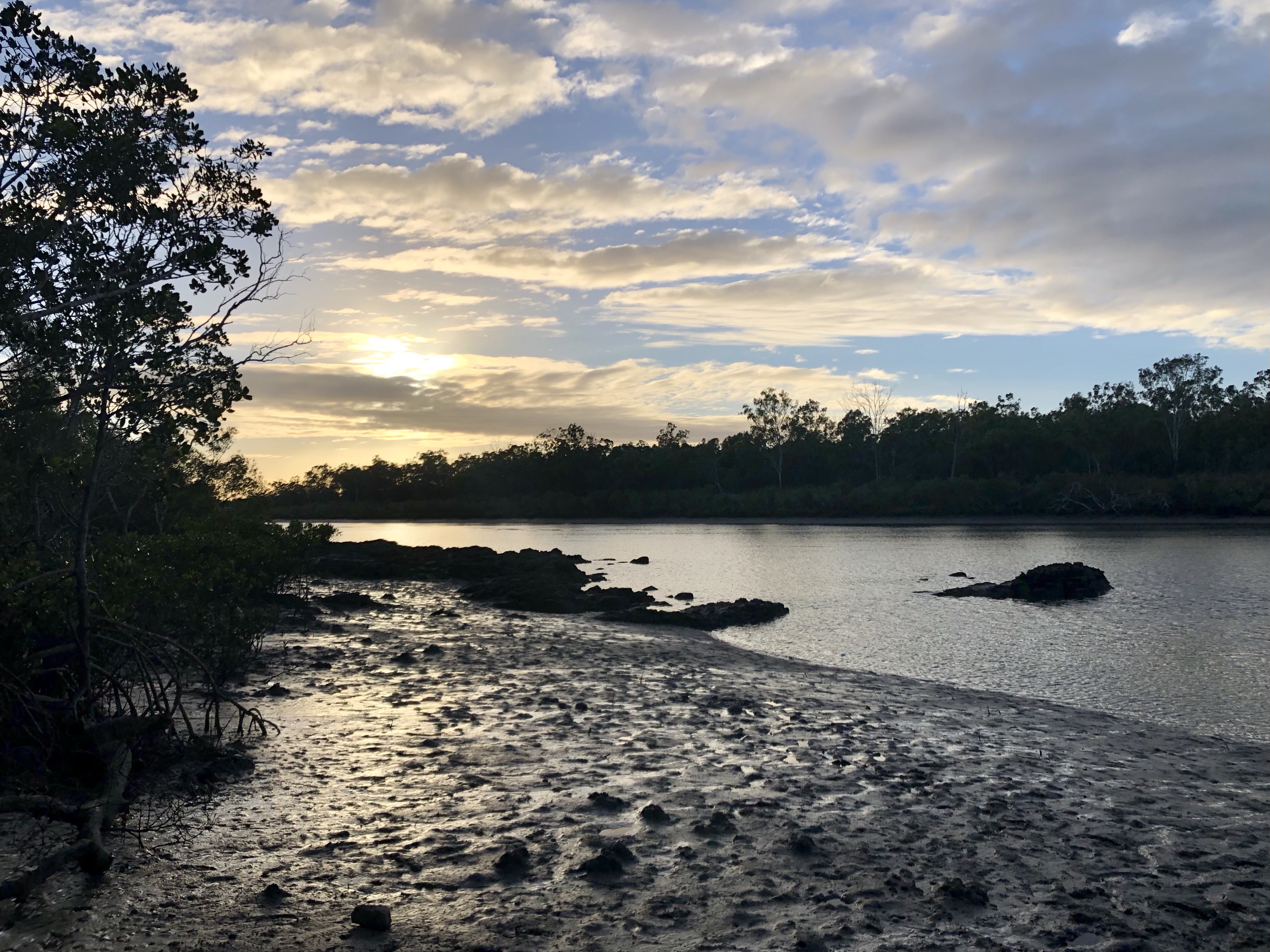 Sunshine greeted Rosie and me on our morning walk today. While I took photos of the sunny sky Rose discovered the muddy mangrove swamp! She looked so alarmed as her feet sank into the black gooey mess.