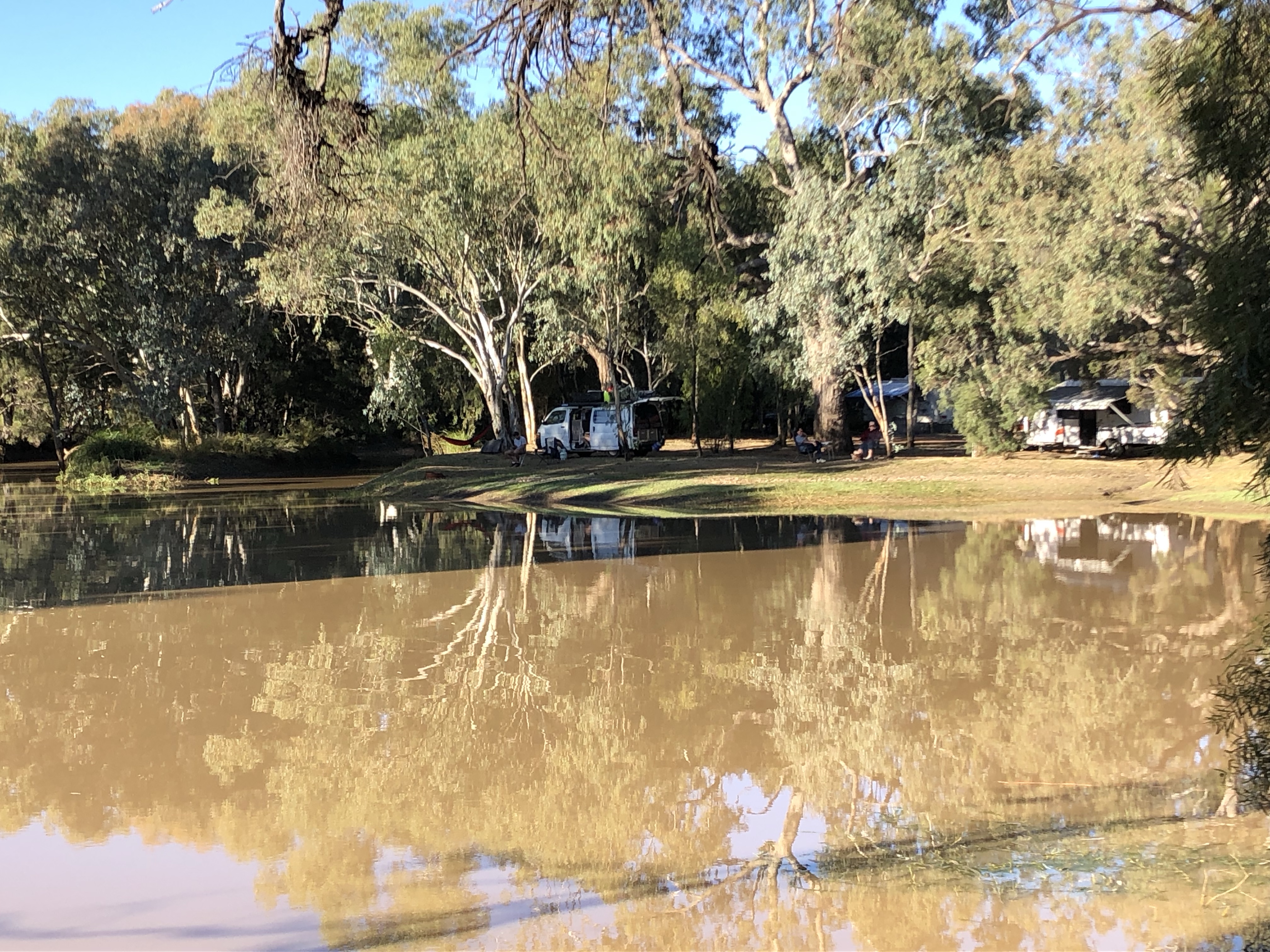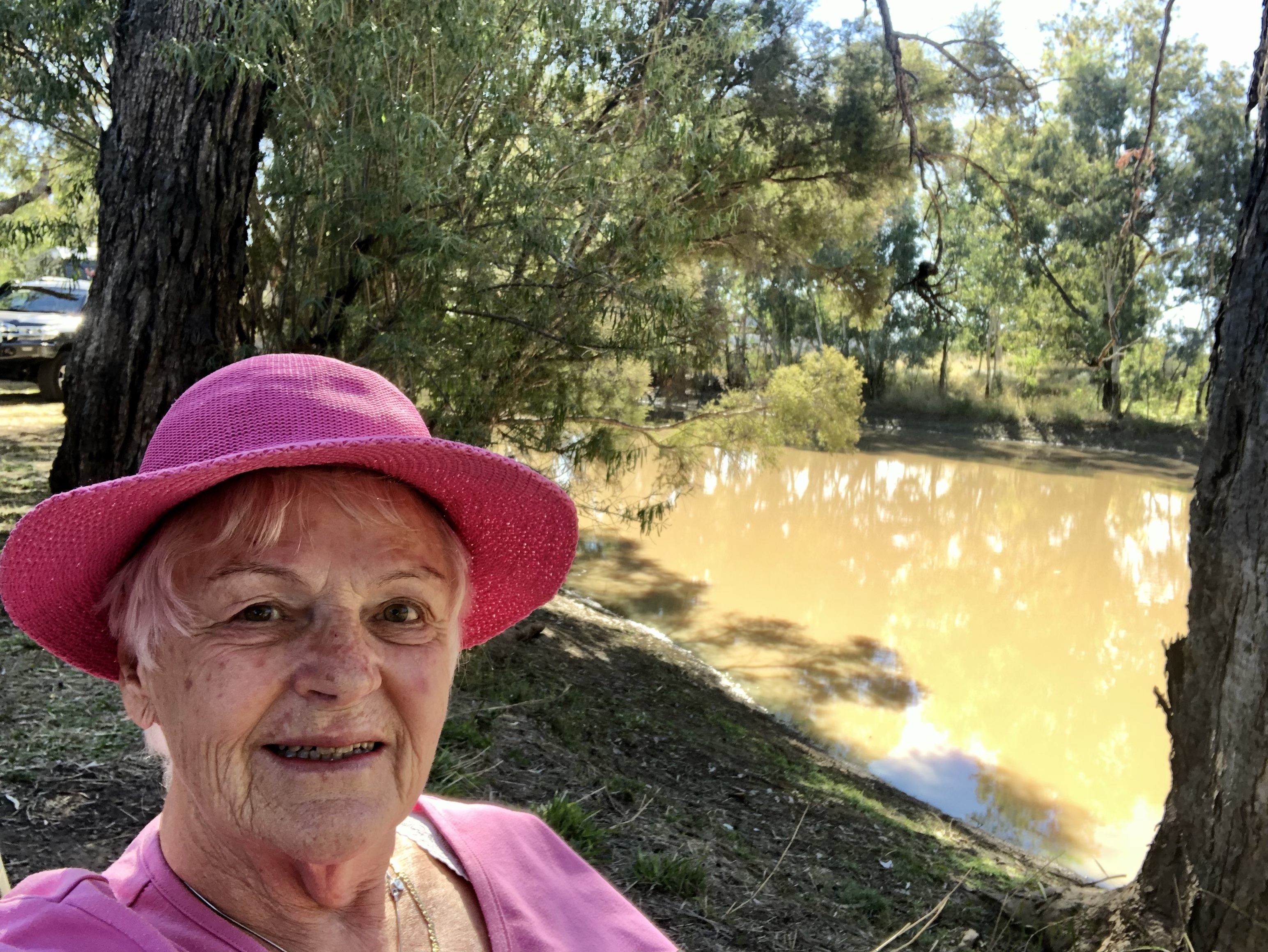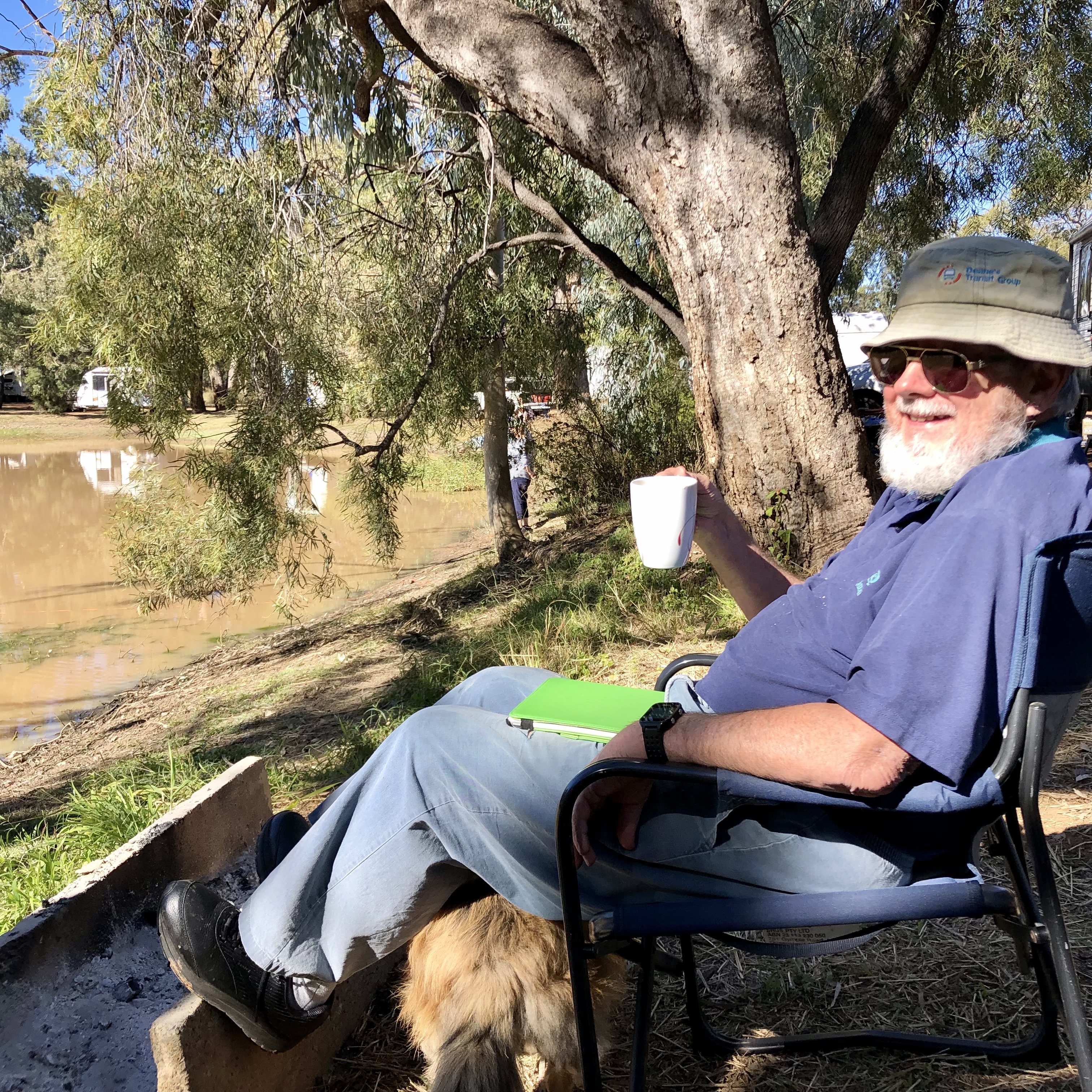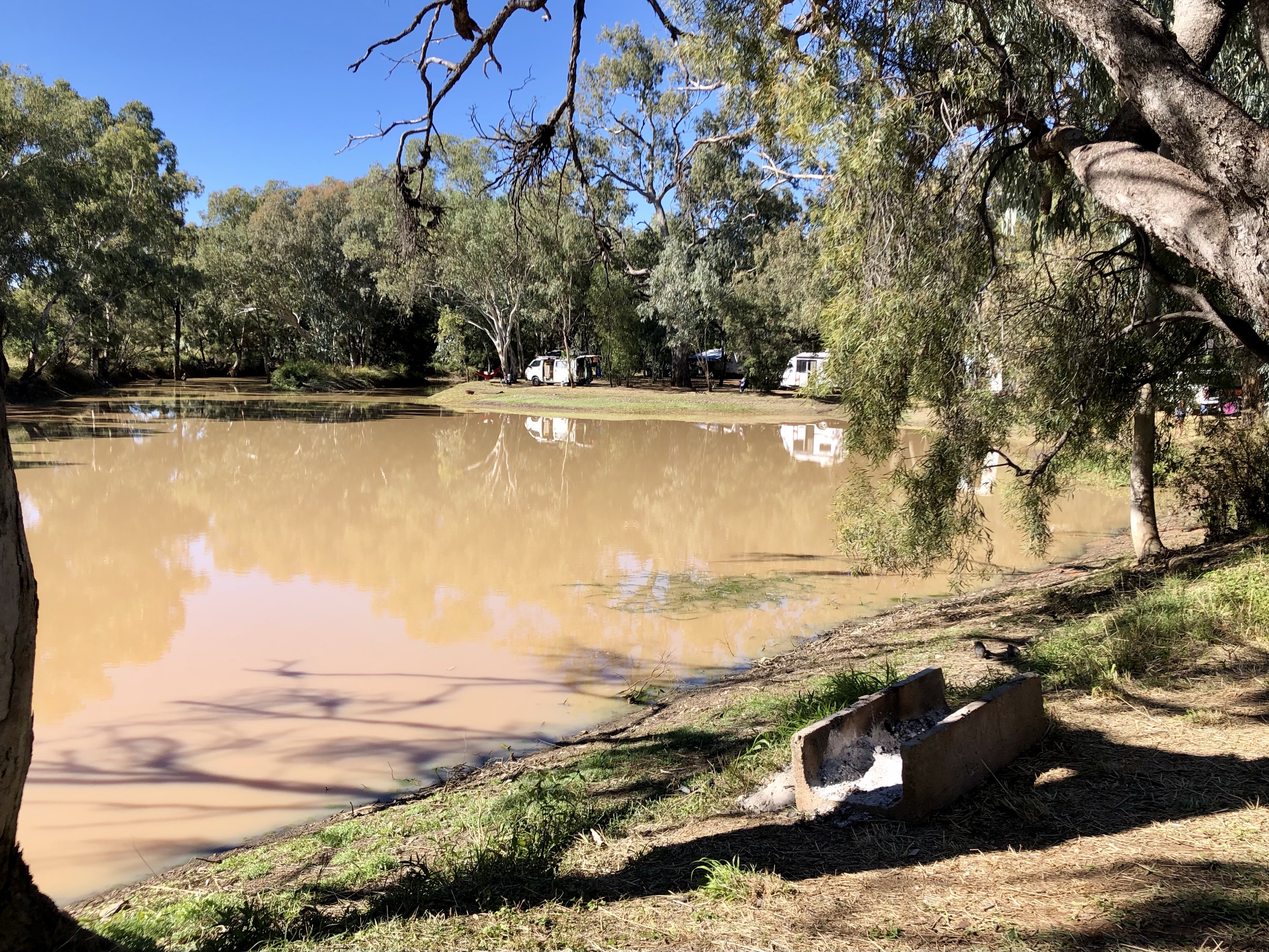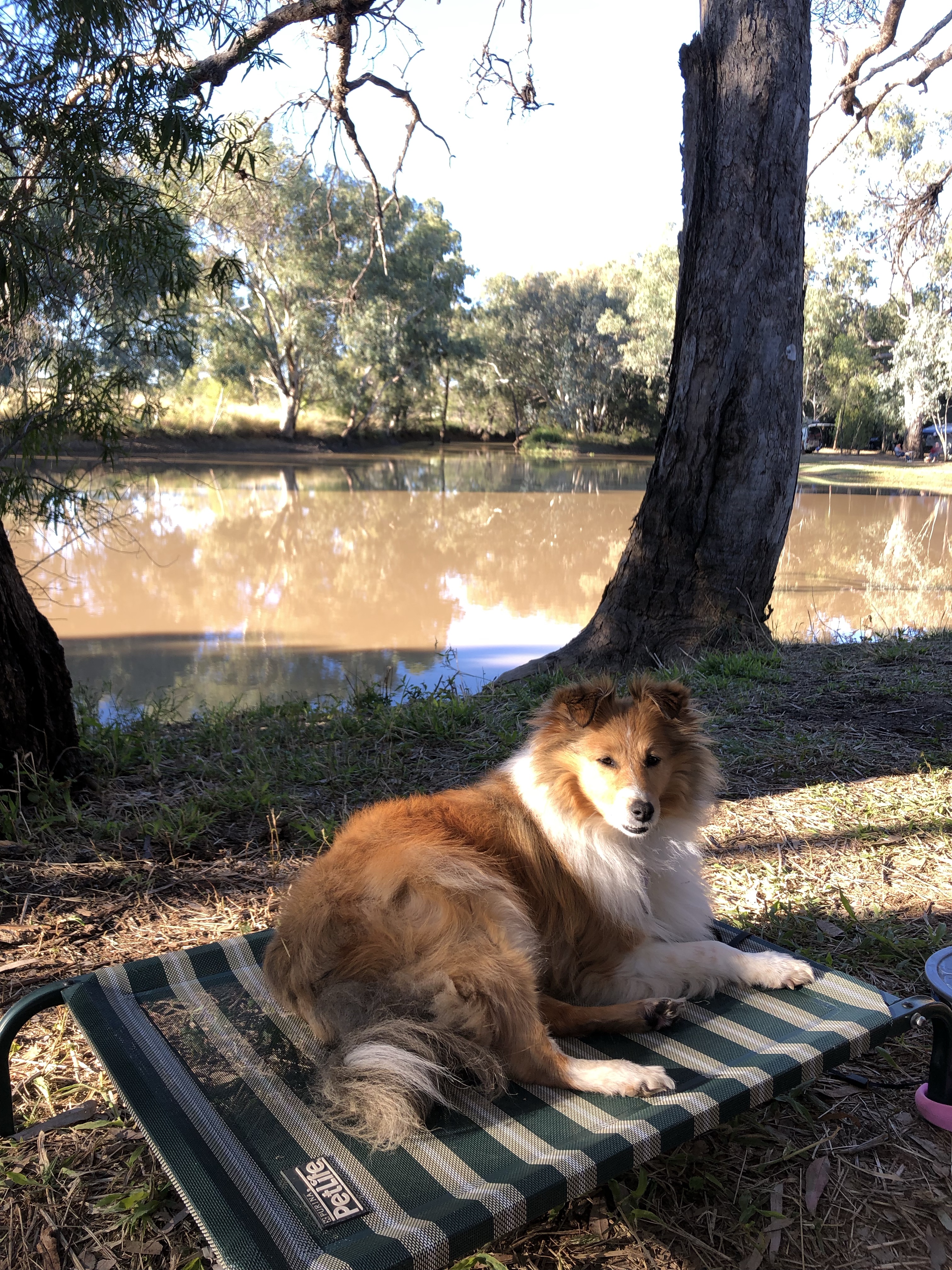 Finally it was time to farewell old Don and the others who made us so welcome at Anakie. The next camp on Norm’s itinerary is only 180 klms up the Capricorn Highway at the Redbank Park in the town of Jericho. We have a perfect spot beside the river and all is well. Norm is preparing the campfire and Rosie and I are enjoying the last rays of the sun.