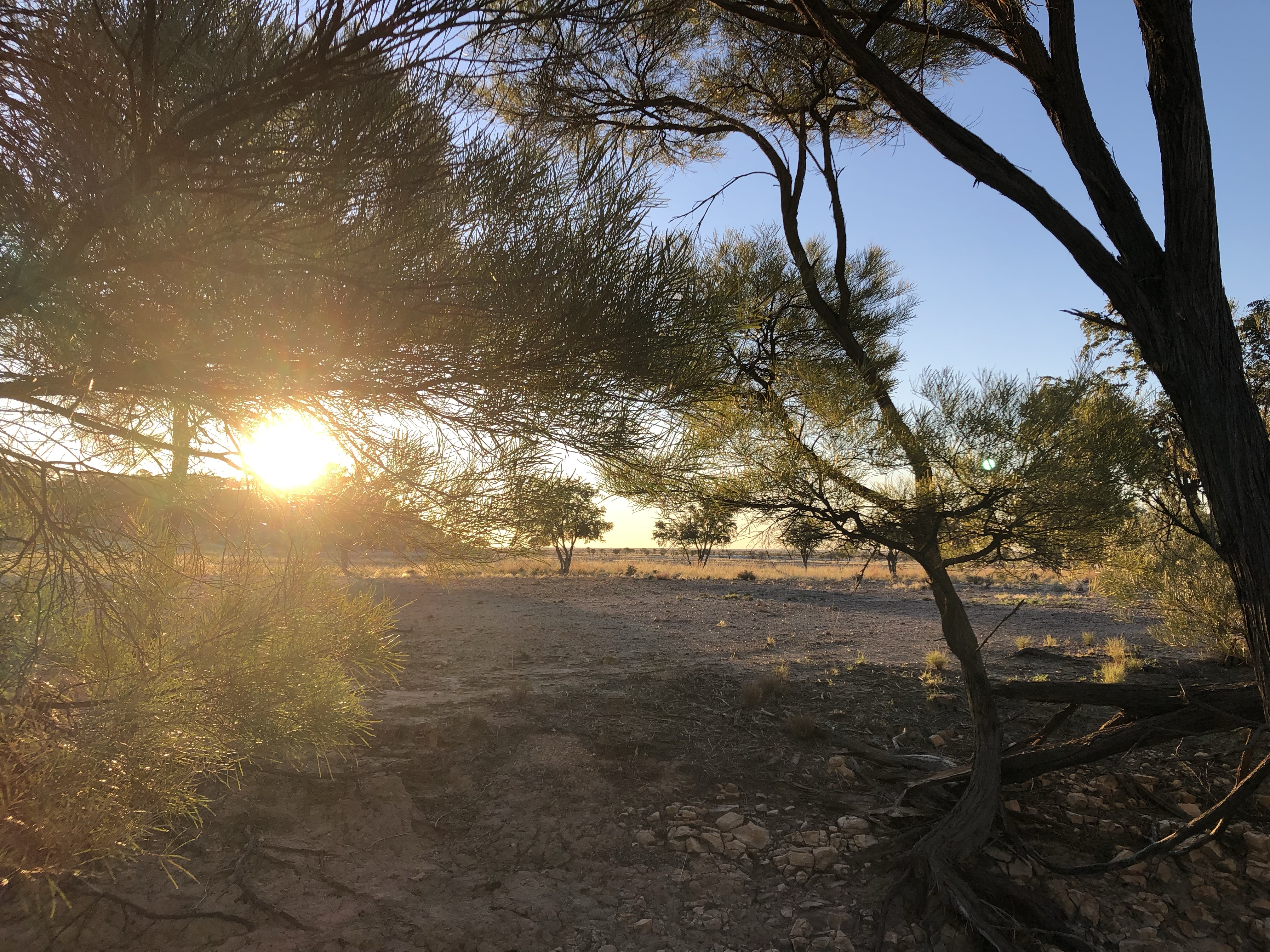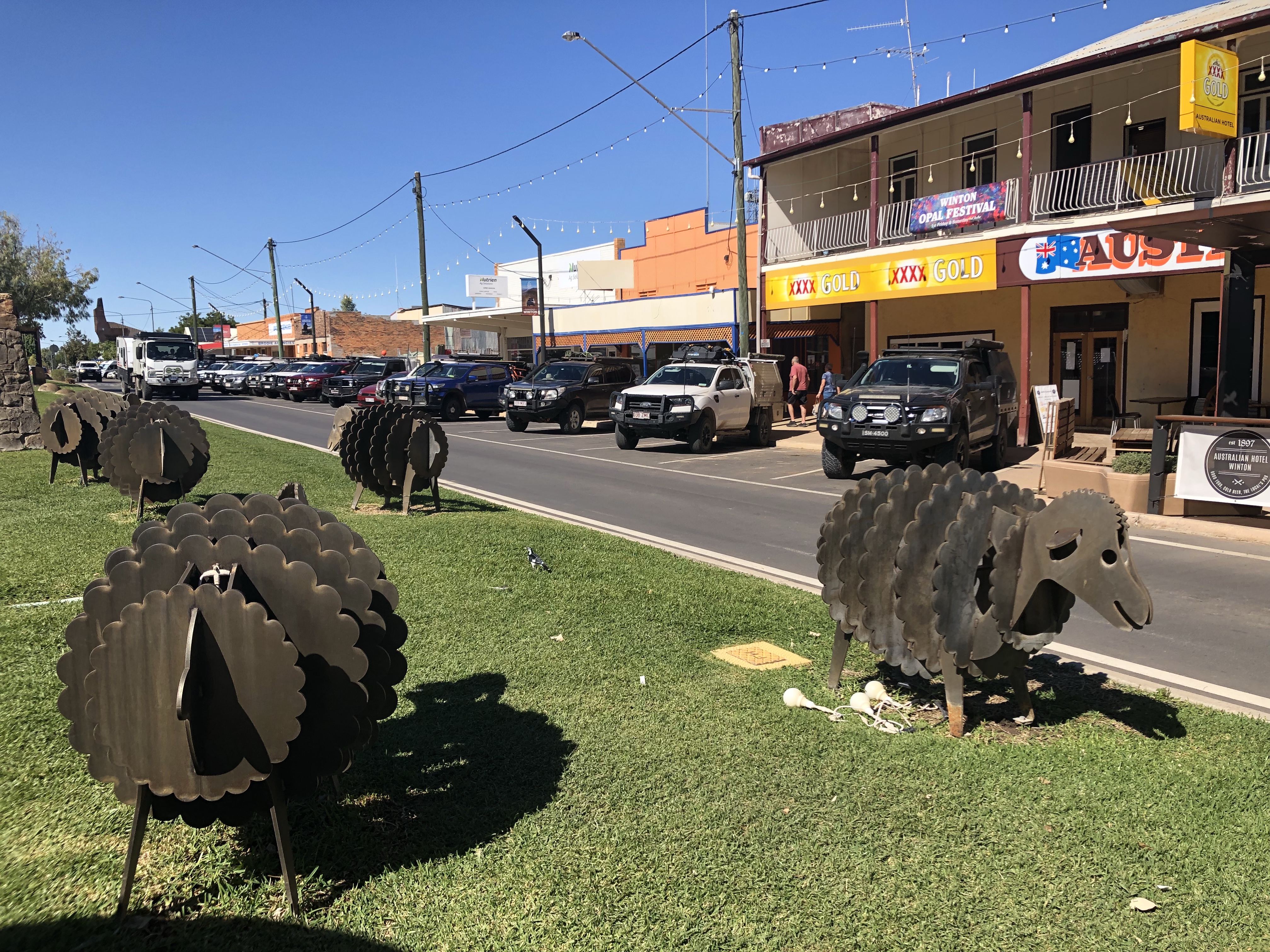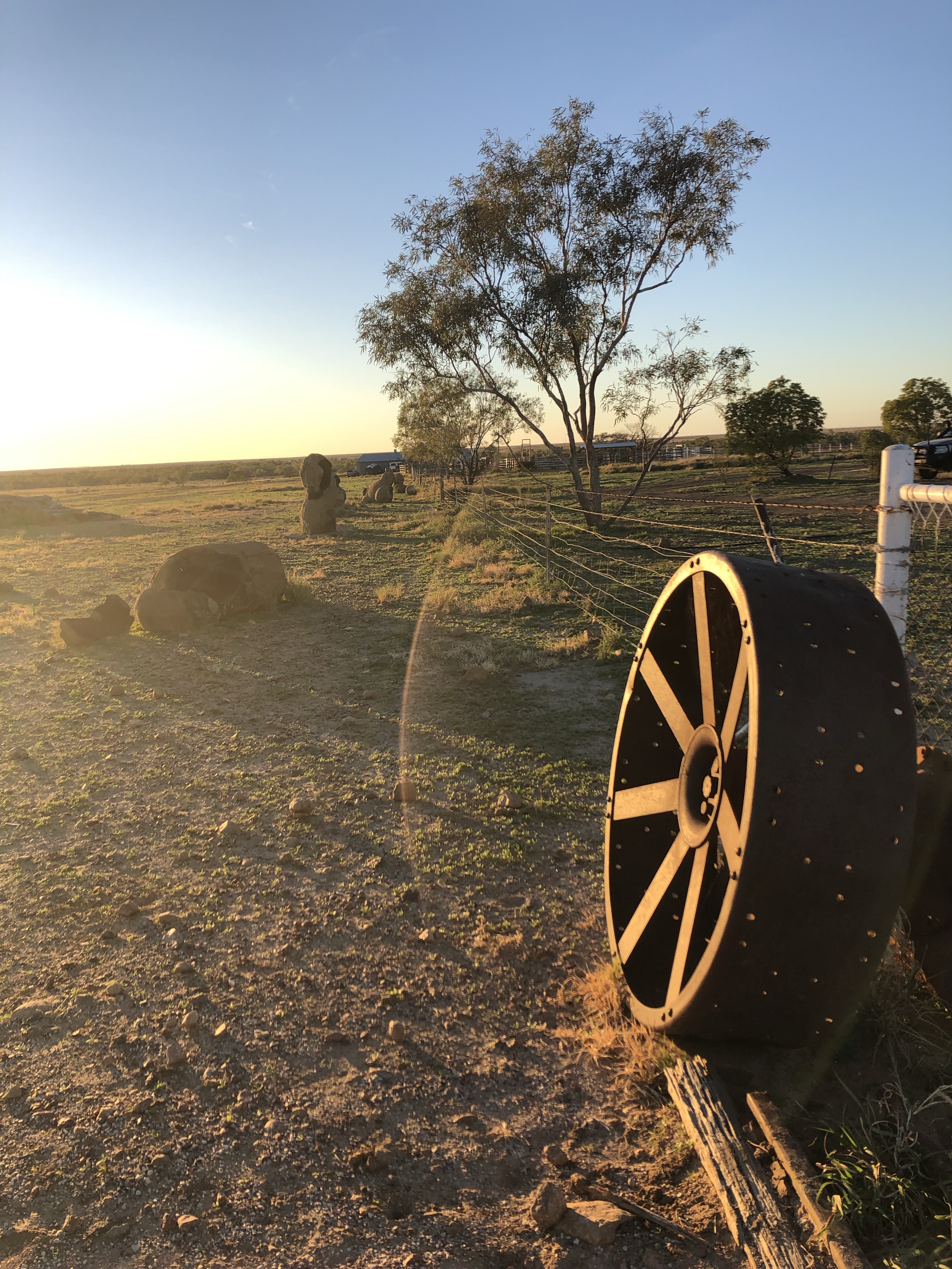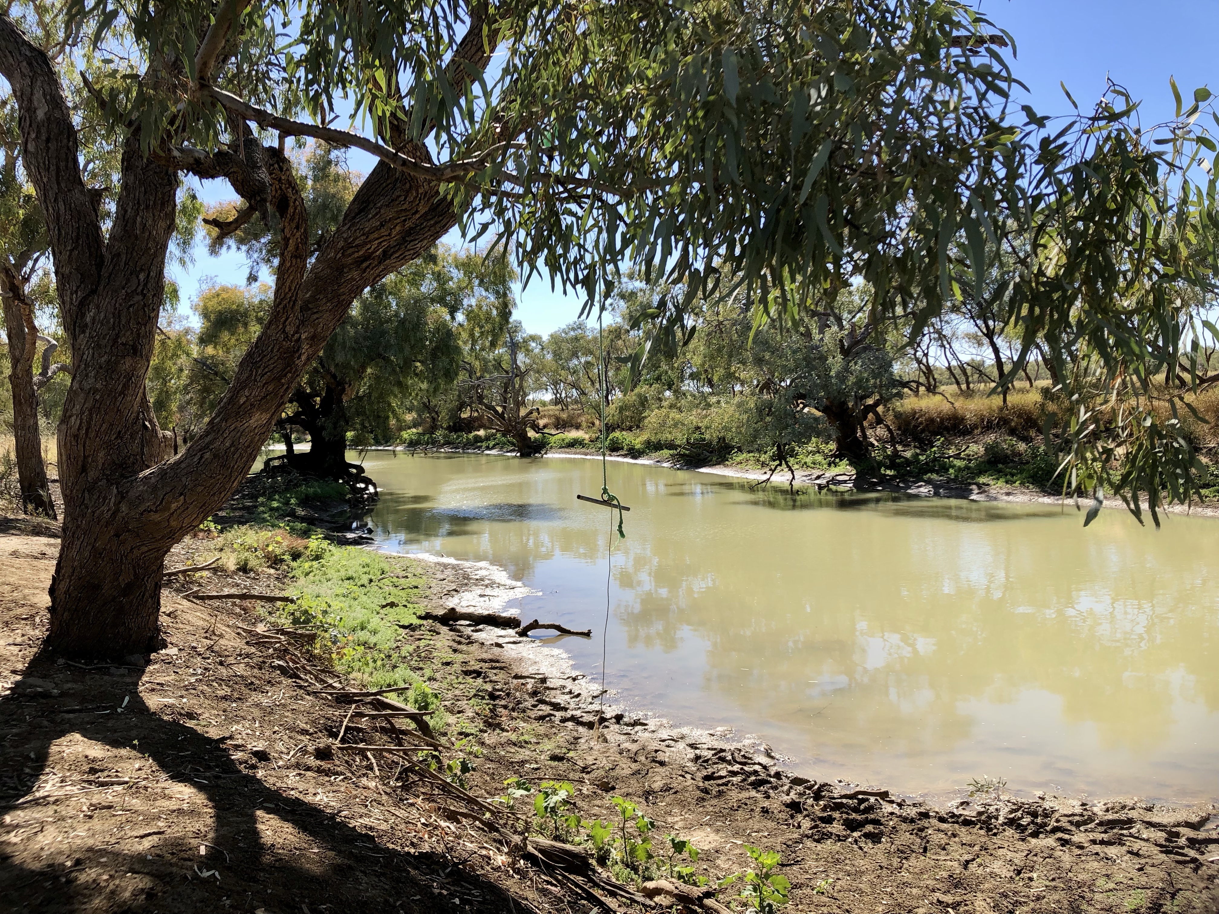 We drove into Winton via the station road today. It took us past the local waterhole with the usual swing hanging from one of the trees. There were flocks of budgerigars in the trees, singing loudly. From there we drove though several huge, flat, yellow paddocks with a few cattle and sheep.
