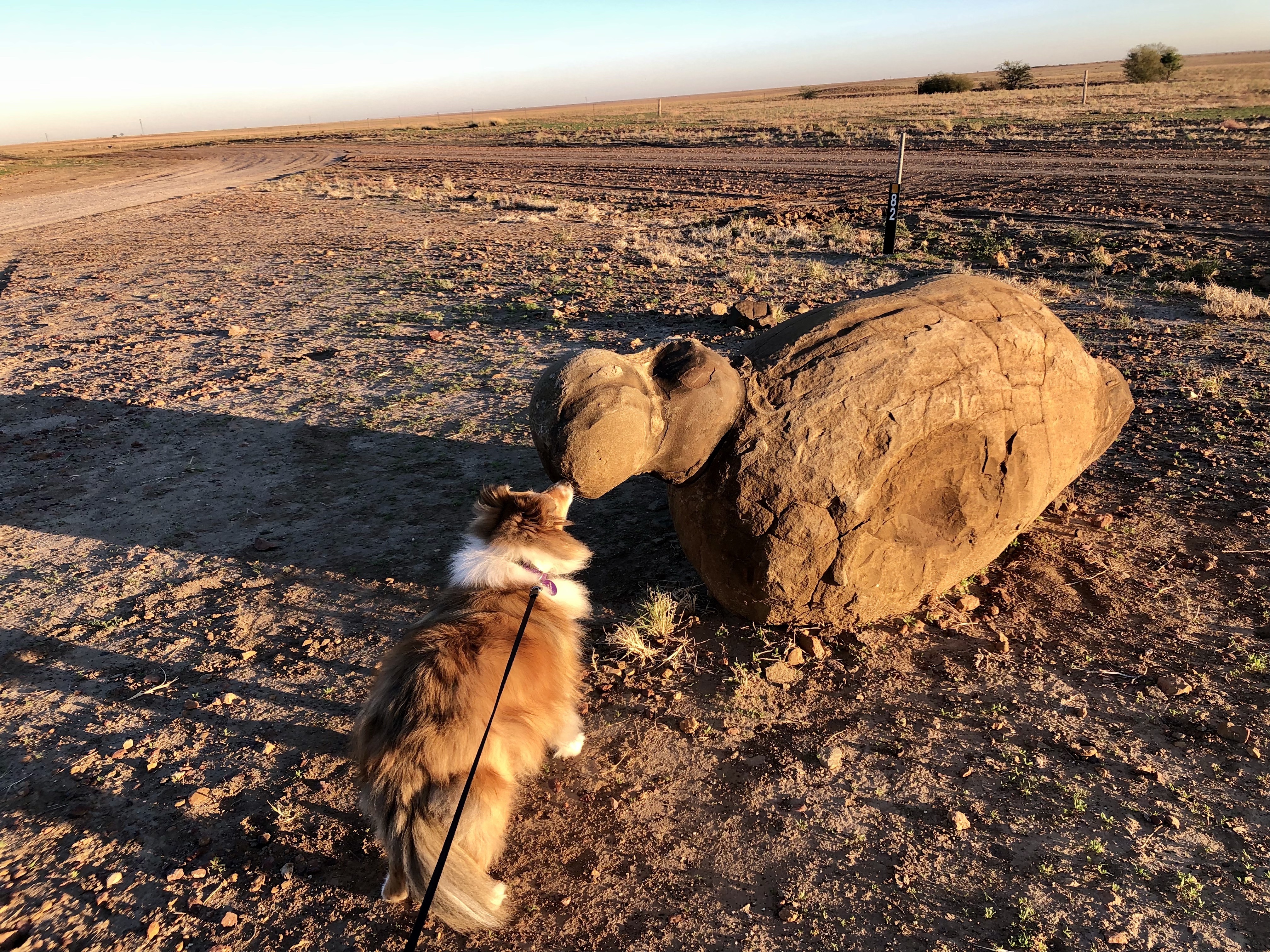 Rosie made an interesting new friend on our early morning walk as the sun rose.