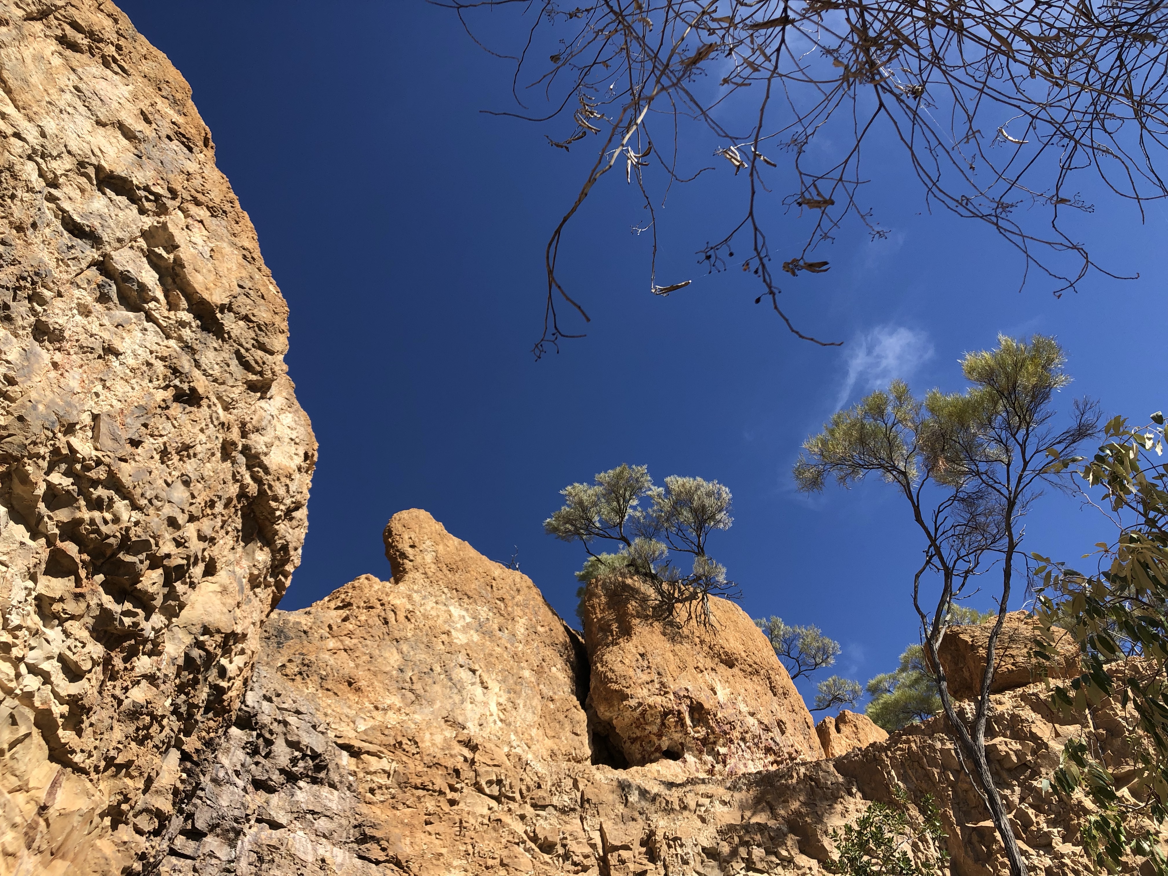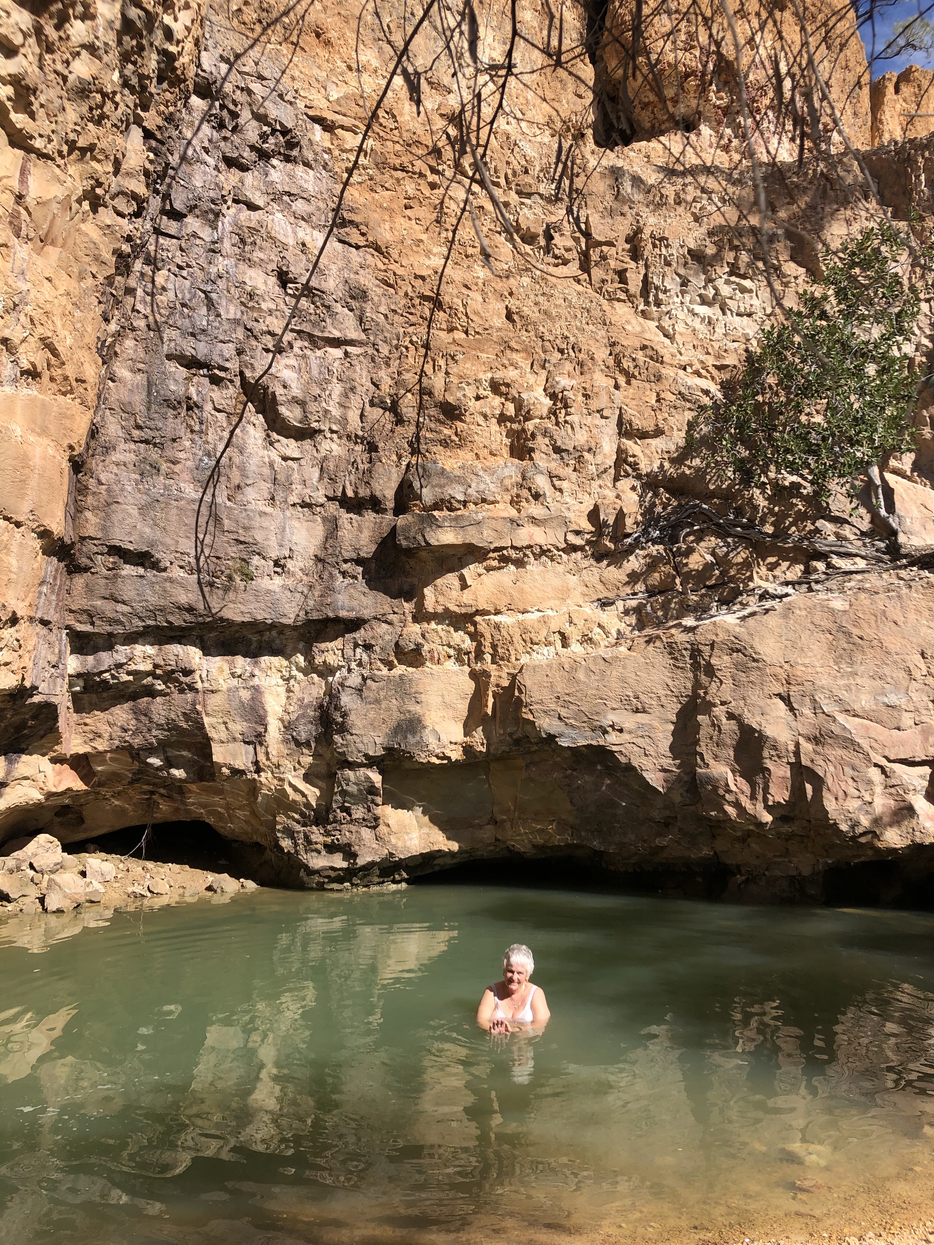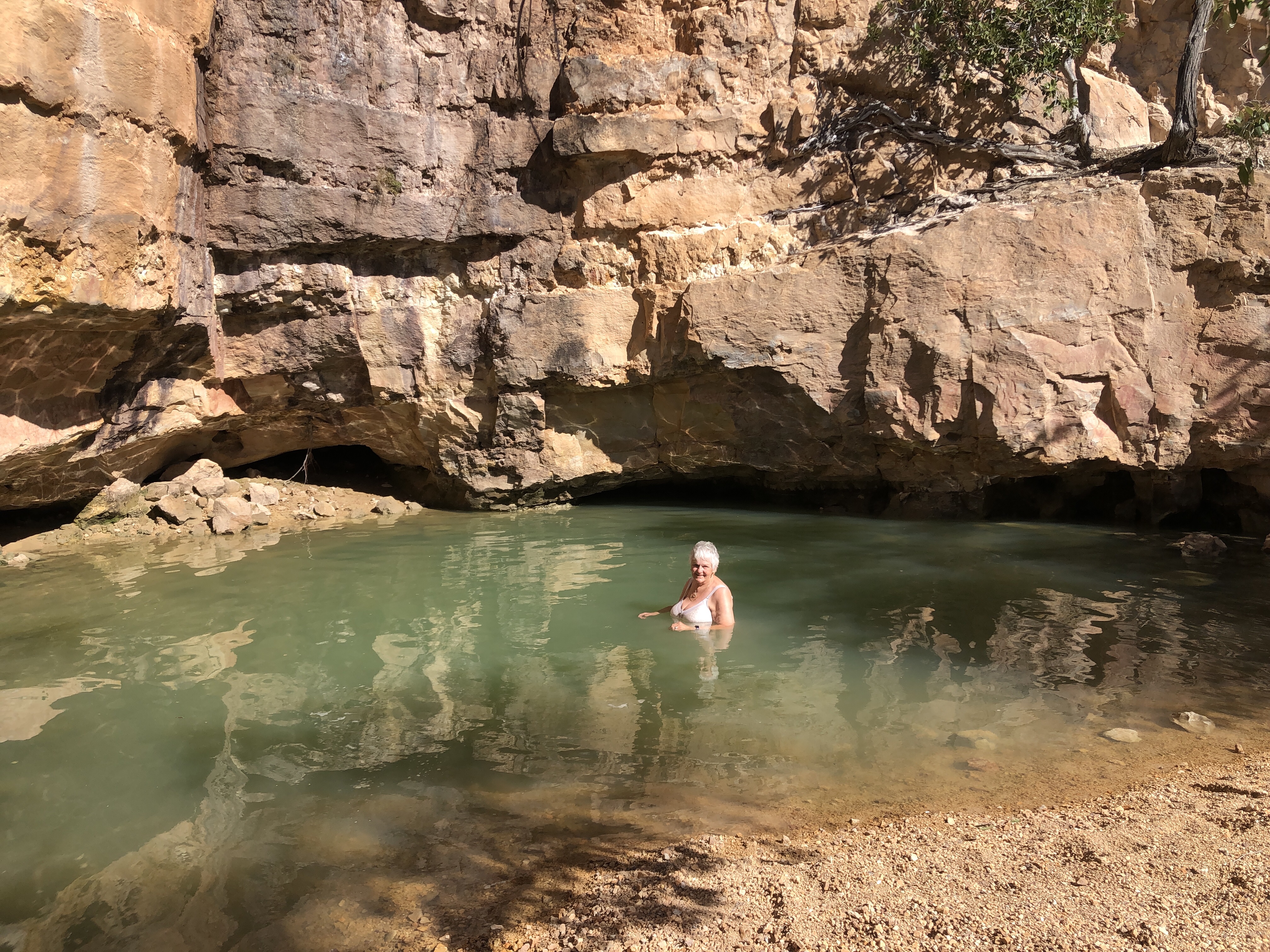 After farewelling our friends at Oodnooroo we returned again to Winton and took the Landsborough Highway towards Cloncurry. Norm planned a short trip today of less than 80 klms to the free camp at a fascinating site near where the Guwa aboriginal people have left marks on the stone walls. There are eye catching red and cream weathered mesas and deep ochre coloured cliffs around the deep pool at their base. I enjoyed a short refreshing dip in the cool water.