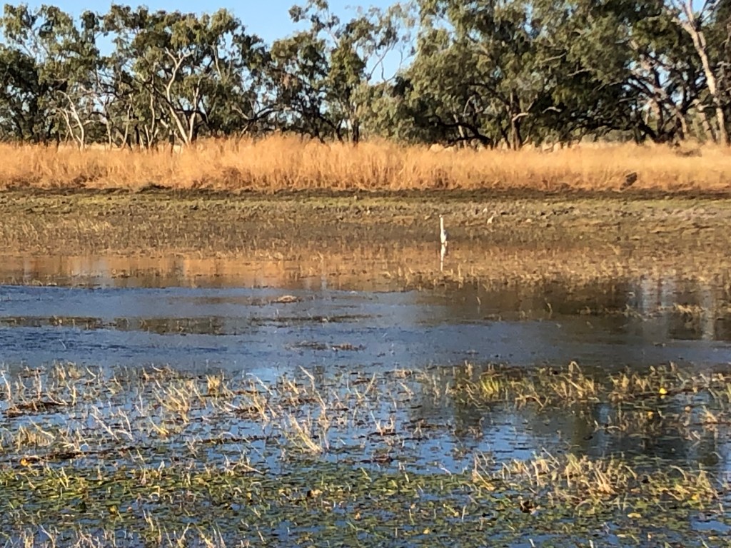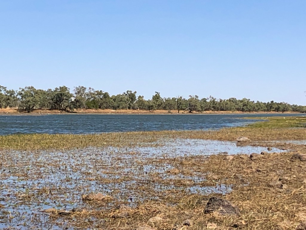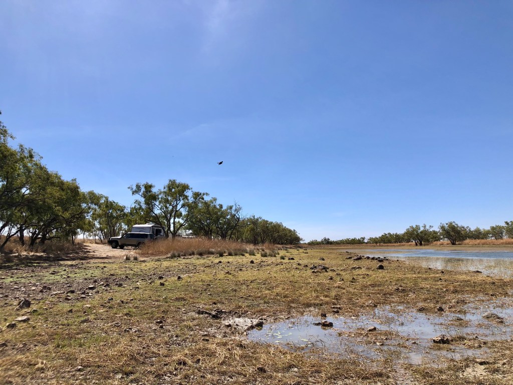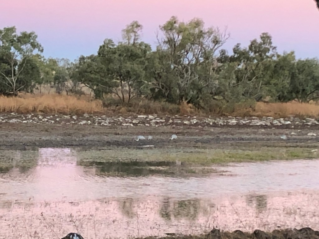 We followed the Barkly Highway from Mt Isa to Camooweal, which is a very small settlement. The sign at the edge of town boasted a population of 310 people. Nearly all the business in the main street of town are closed, with the exception of the pub, which has a caravan park in the back yard; the post office/general store, two service stations and the Drover’s Camp Museum. We crossed the huge bridge over the Georgina River, and turned into dirt track on the other side, leading to the three free campsites: Drover’s Camp, Lake Francis and Lake Canellan. Even though it was relatively early, 11.30 am, Whist we counted about 100 vans and trailers already in residence along the way. We selected the same spot we camped in last time, at the beginning of Lake Canellan, and down near the water.