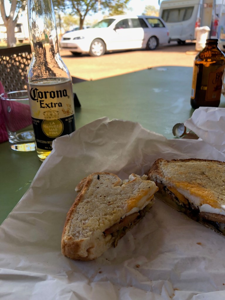 It was lunch time when we reached the Barkly Homestead, so we shouted ourselves to a Barkly Burger before we drove on to the free camp at the Mile 41 Bore. We set up a nice camp, although the wind was rather strong. After our big lunch we settled for poached eggs for dinner.