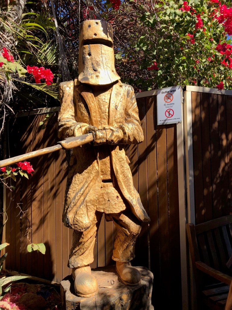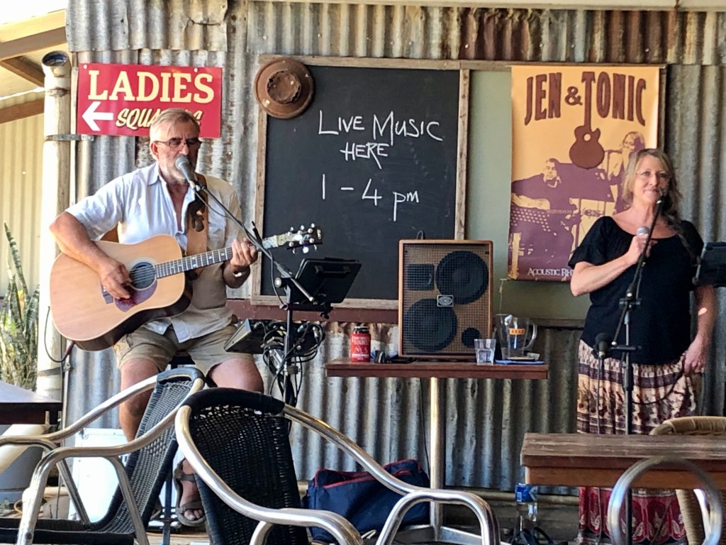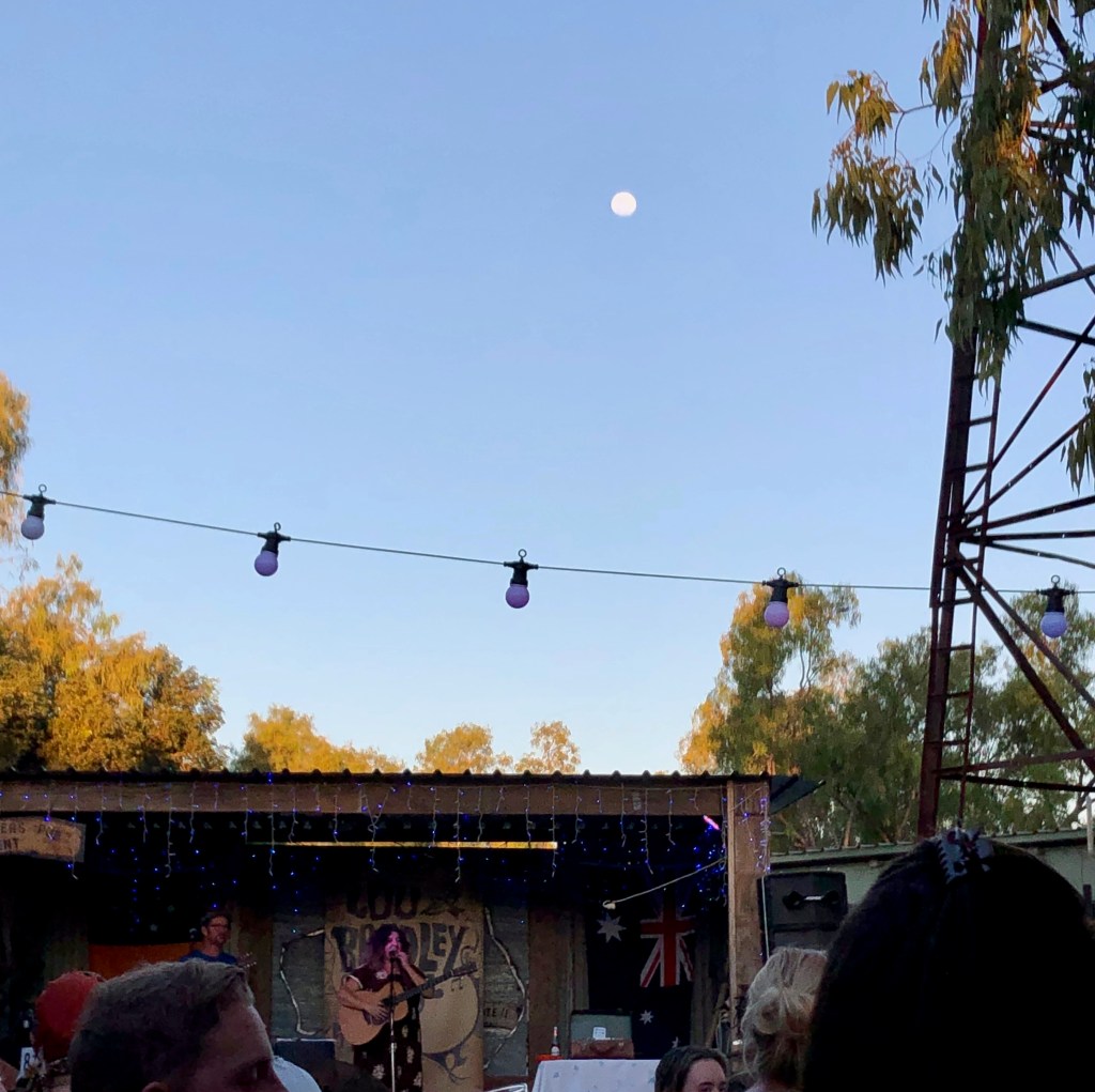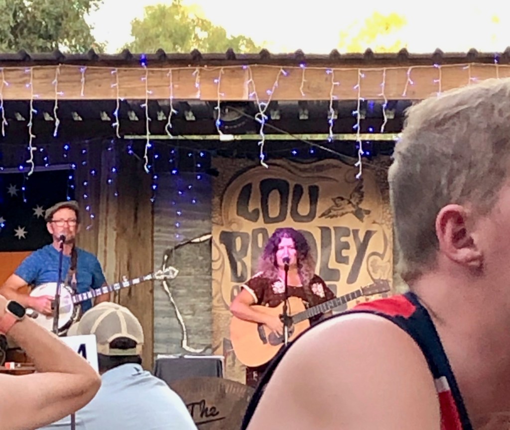 The second band to entertain us for the evening was one that we had seen here before, Lou & Phill – a great couple of talented performers. We were back in the ‘Beer Garden’ when they took up the stage at 5pm, and remained there for the evening as the near full moon rose and the coloured lights came on. Our Beef and Barra dinner was as yummy as ever, and Norm even managed to save a few morsels for Rosie.