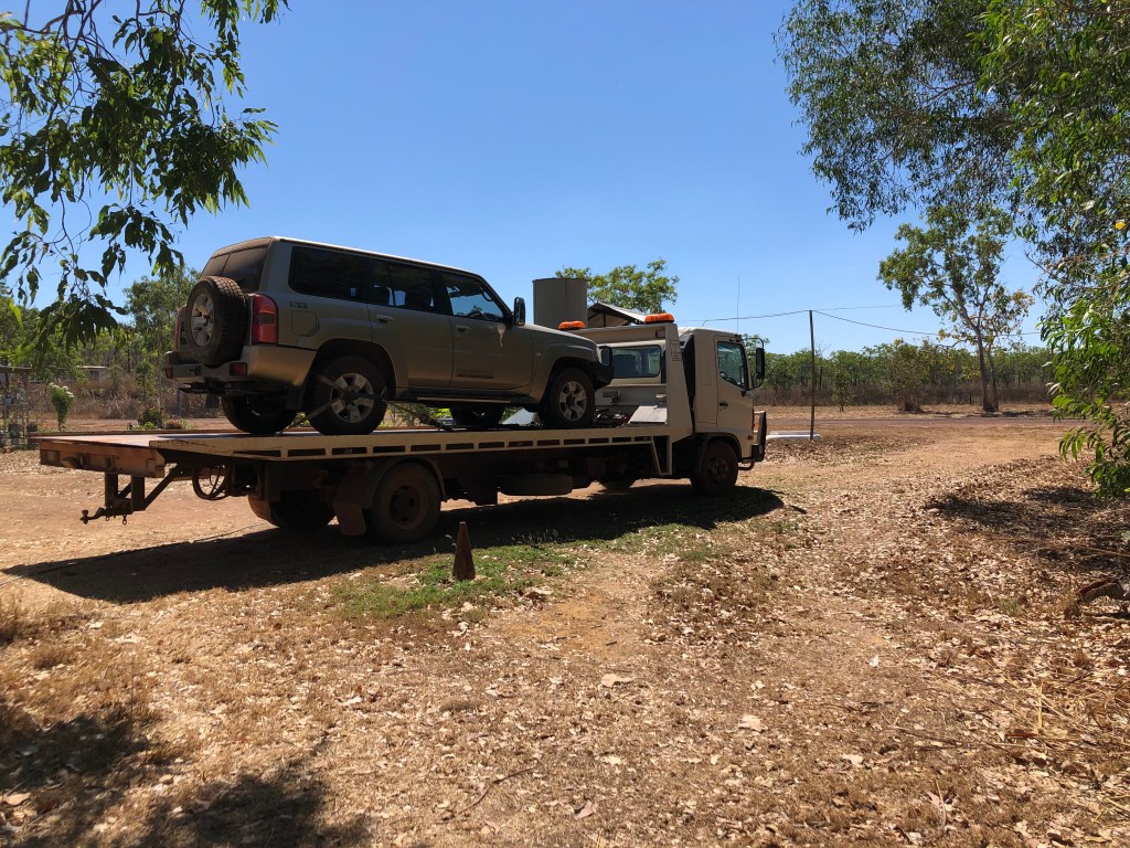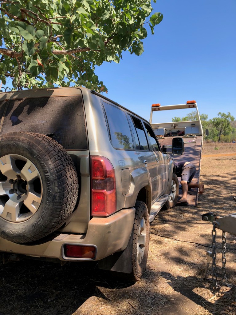 The wonderful Andrew from Adelaide River arrived on Monday afternoon with his flat top truck. Linus was winched upon the bed of the truck and whisked up to Darwin to await treatment by Nissan (at this stage, not before Friday). Norm travelled up in the truck to pick up our hire vehicle, courtesy of our NRMA membership.