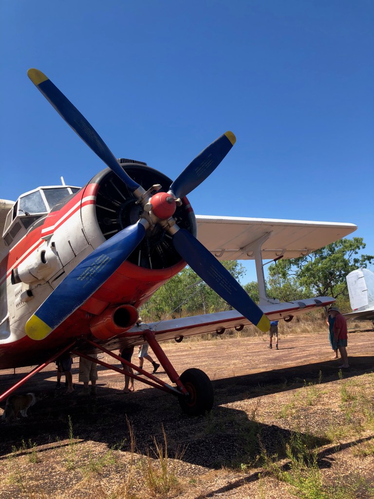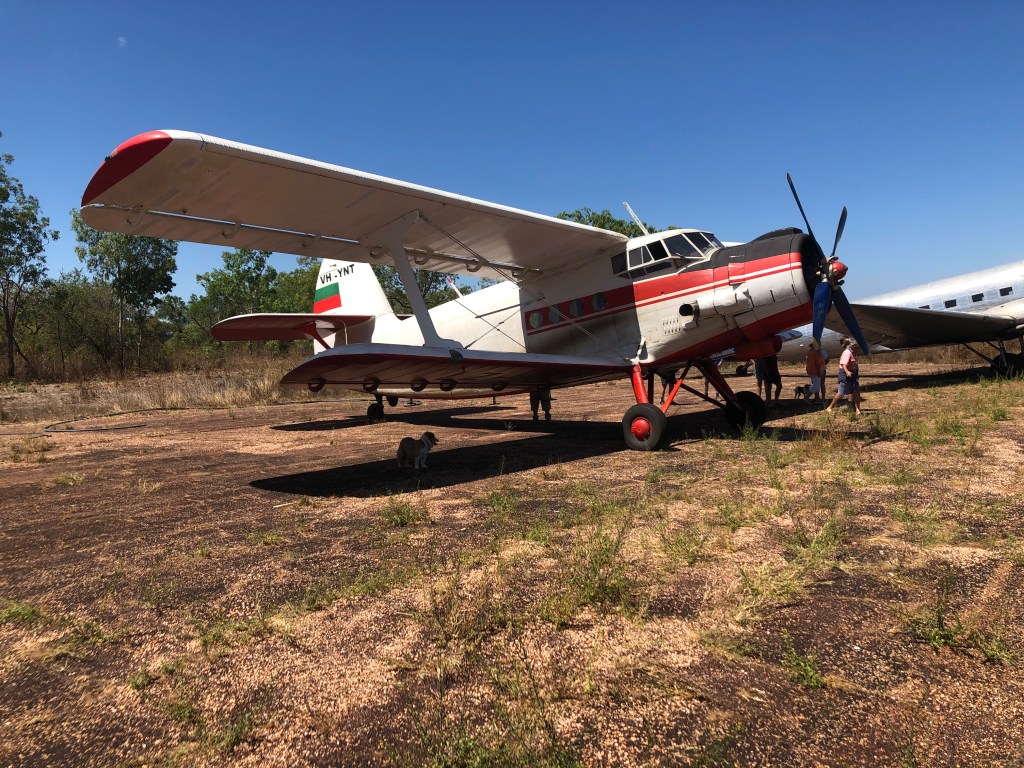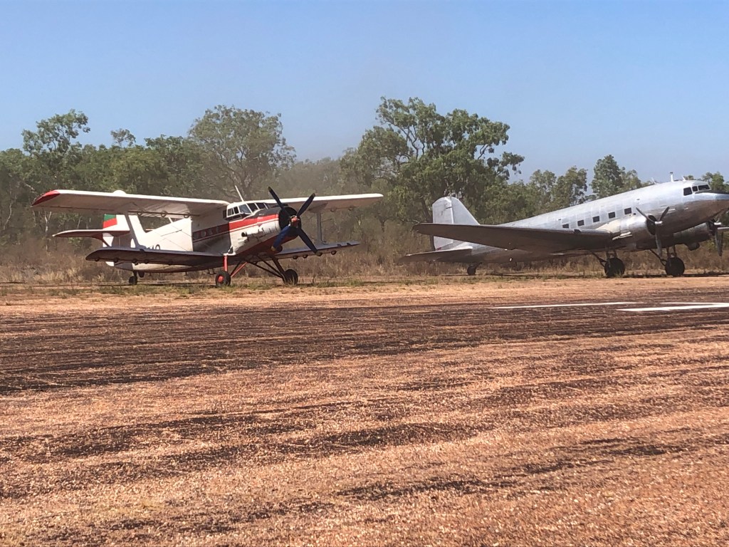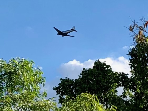 However we were all waiting in great anticipation to welcome the mighty Douglas DC3, expected to arrive at about 5pm. Slowly the waiting crowd began to realise the low deep hum of the engines heralded the approach of the lovely old plane. And then she was rolling up the tarmac towards us. Several of the jeeps parked infront of her as a guard of honour.