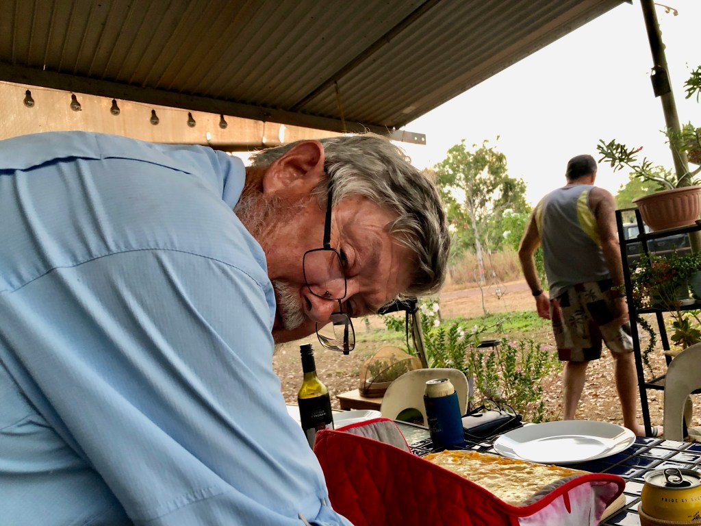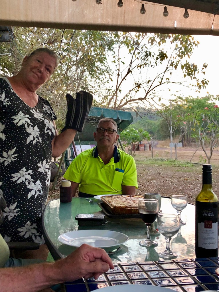 The Kerry Nissan work shop co-ordinator rang us in the afternoon to tell us that LINUS was finally repaired and ready for pick up. Because of the COVID restrictions all we could do was cheer and wait for the news that we could once again enter Darwin. We remaining Coomalie Family members, Denise, James, Richard, Nikki, Barrie, Norm and I gathered together in the evening to share a delicious master chef cook off, of 2 Cottage Pies, created by Norm and Denise.