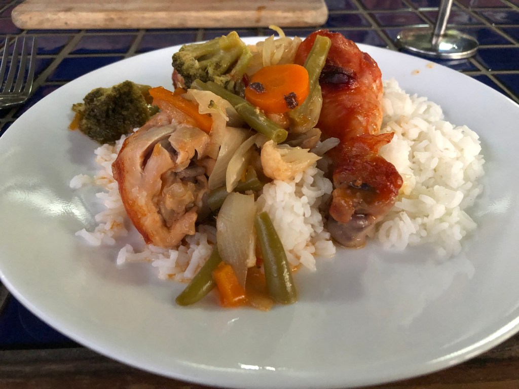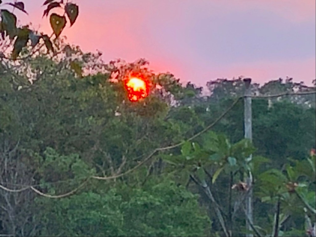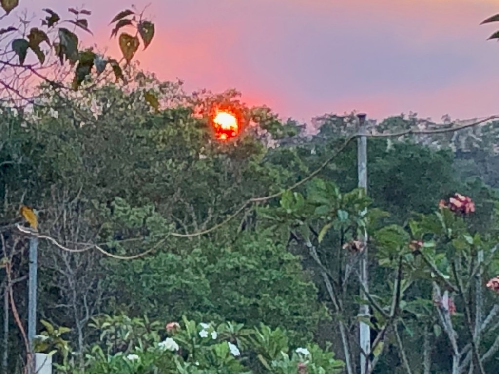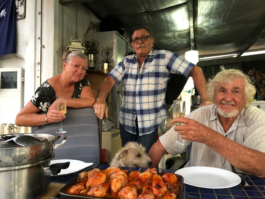 As the sun set in a red smokey glow from the nearby Batchelor bushfires, and the nearly full moon rose, we gathered together to share a delicious meal of sweet & sour chicken drumsticks served on a bed of rice prepared by James.
