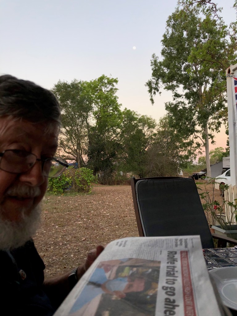 After a great night together, we hopped into Linus to drive home. GUESS WHAT – she would not start. It was the same problem that we experienced two weeks ago and that the experts at Kerry Nissan in Darwin claimed to have repaired. There we were, broken down, in the dark and more than a walk away from home. James rang Richard, who had already settled down for the night by then. He kindly put on his UBER hat and drove us back to Coomalie.