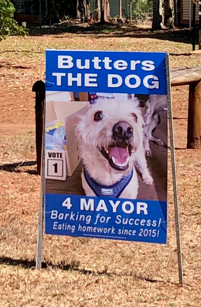 Last Saturday the Local Council elections were held. Unfortunately Norm and I could not vote, although we feel like we have been here long enough now to qualify as locals! One of the Comallie friends, Col Freeman stood for election to the local rural council, so we have watched the proceedings with interest. Of course we wish him well and hope his efforts are successful. I am wondering though, how ‘Bunters the Dog’ will fare.
