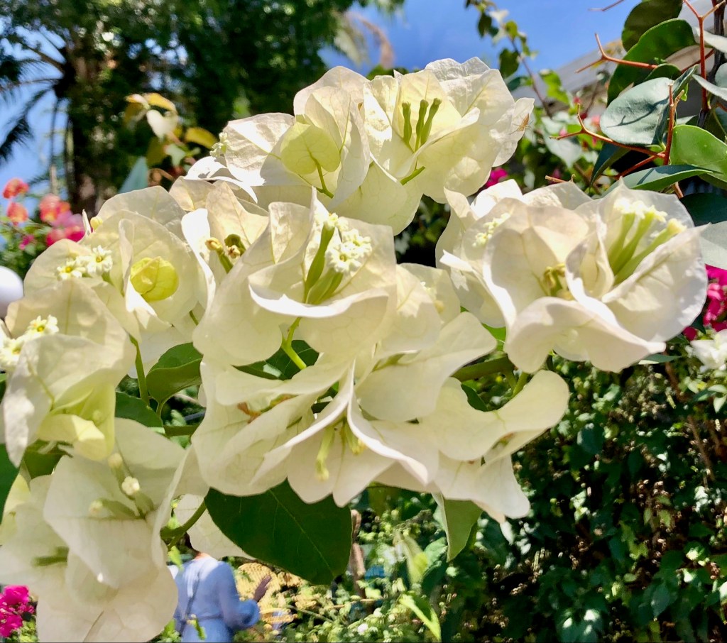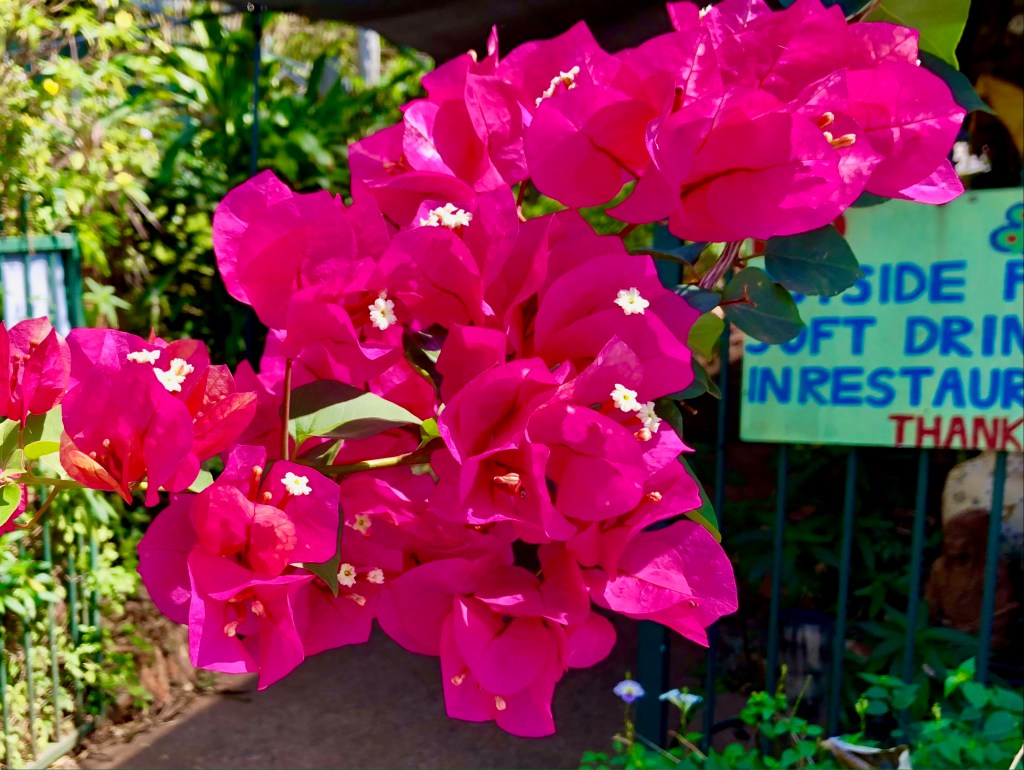 Last Sunday after church, Denise and I joined some of the Church members for a meeting and lunch at the Batchelor Butterfly Farm. I didn’t get to see the butterflies, however the owner, Chris was a very entertaining and eccentric man who entertained us with his banter. The pink and white bougainvillea at the entrance were spectacular.
