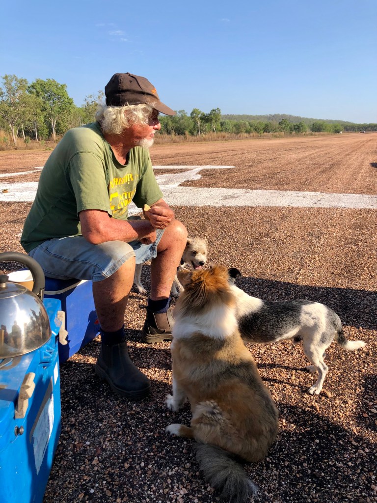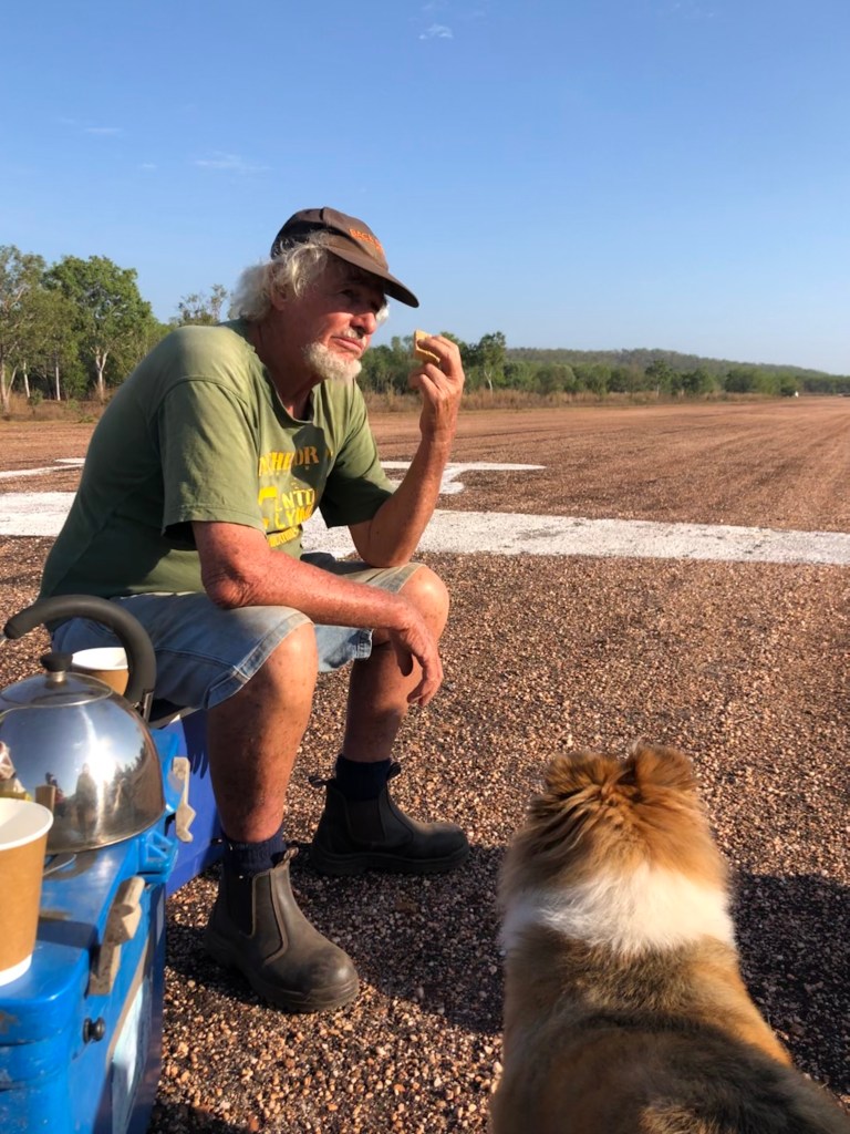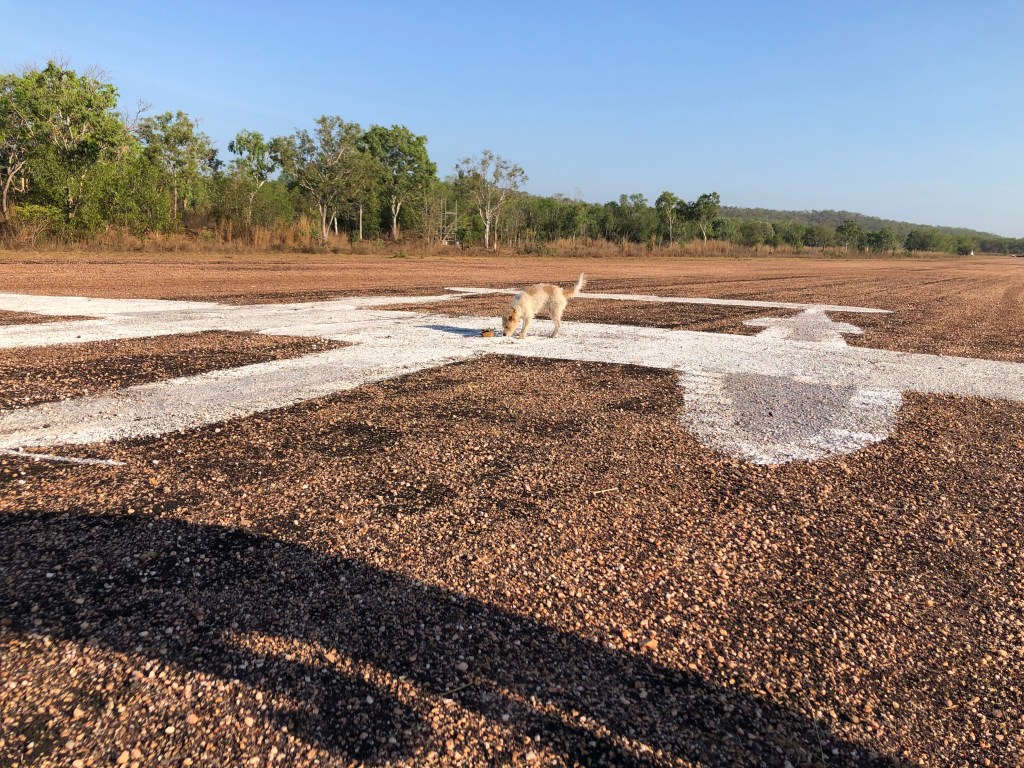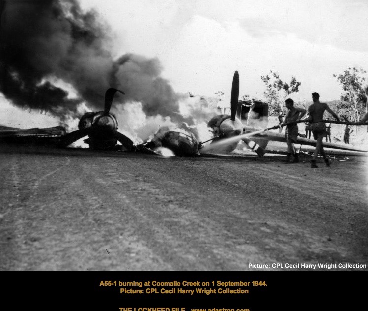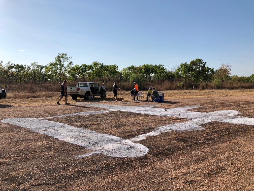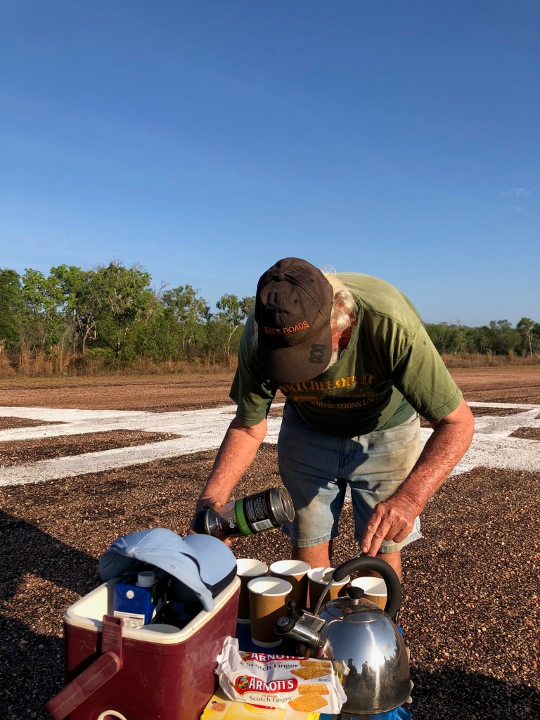 Richard arranged a small memorial gathering today, on the anniversary of the demise of the last Lockheed Lightning plane A55-1, which crashed here at Coomalie and burst into flames when the nose wheel collapsed upon landing. The pilot, Flt/Lt C. J. Rush managed to escape with burns to both arms. We gathered early in the morning, beside the image of a Lockheed some distance down the runway.
