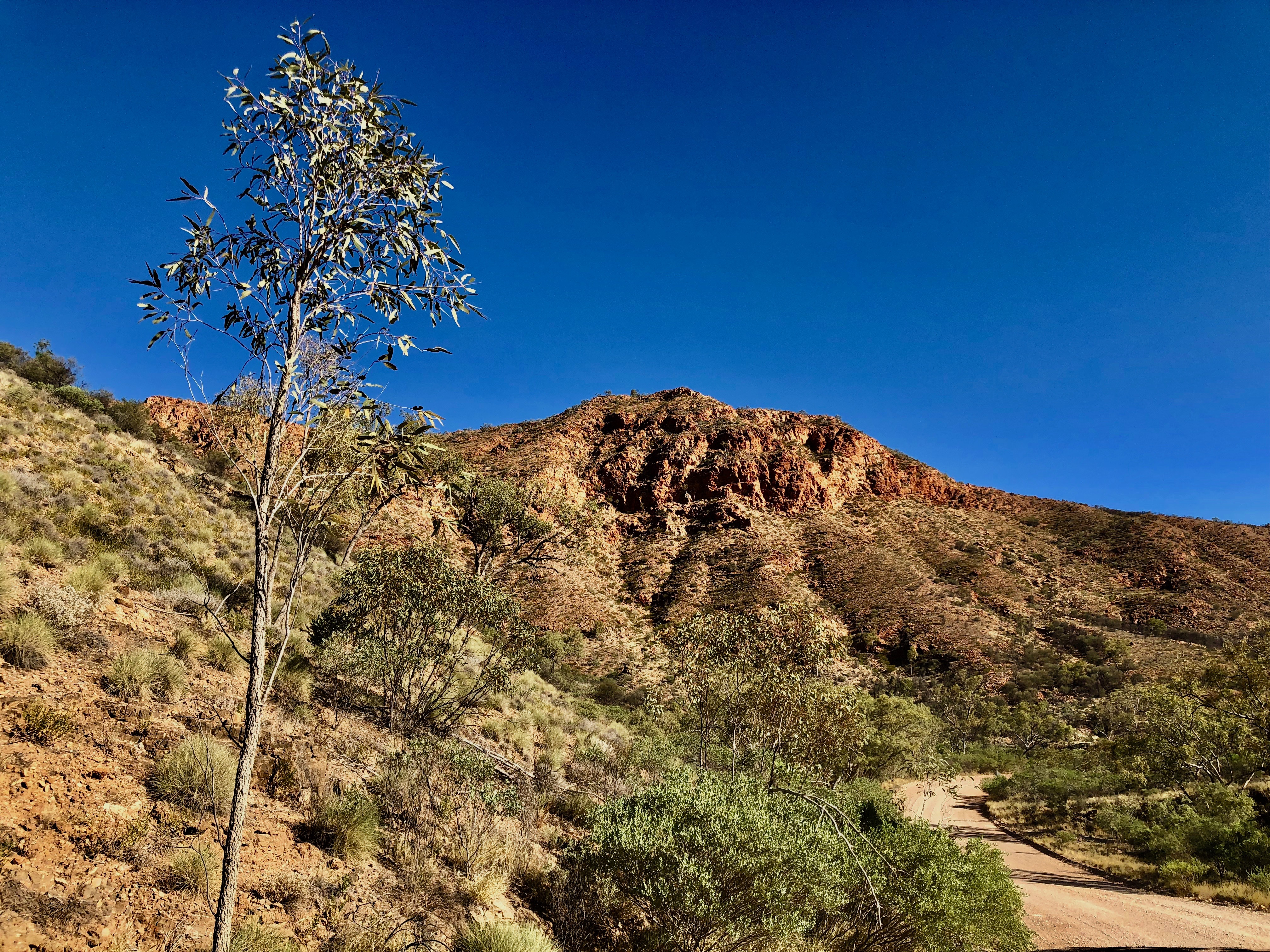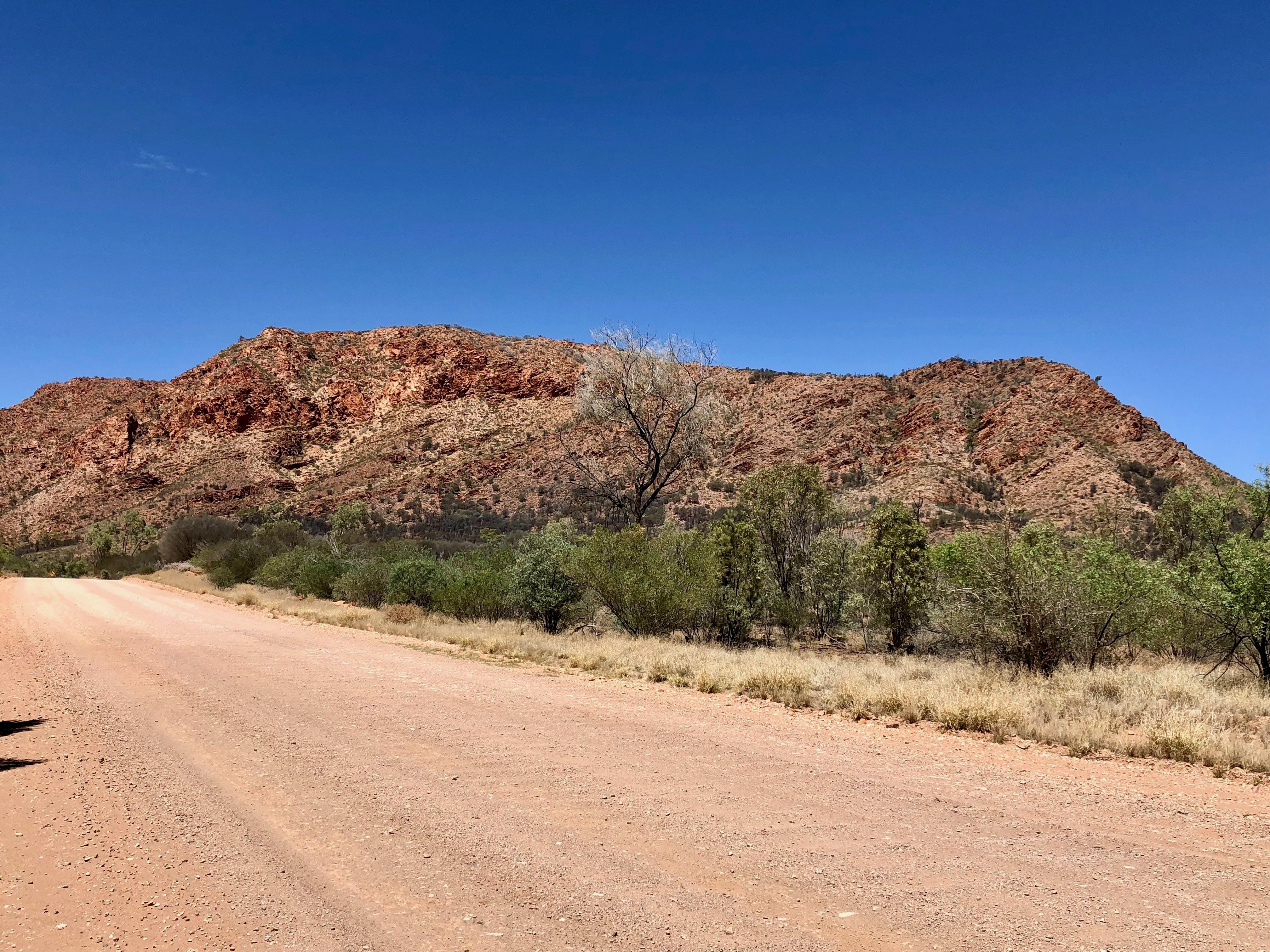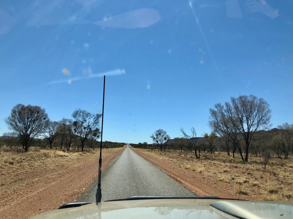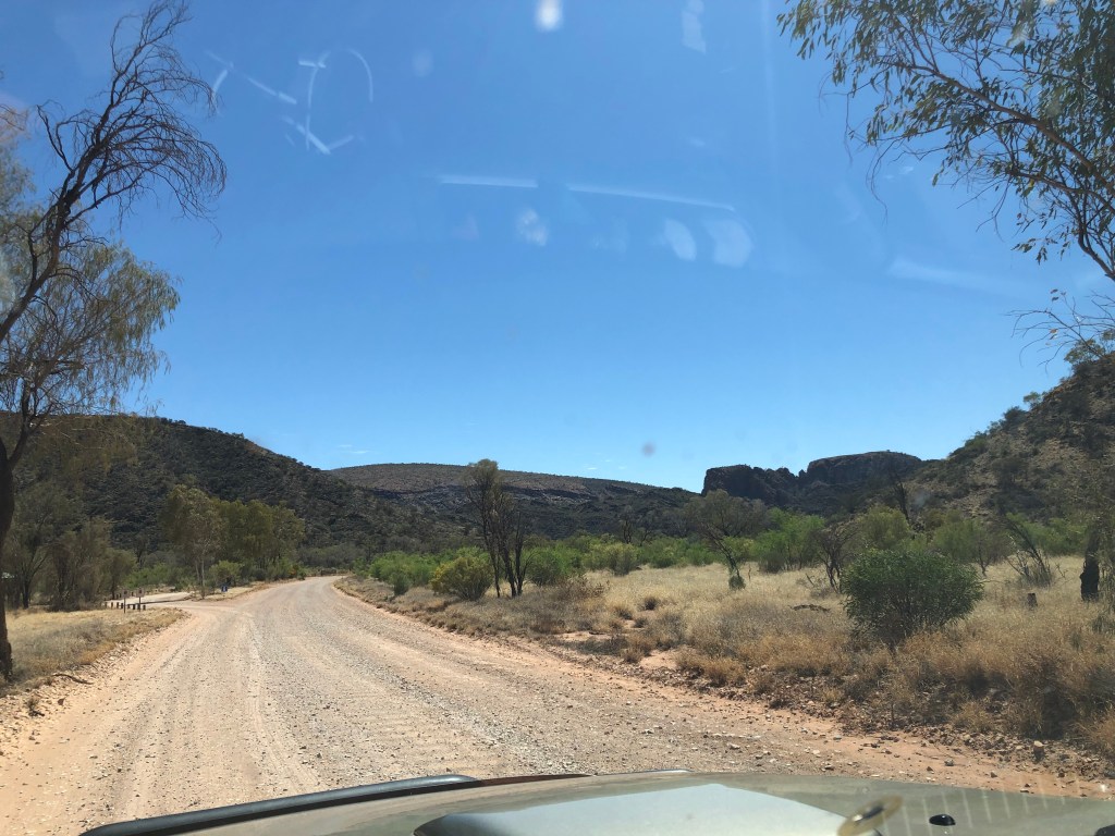 As we drove along the Ross Highway, I found myself feeling overwhelmed by the breathtaking beauty of the deep reds, oranges, pinks and creams that were reflecting from the spectacular, sunlit ranges through which we were driving.