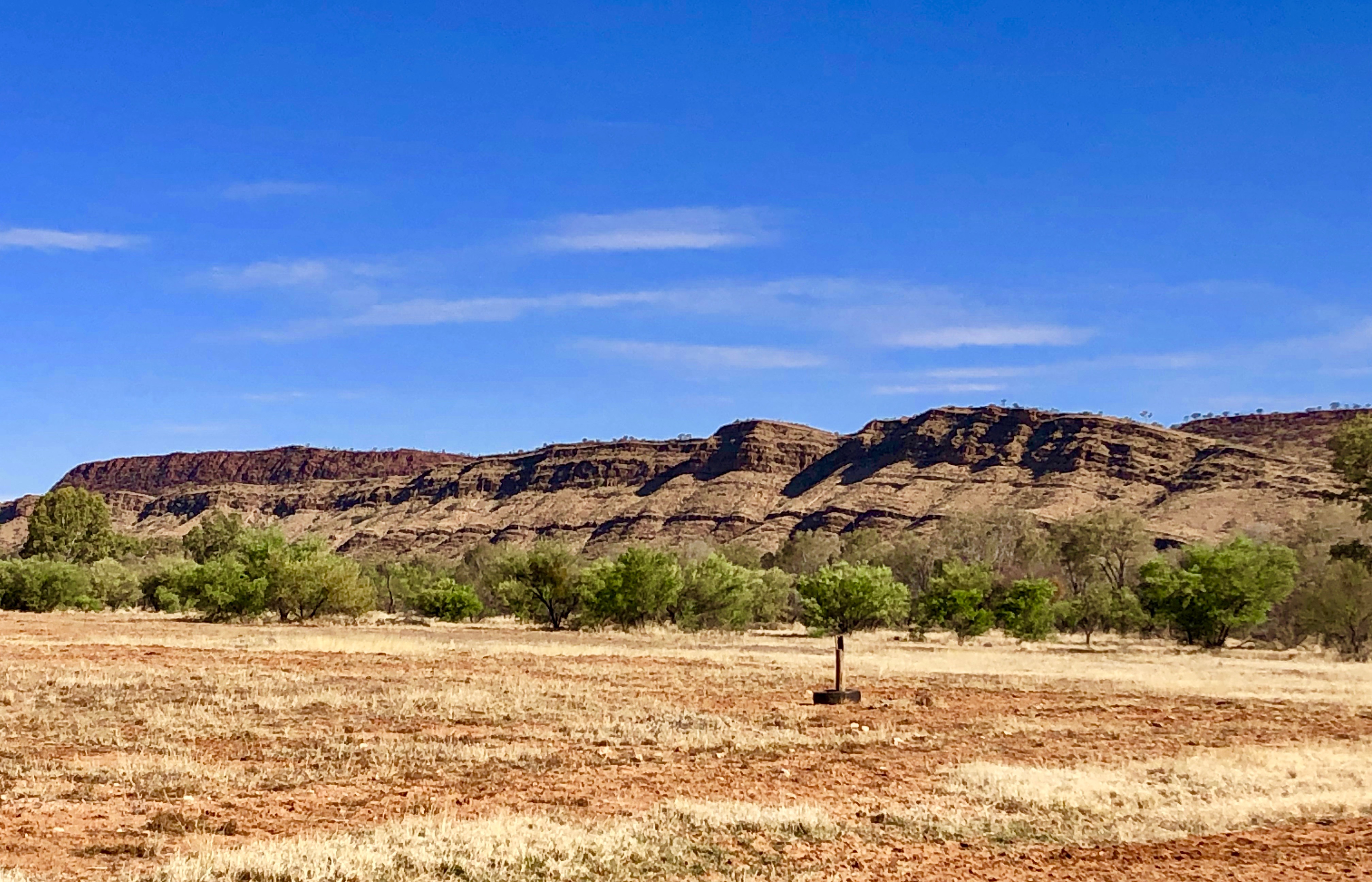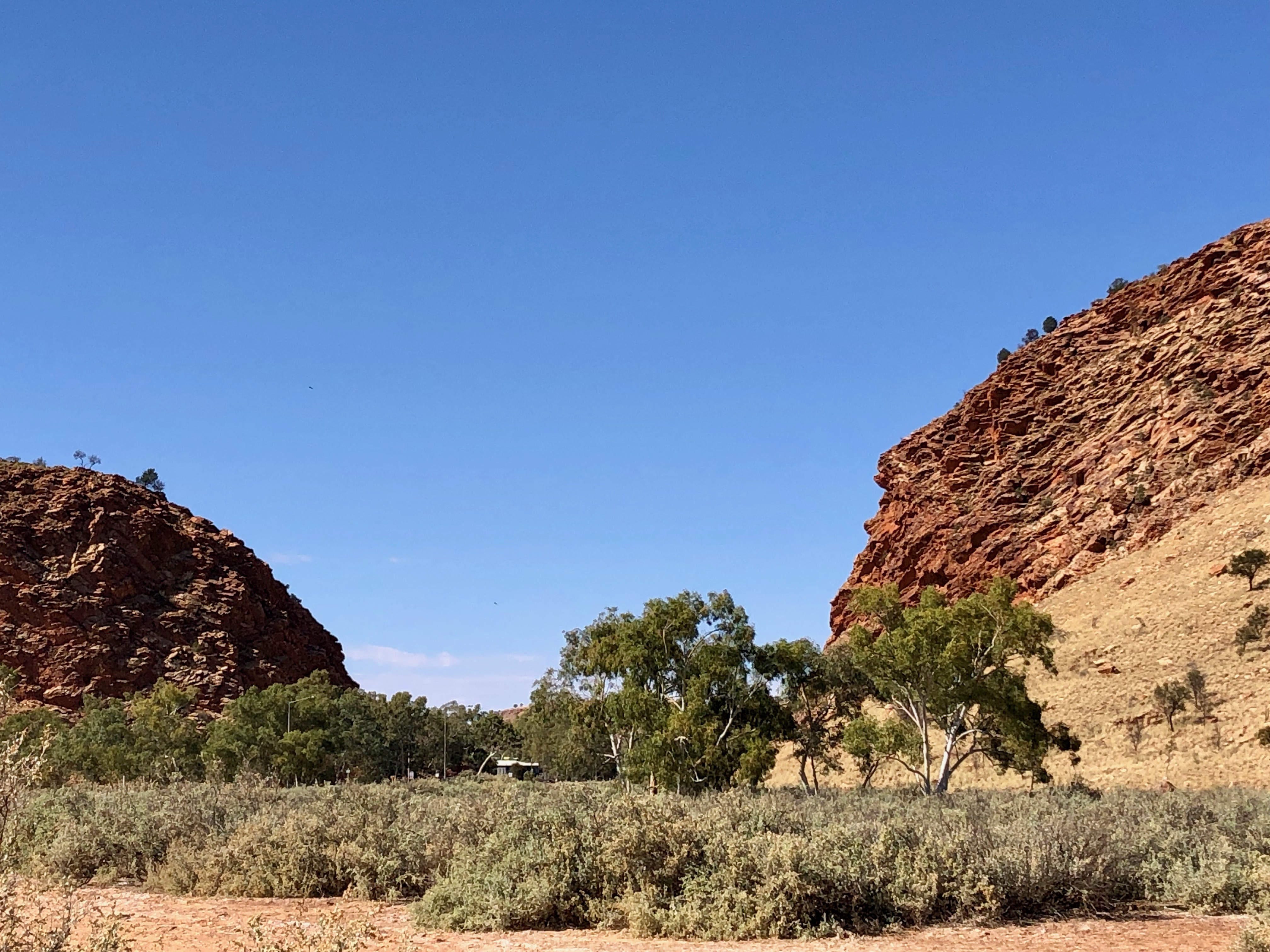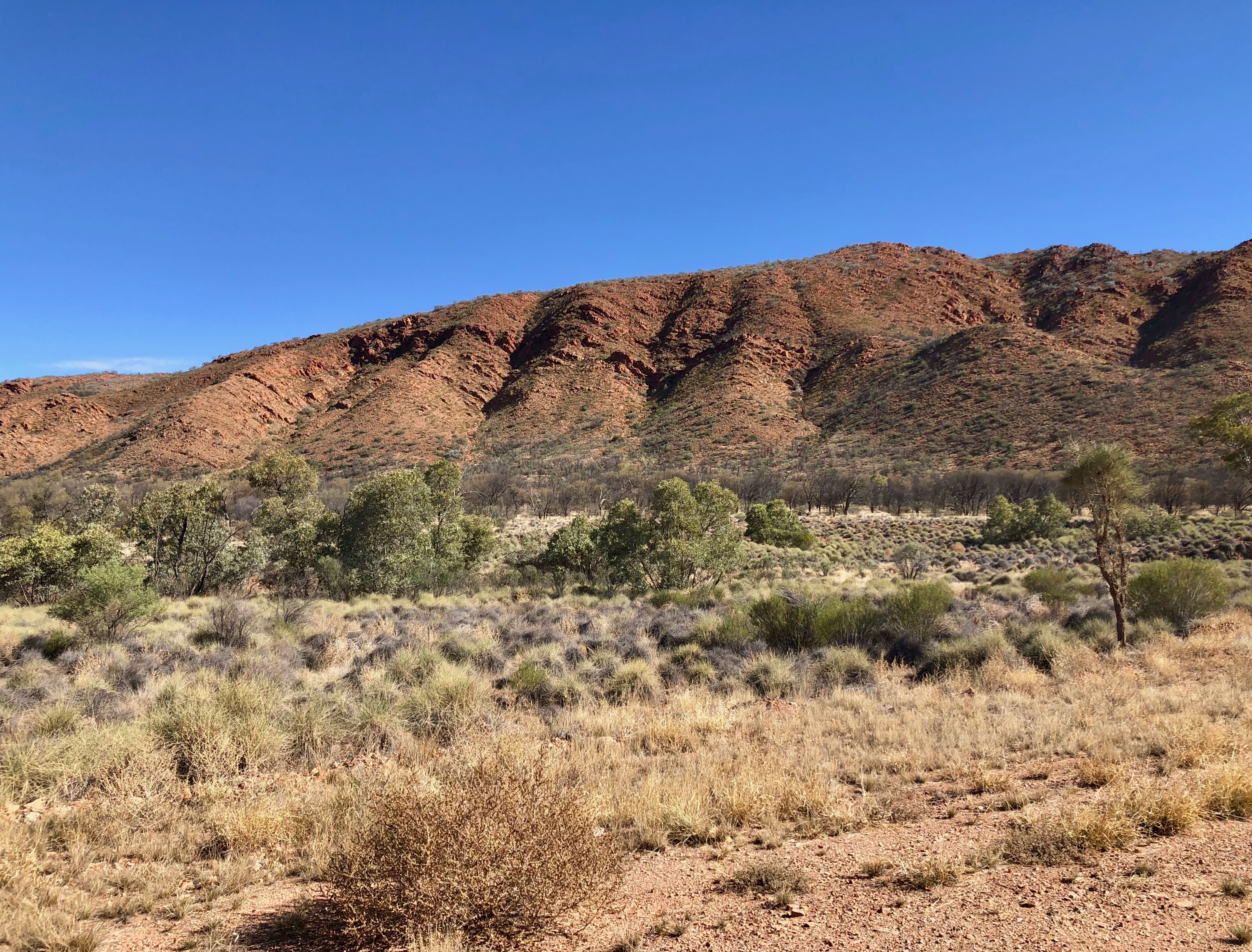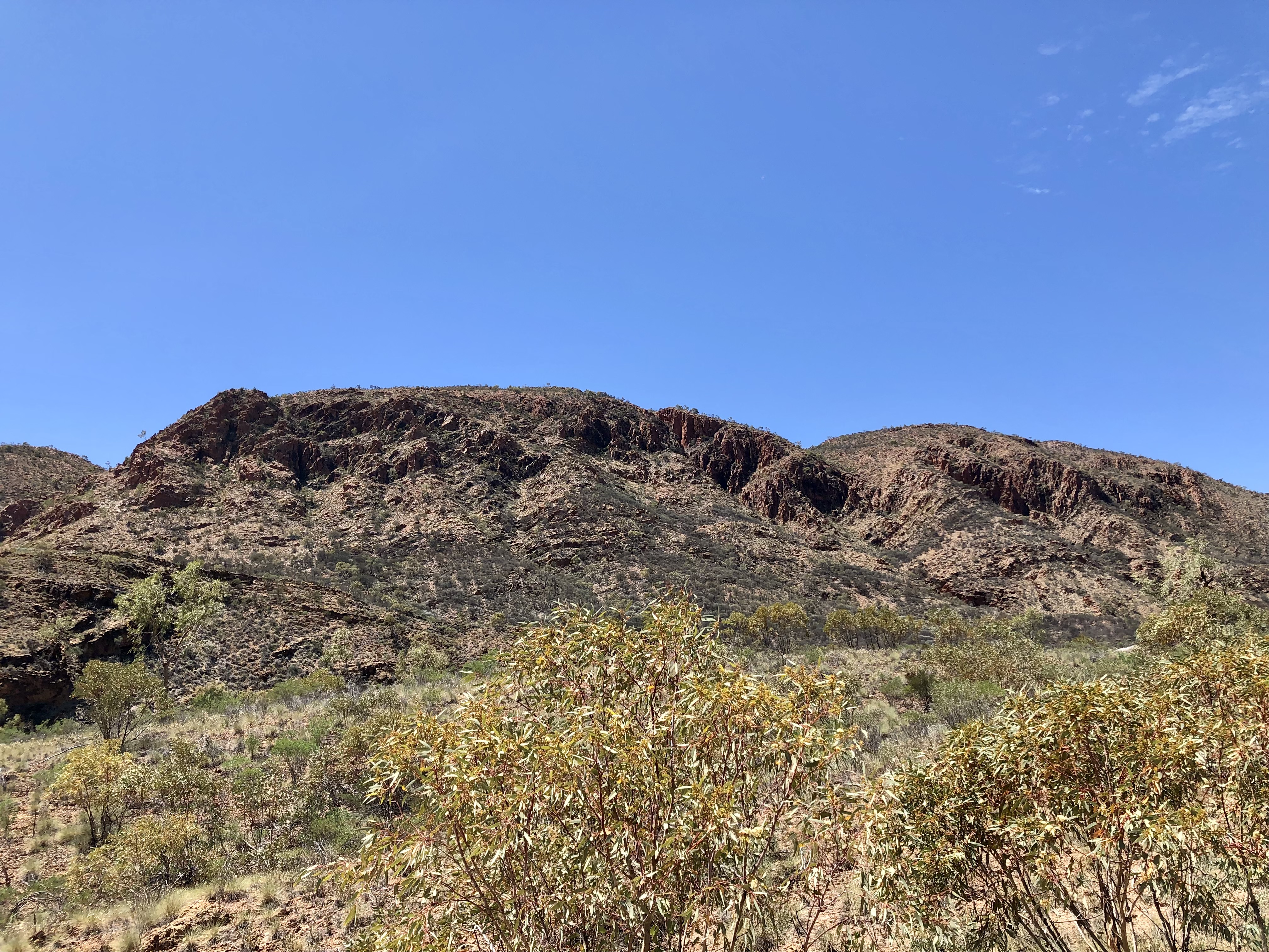 As we drove along the Ross Highway, I found myself feeling overwhelmed by the breathtaking beauty of the deep reds, oranges, pinks and creams that were reflecting from the spectacular, sunlit ranges through which we were driving.