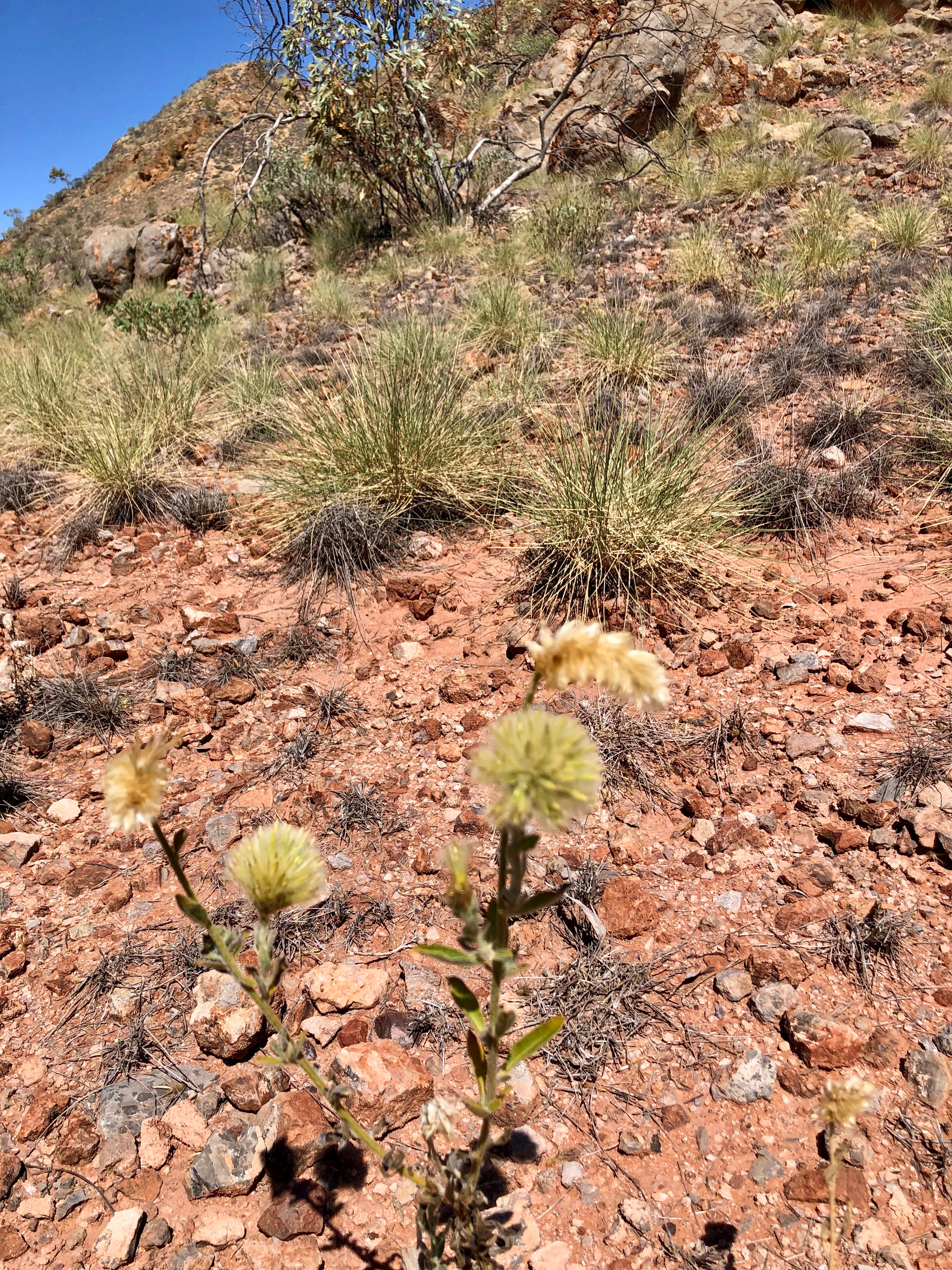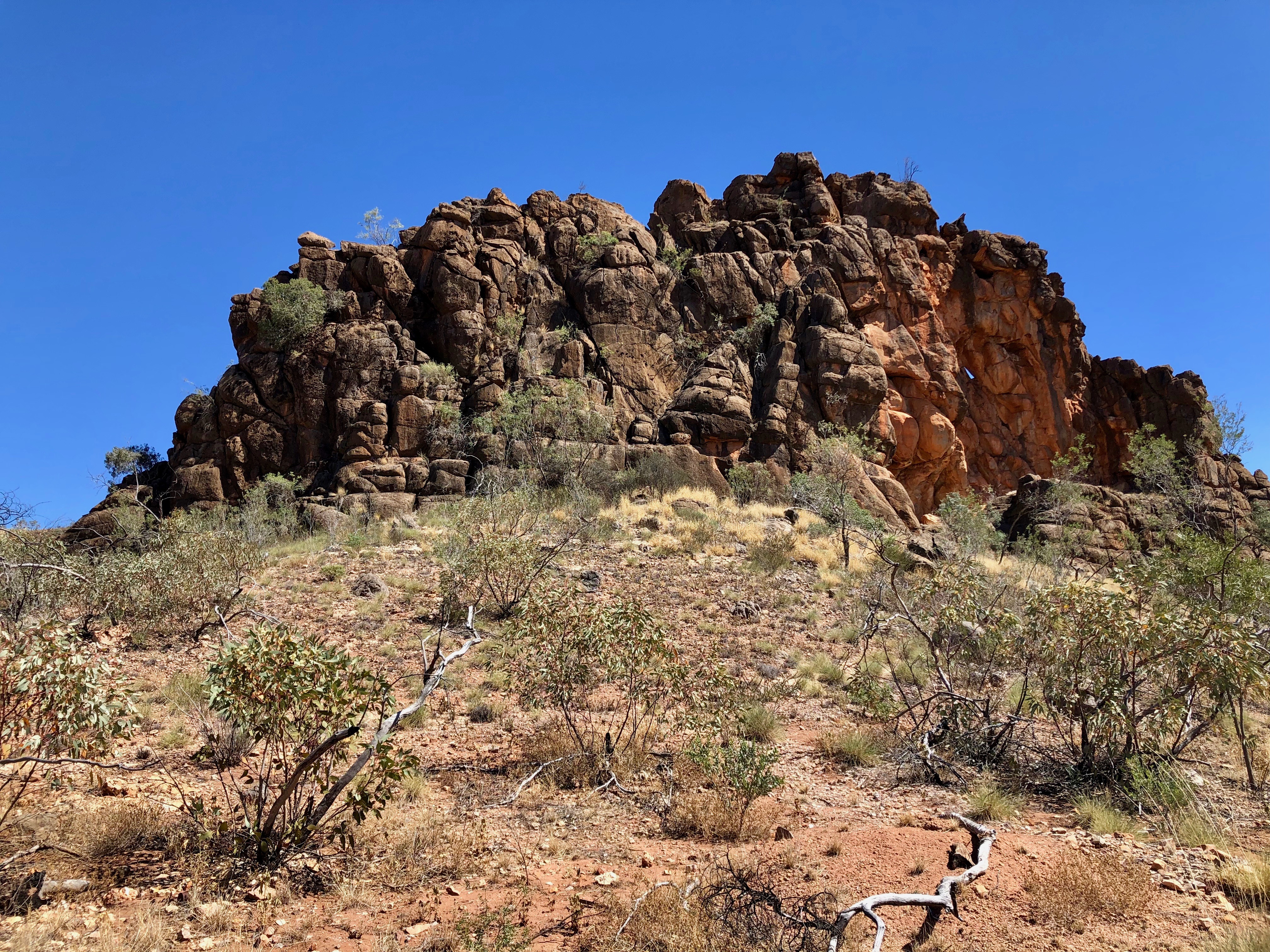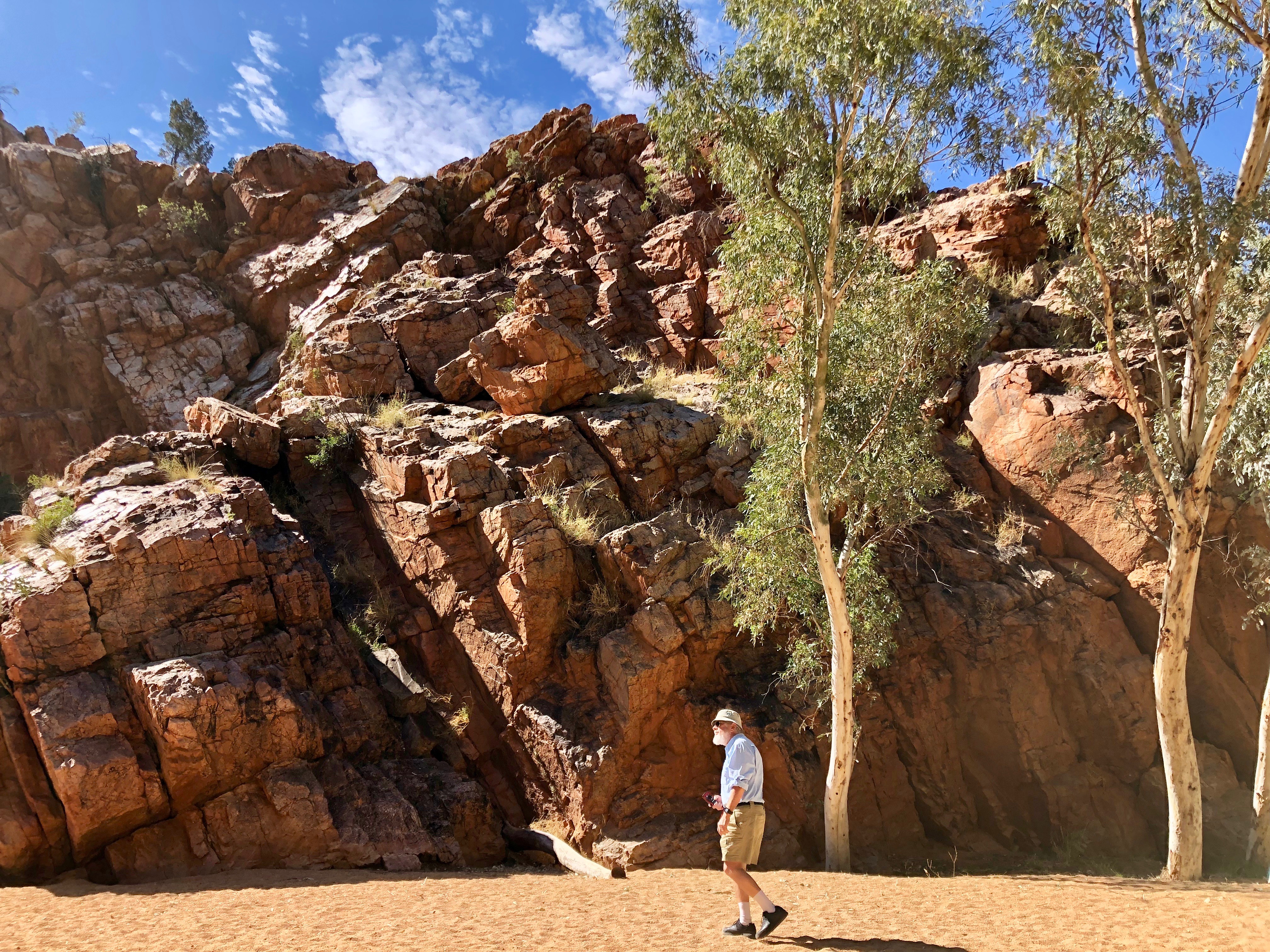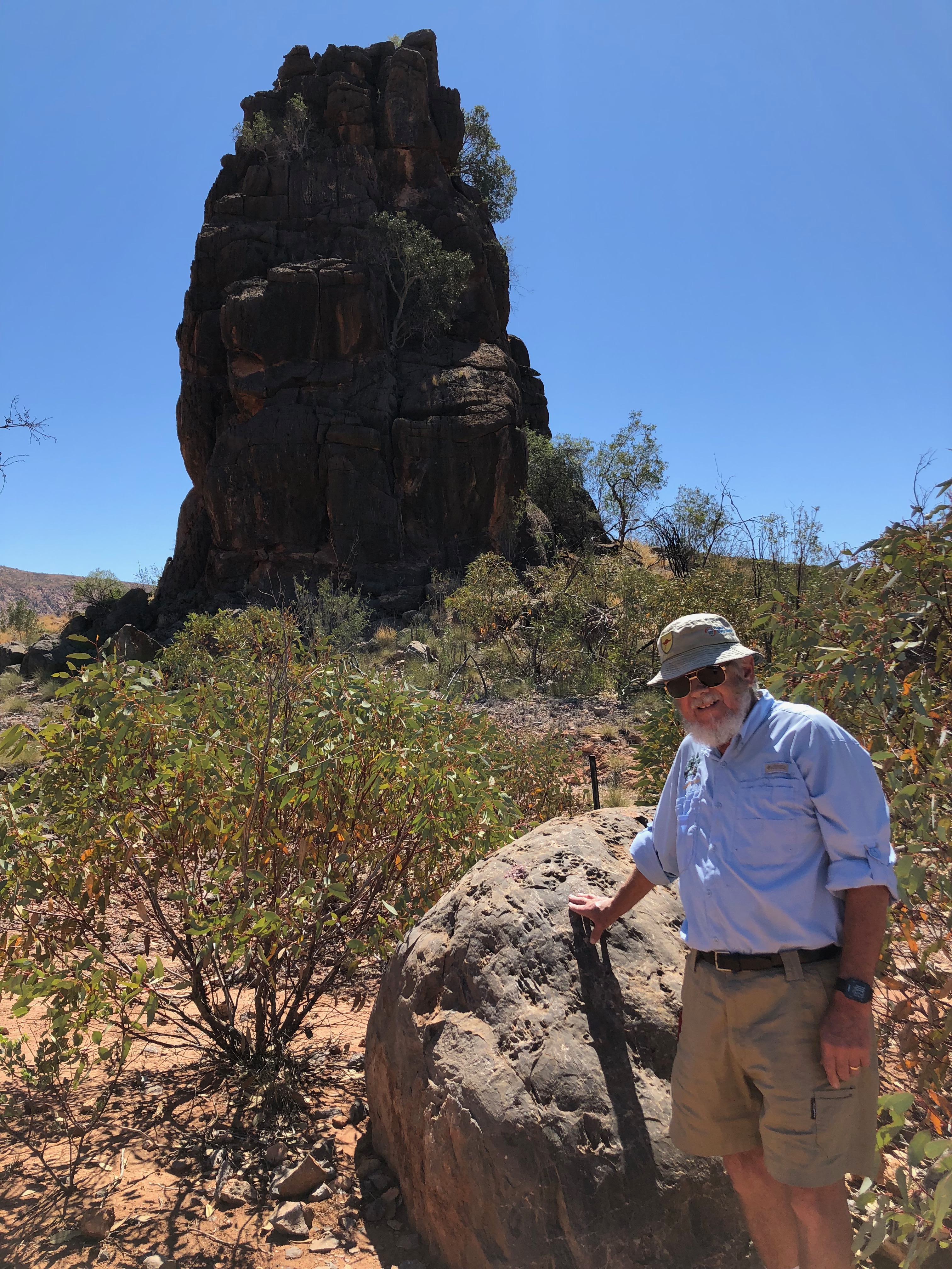 Corroboree Rock is a very impressive dolomite structure which dominates the surrounding landscape. We spent some time exploring the feature and its surroundings. Norm was very interested in a huge pockmarked boulder with pretty pink crystallisation on the surface. I was delighted to find a pretty MacDonnell’s Desert Fuchsia in flower in amongst the spiky Spinifex.
