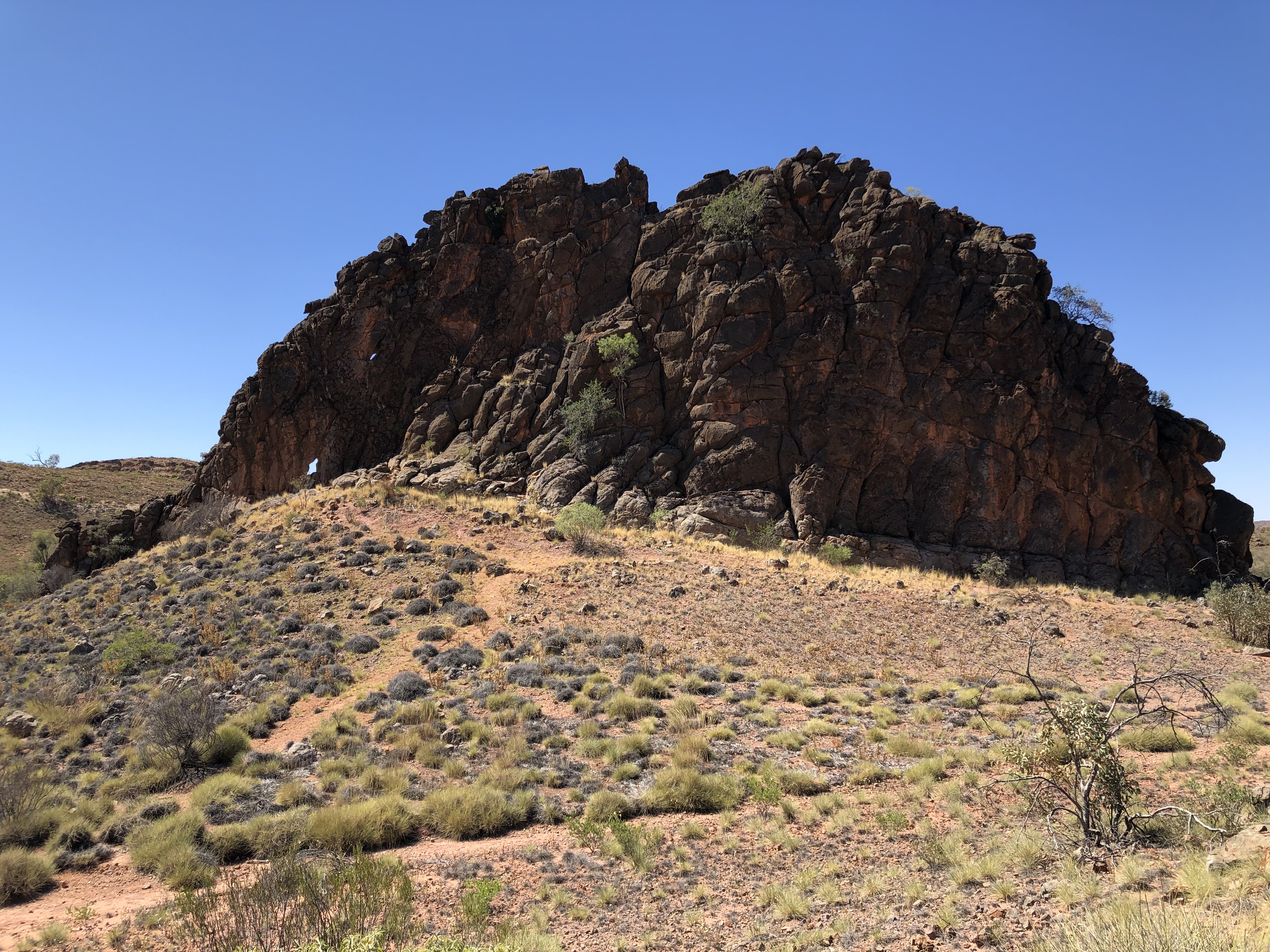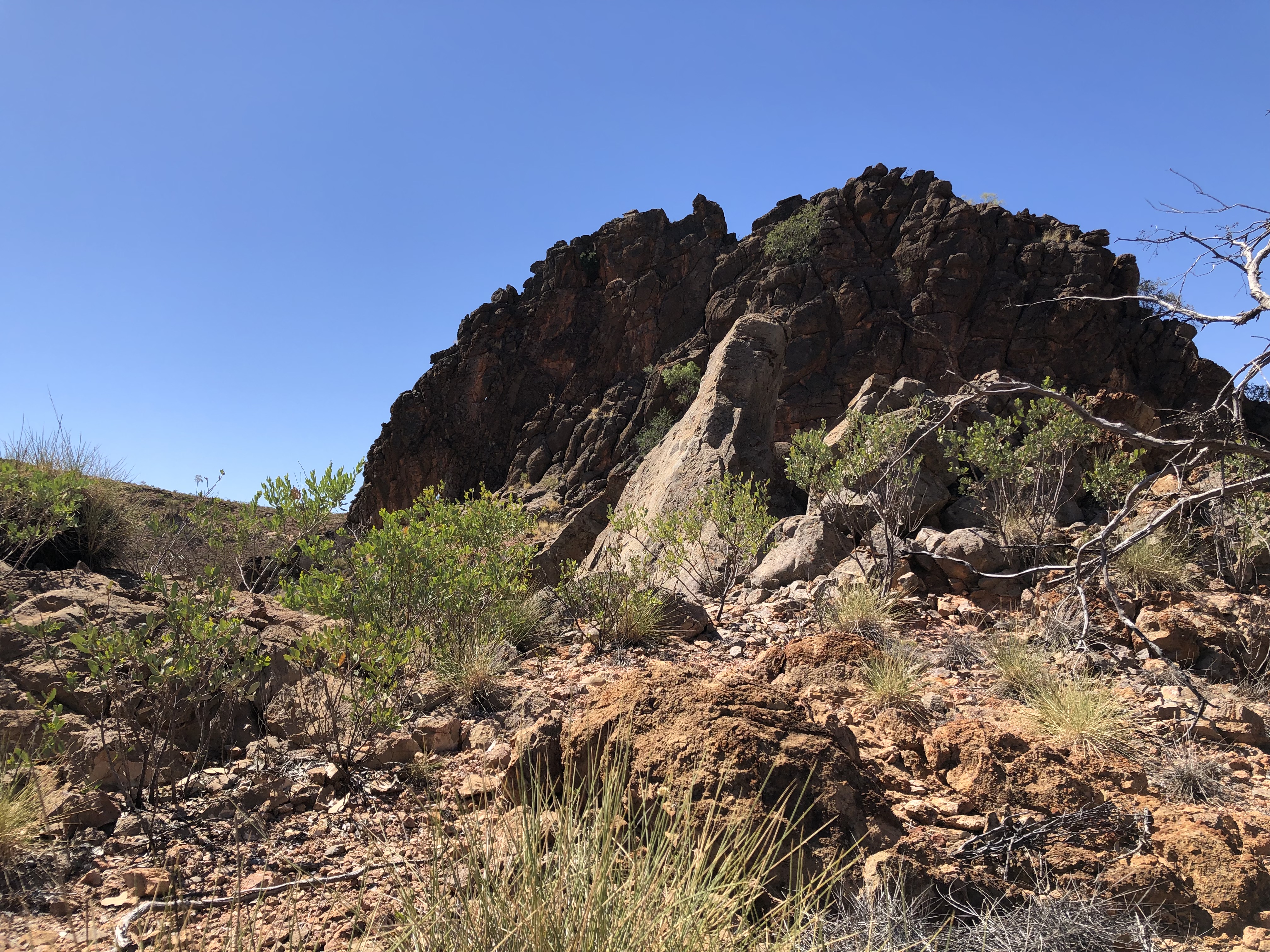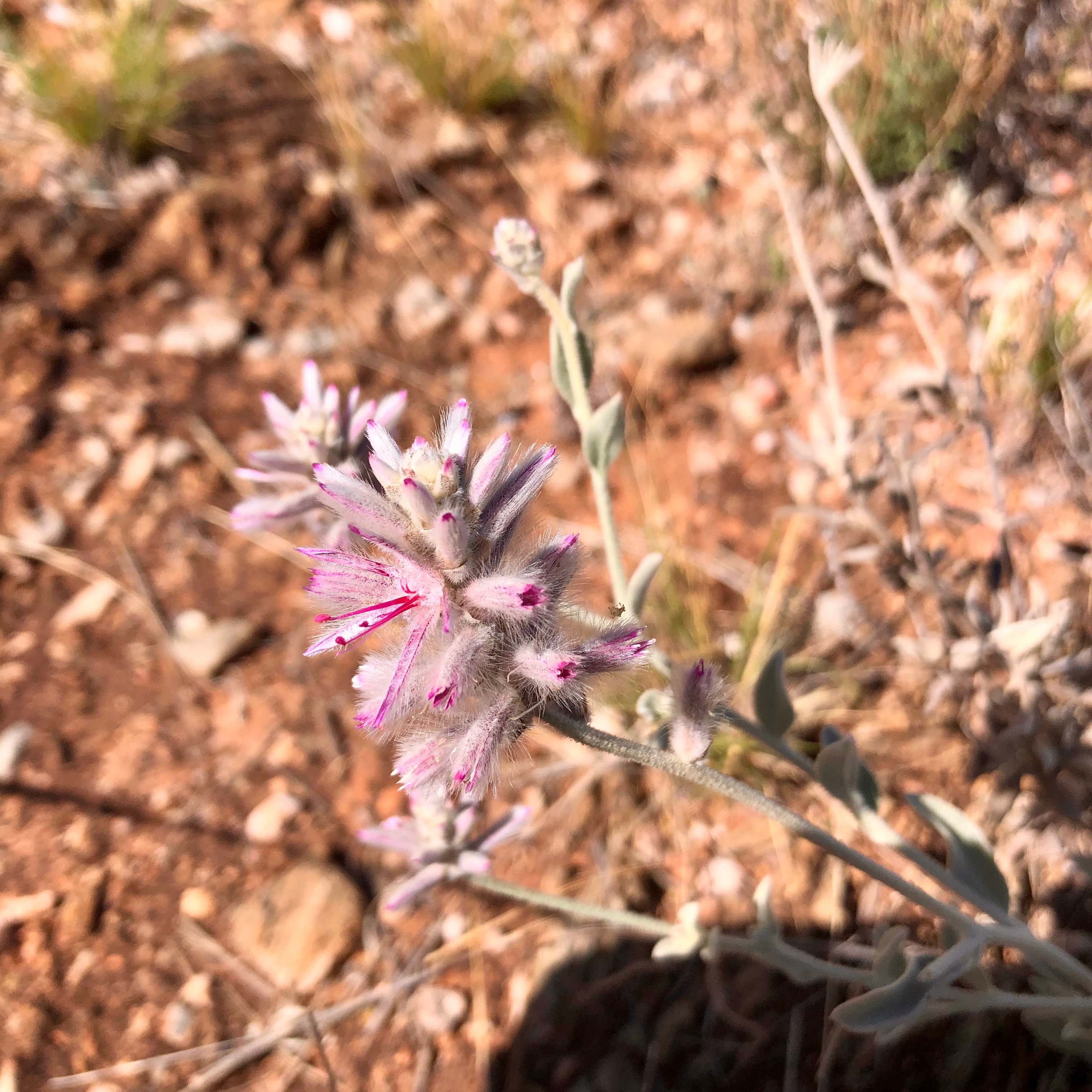Corroboree Rock is a very impressive dolomite structure which dominates the surrounding landscape. We spent some time exploring the feature and its surroundings. Norm was very interested in a huge pockmarked boulder with pretty pink crystallisation on the surface. I was delighted to find a pretty MacDonnell’s Desert Fuchsia in flower in amongst the spiky Spinifex.