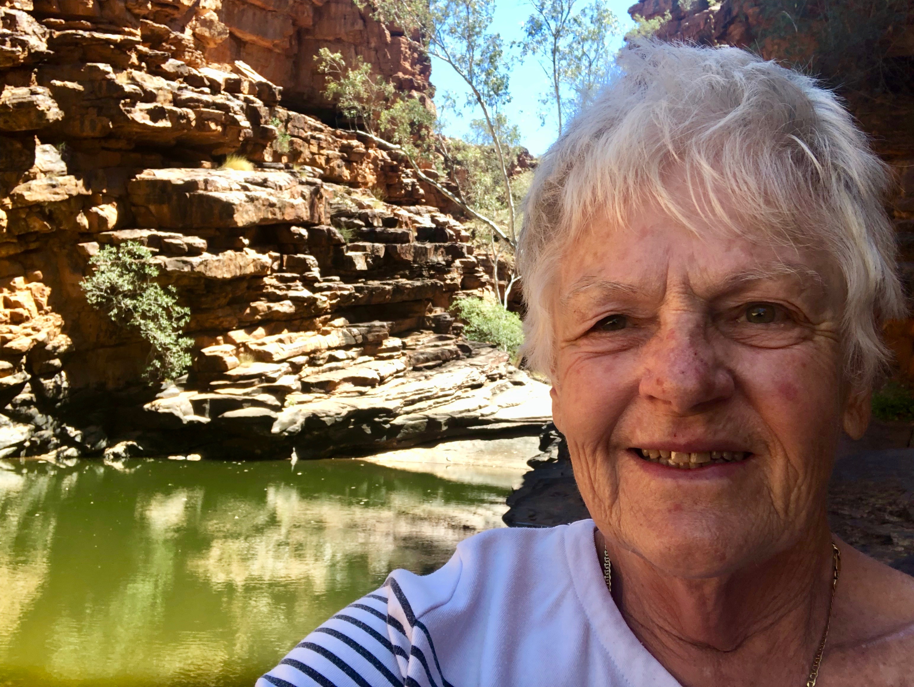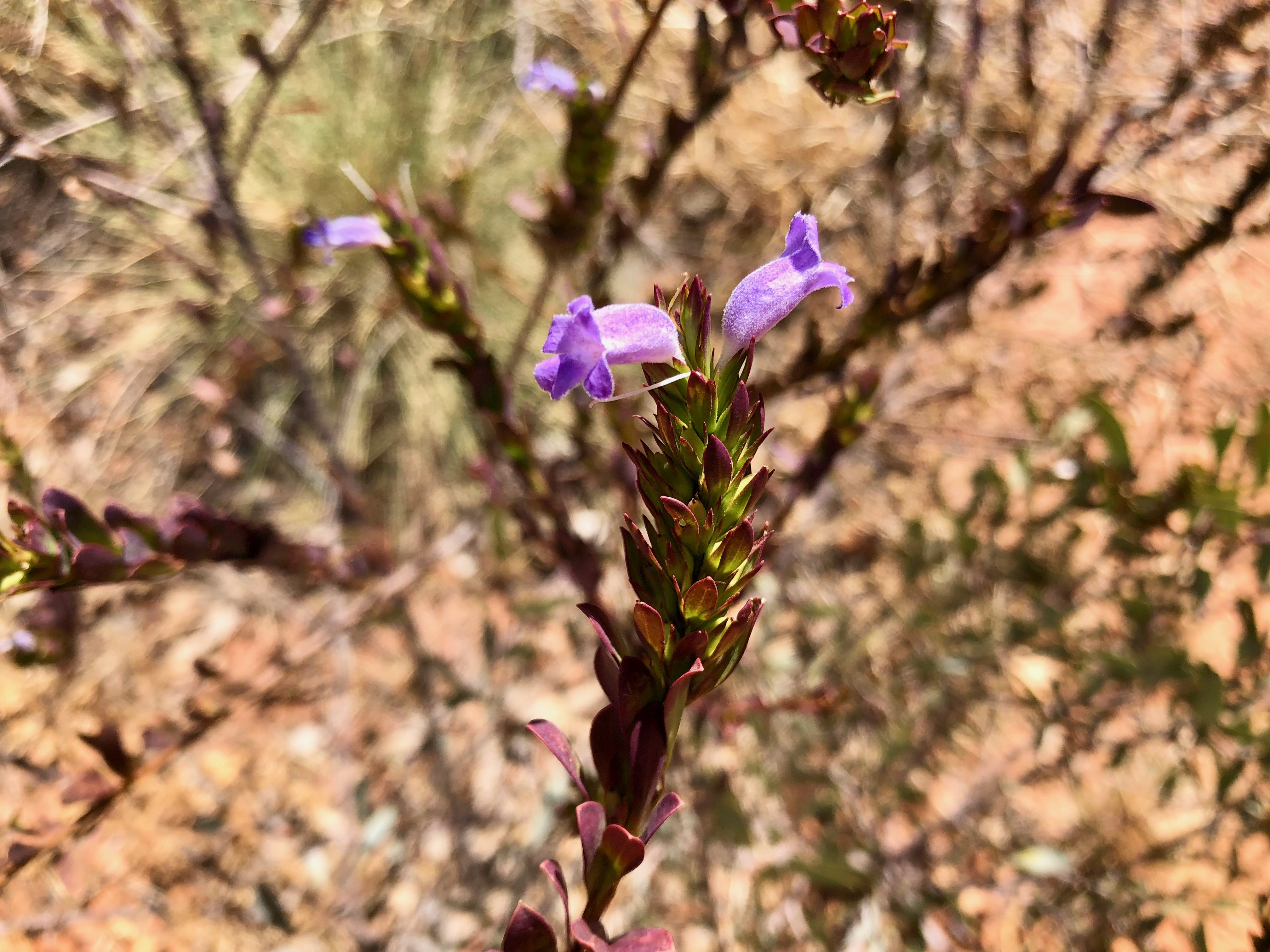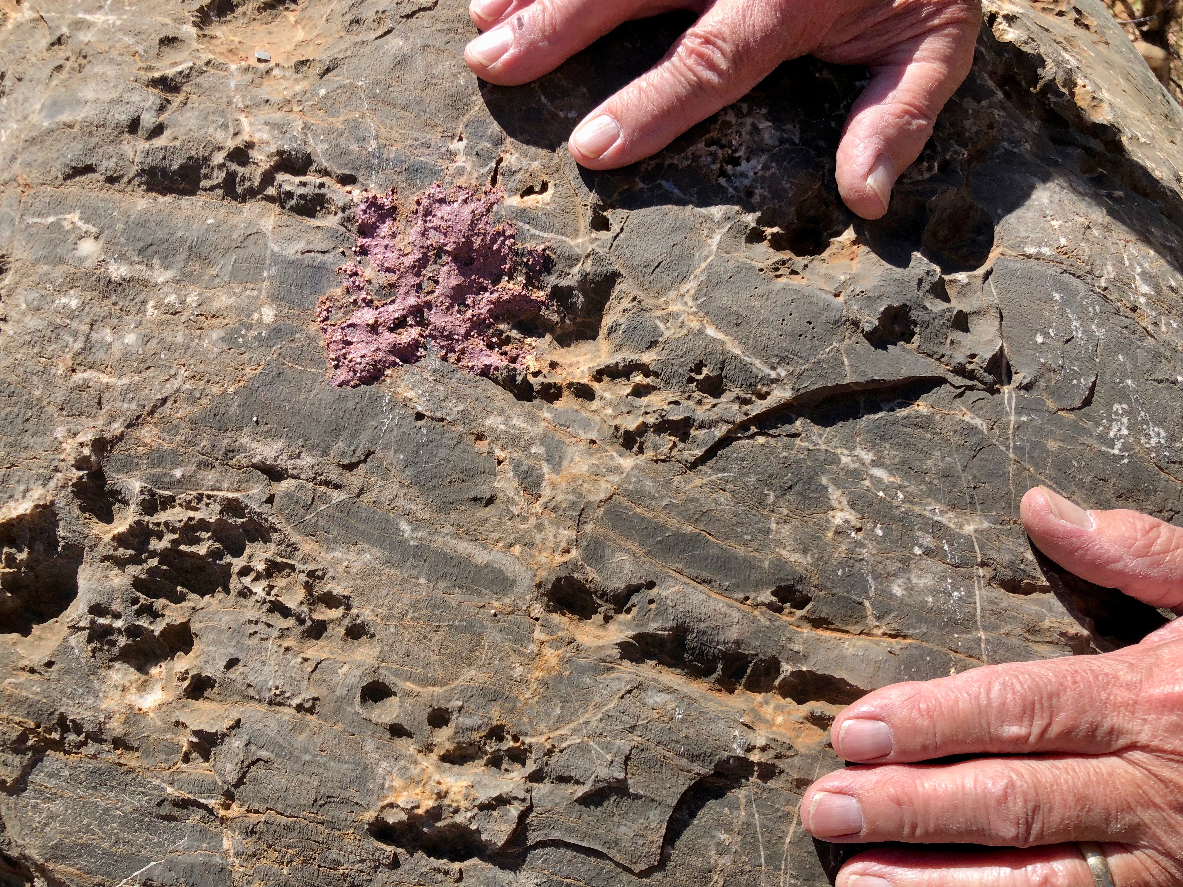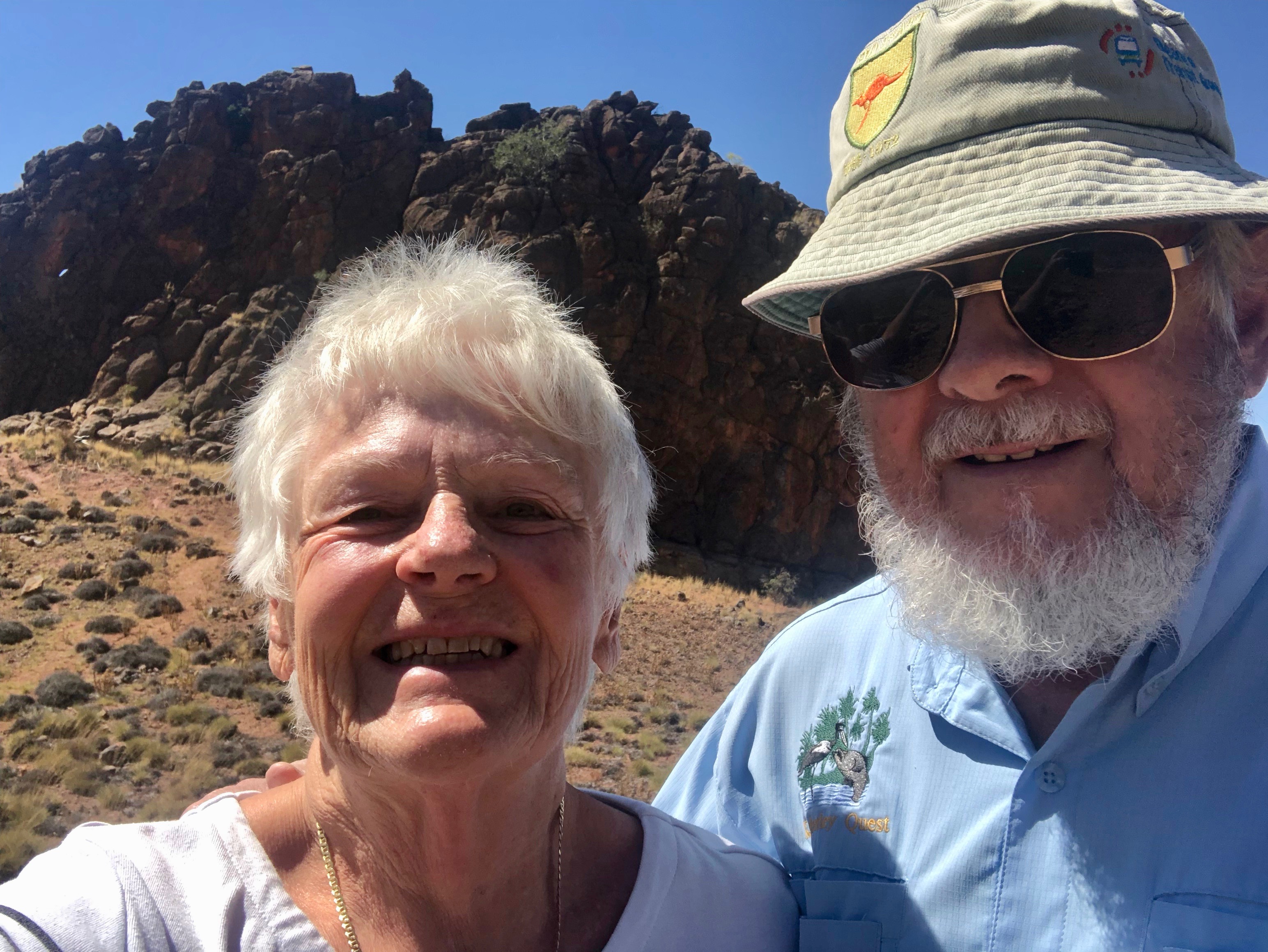 Corroboree Rock is a very impressive dolomite structure which dominates the surrounding landscape. We spent some time exploring the feature and its surroundings. Norm was very interested in a huge pockmarked boulder with pretty pink crystallisation on the surface. I was delighted to find a pretty MacDonnell’s Desert Fuchsia in flower in amongst the spiky Spinifex.