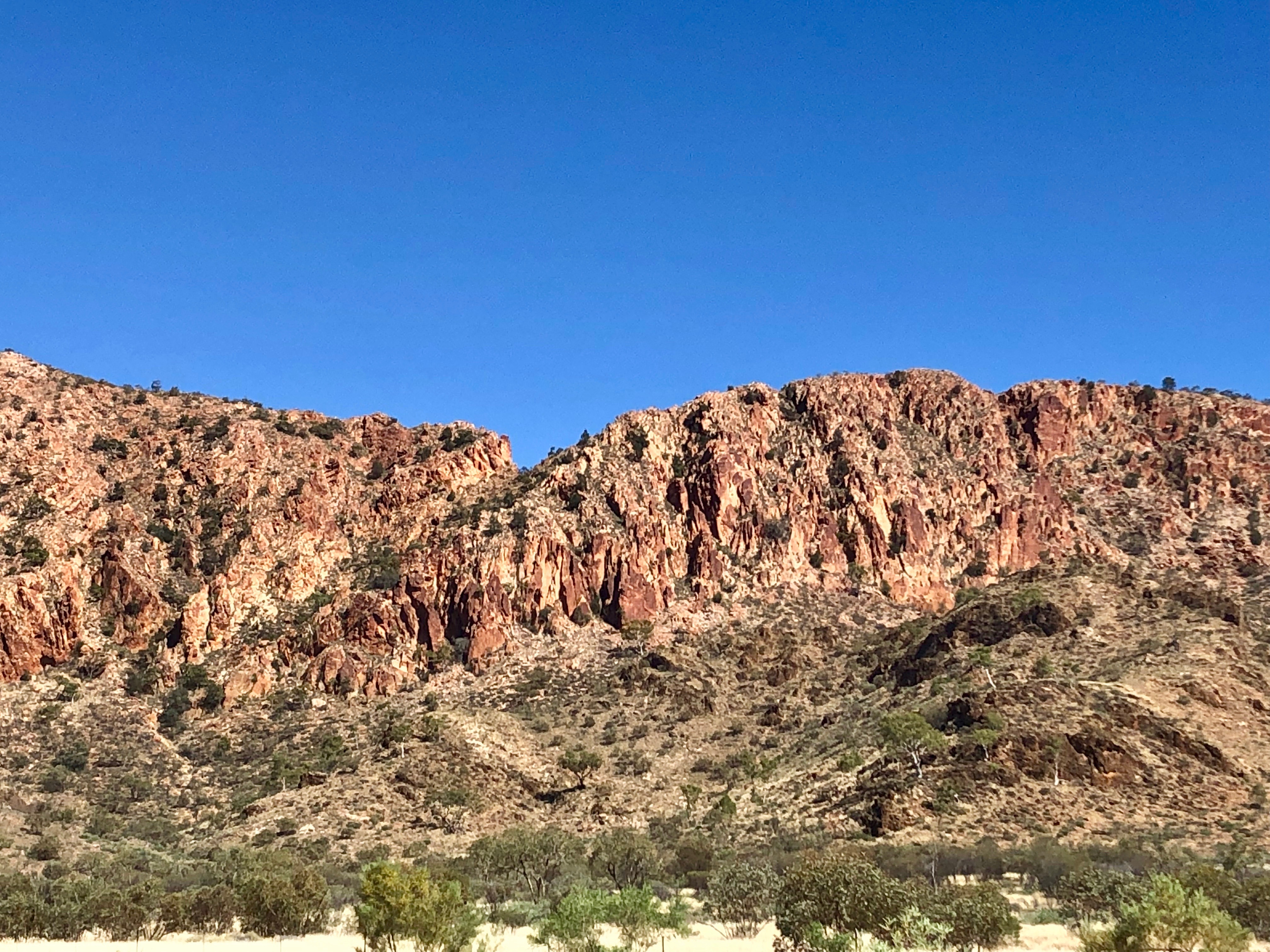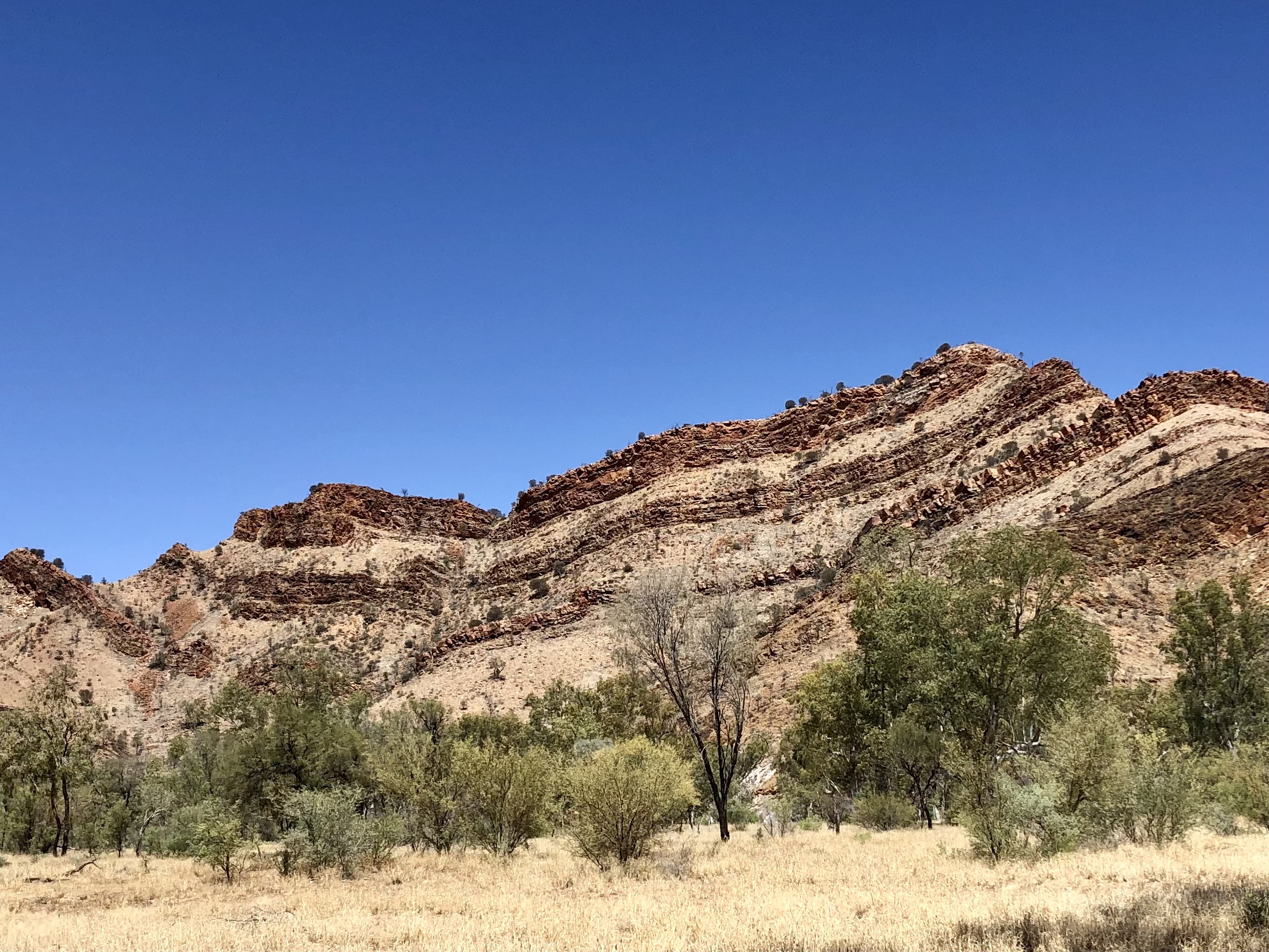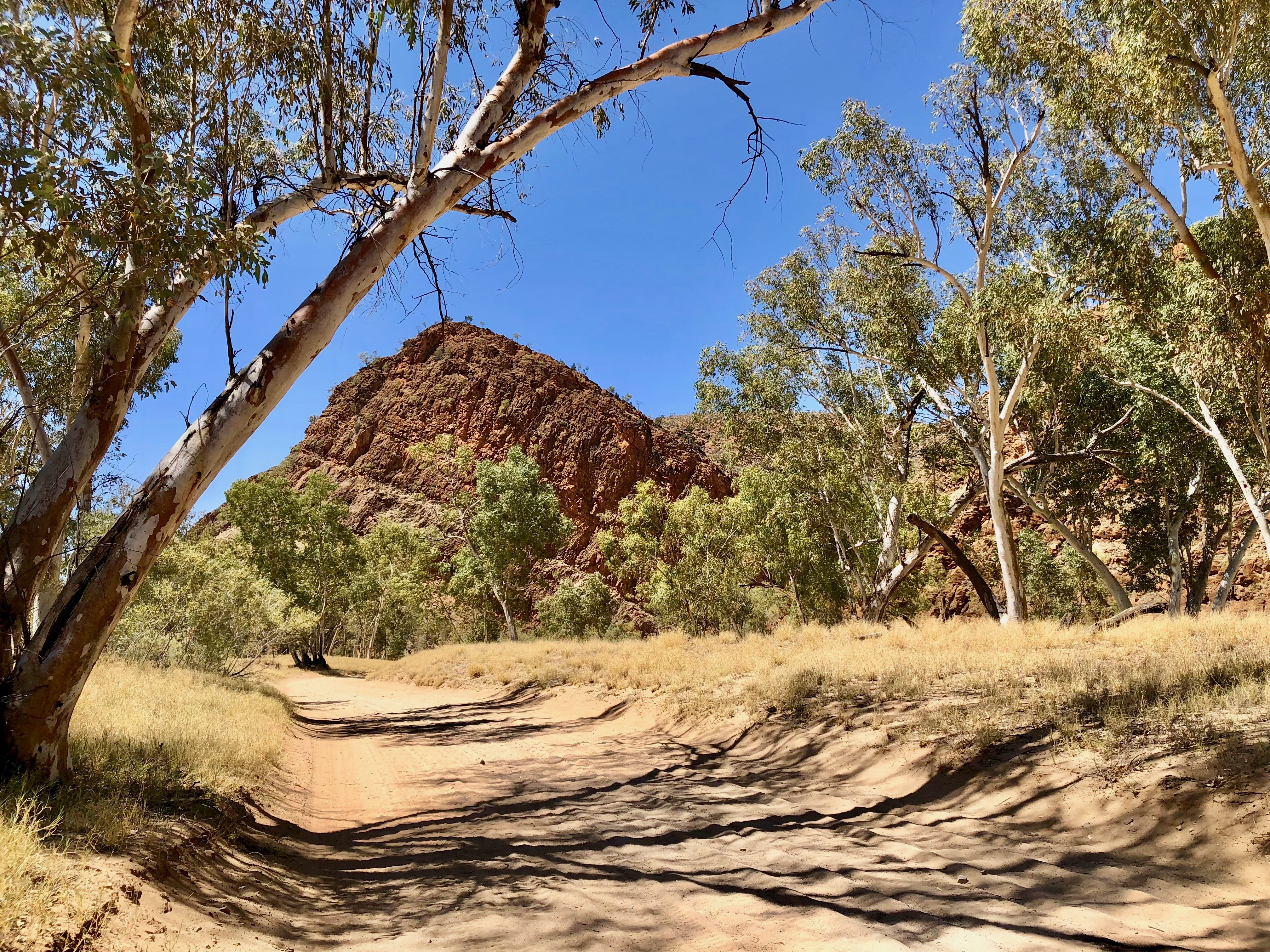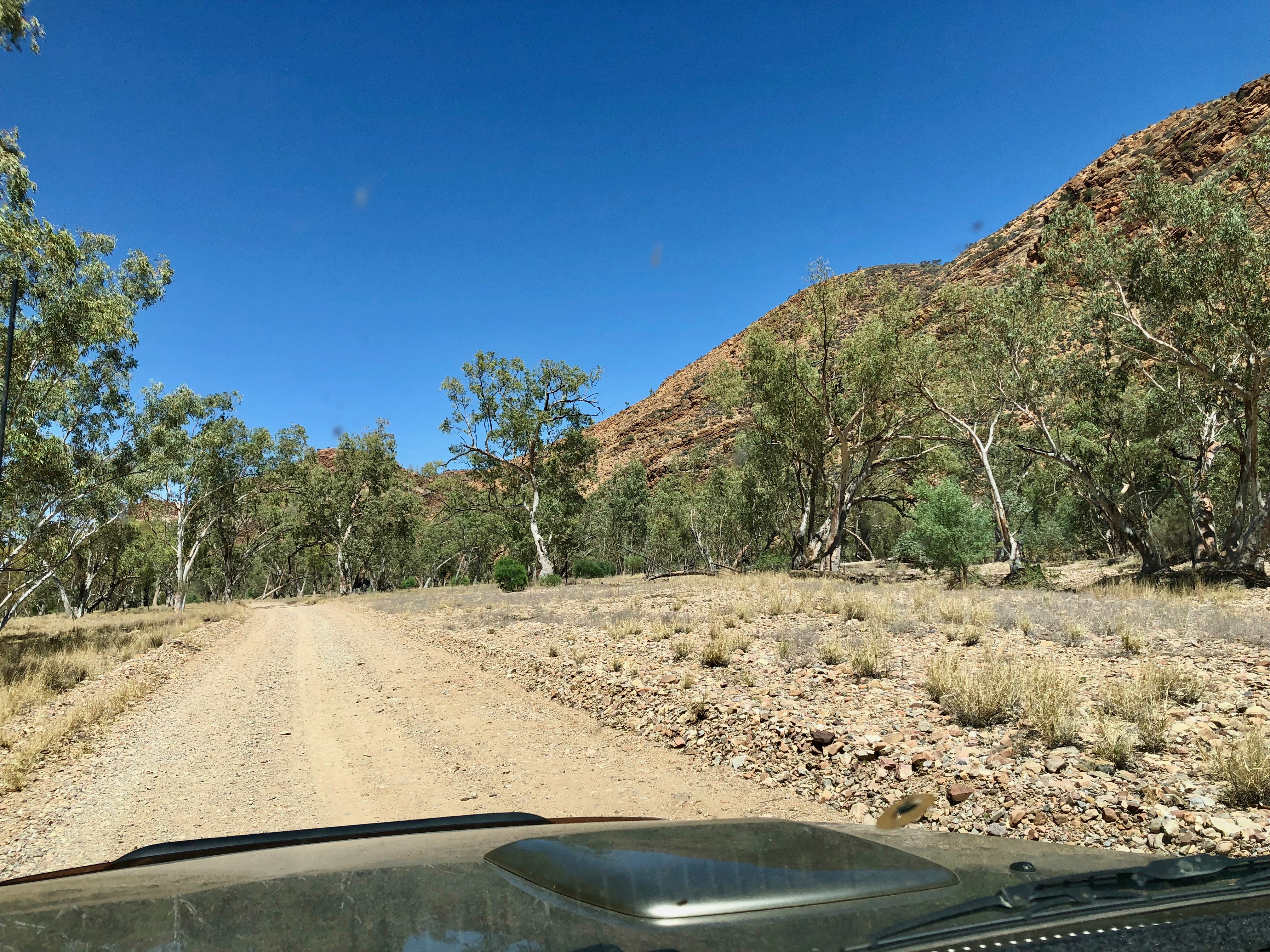The first section of the next Gorge, N’∂hala just blew us away as we followed the dry river bed of the Ross River, past soaring cliffs and lower more undulating rock faces. The colours were so vivid and brightly lit by the sun. We didn’t drive the full length, turning around when the gorge opened out into a wide, flat riverbed with lower walls. We didn’t get to see any of the very special petroglyphs and other art sites left by the Eastern Arrernte people. It would have taken longer than we could spare to do the gorge justice. Another place to add to our ‘revisit list’.