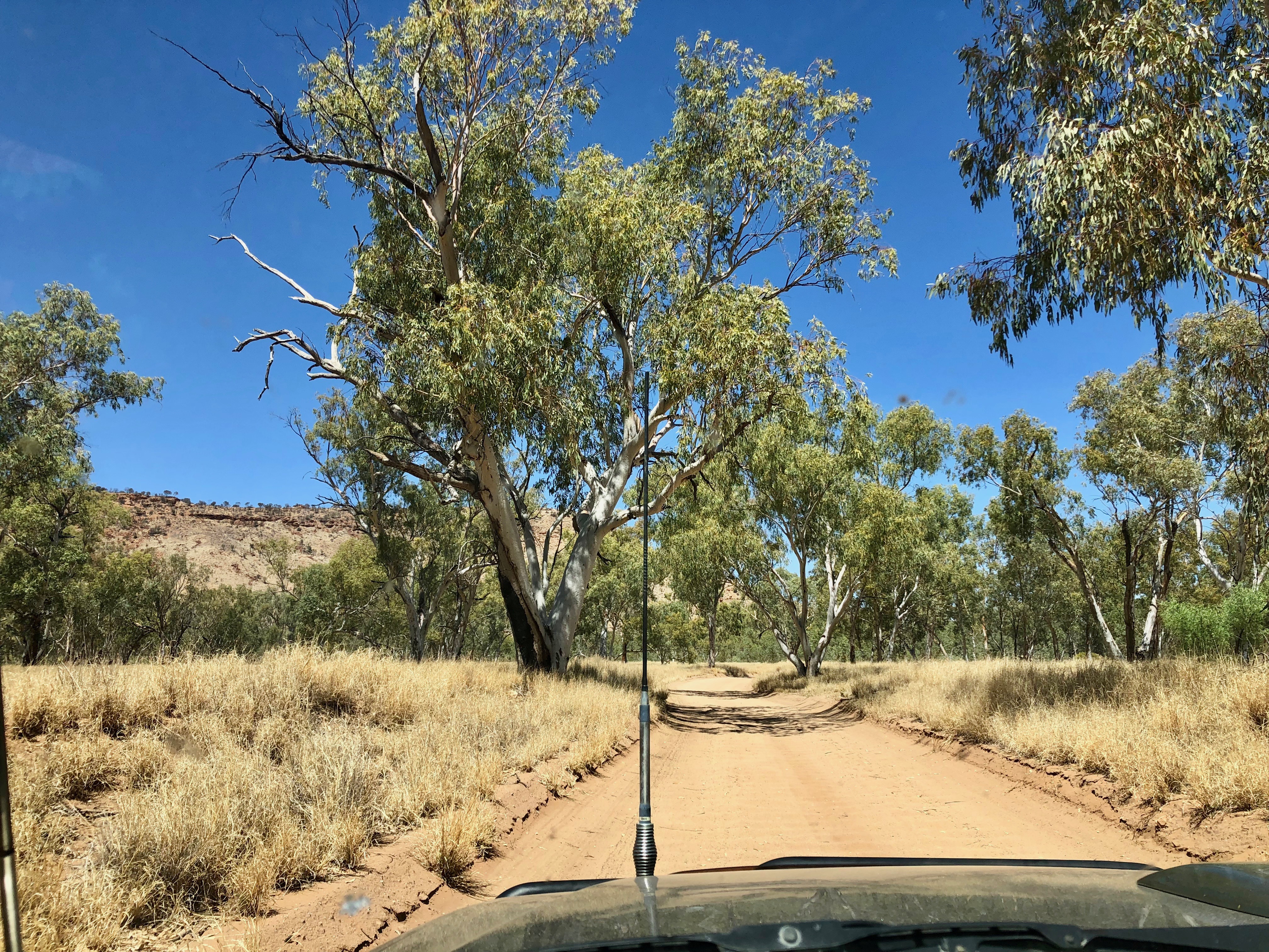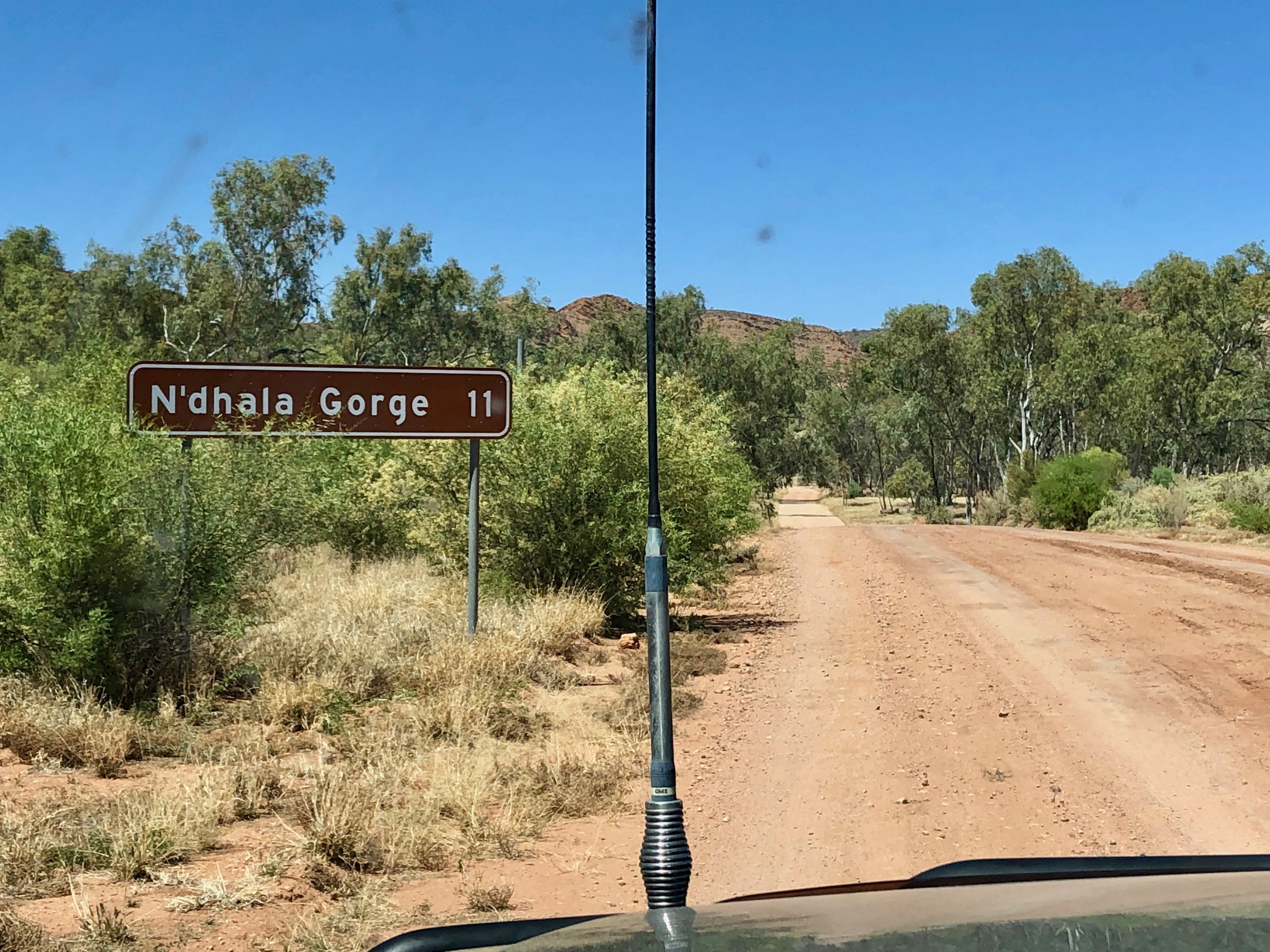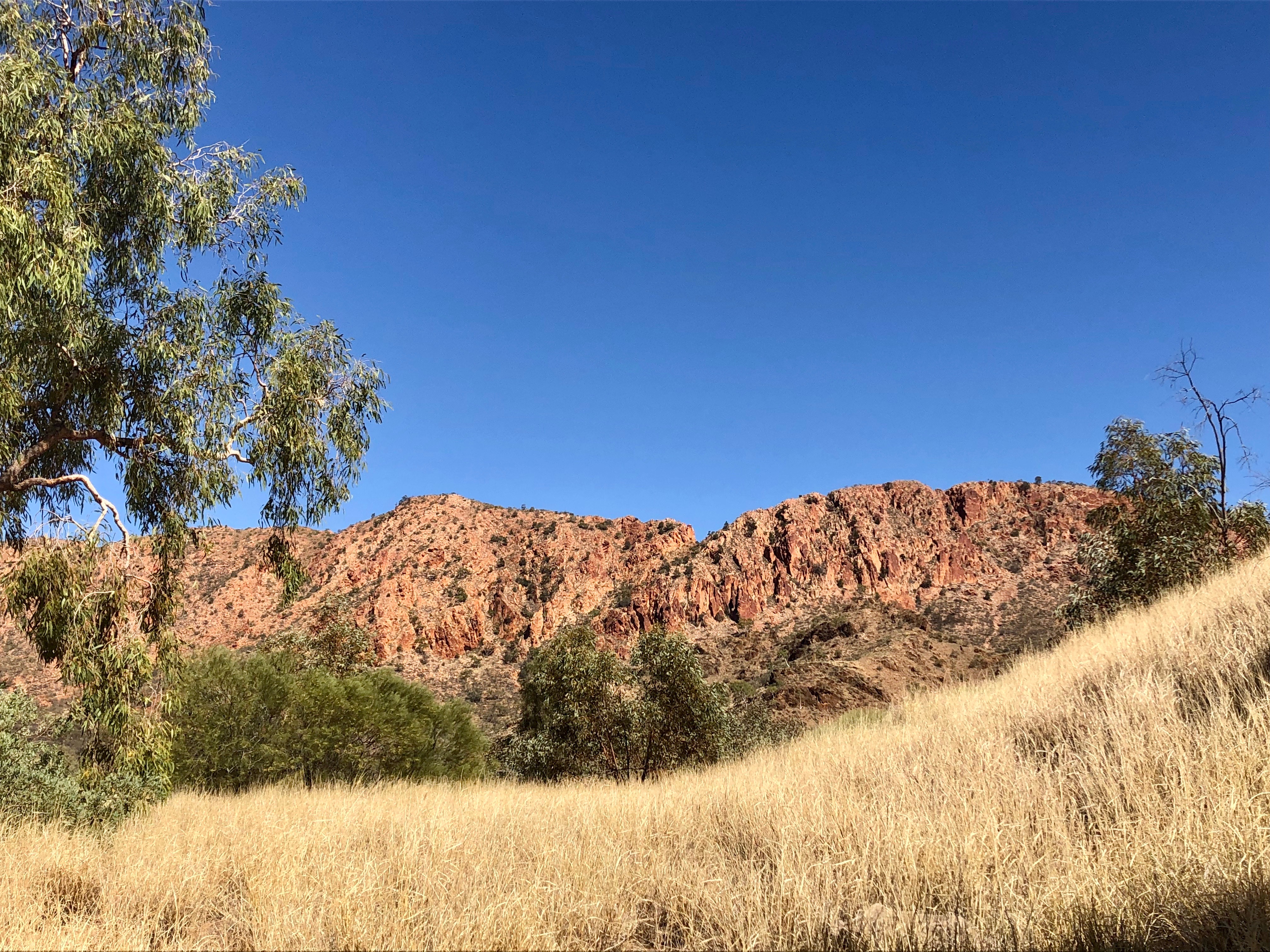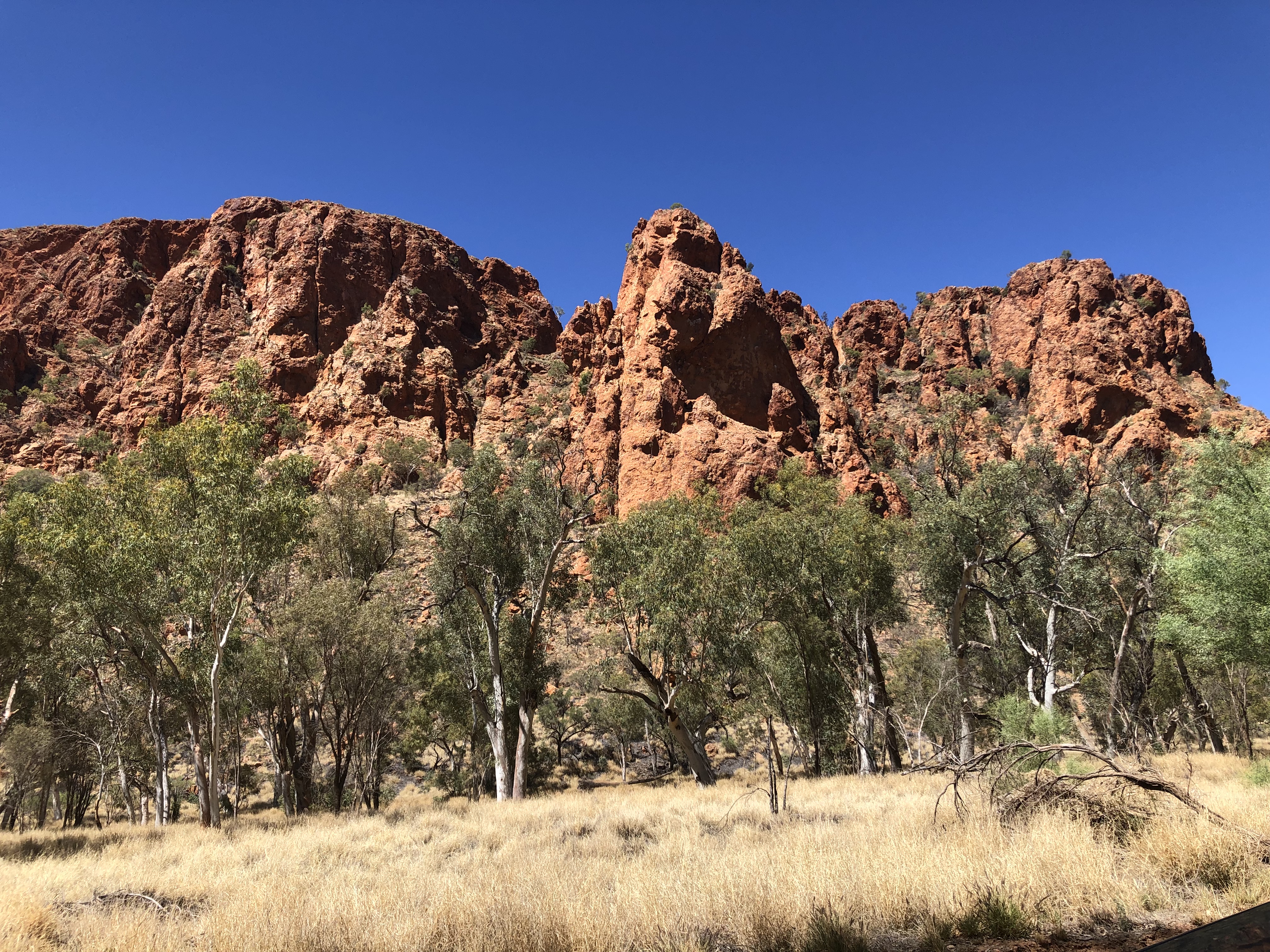 The first section of the next Gorge, N’∂hala just blew us away as we followed the dry river bed of the Ross River, past soaring cliffs and lower more undulating rock faces. The colours were so vivid and brightly lit by the sun. We didn’t drive the full length, turning around when the gorge opened out into a wide, flat riverbed with lower walls. We didn’t get to see any of the very special petroglyphs and other art sites left by the Eastern Arrernte people. It would have taken longer than we could spare to do the gorge justice. Another place to add to our ‘revisit list’.