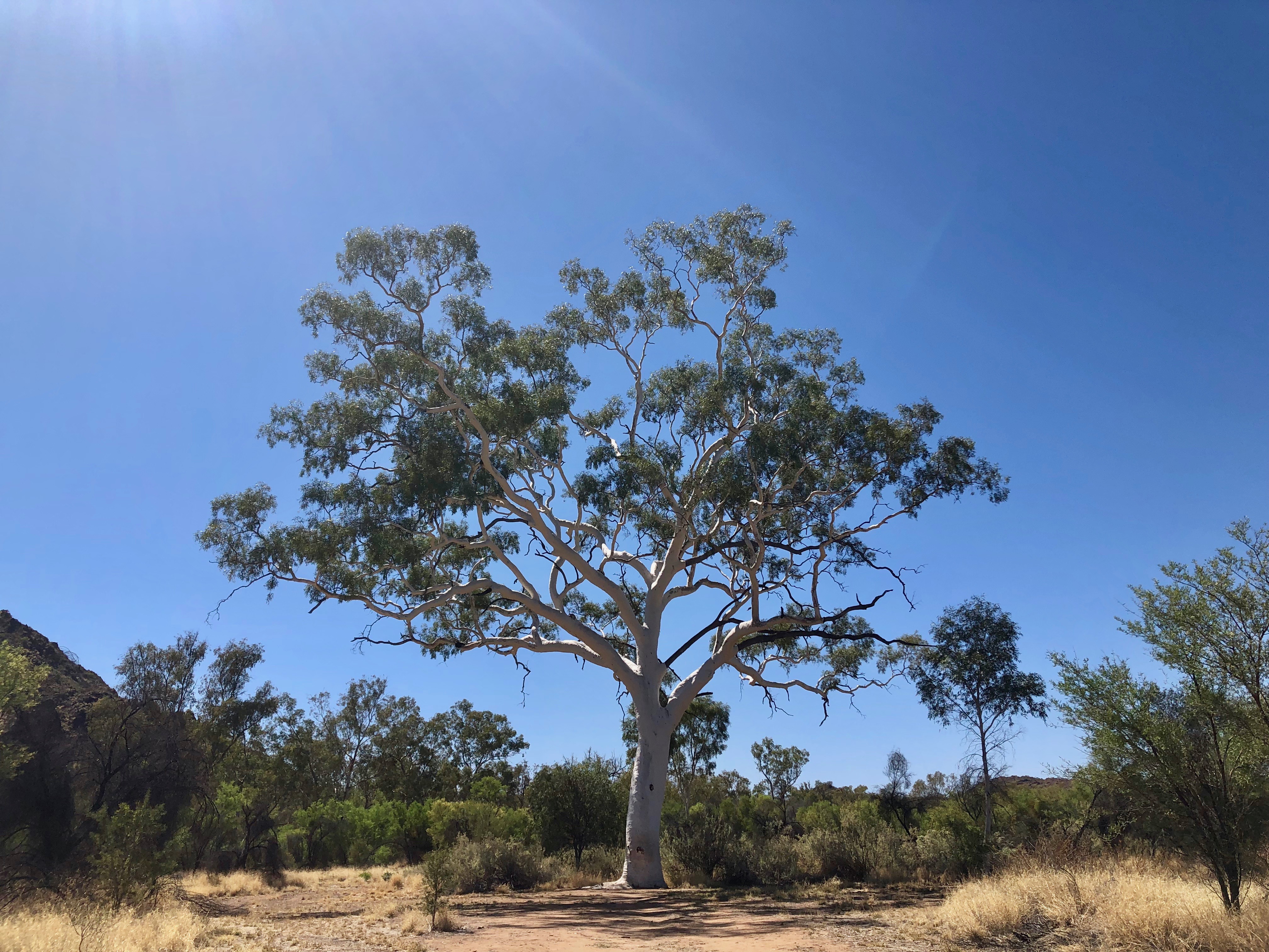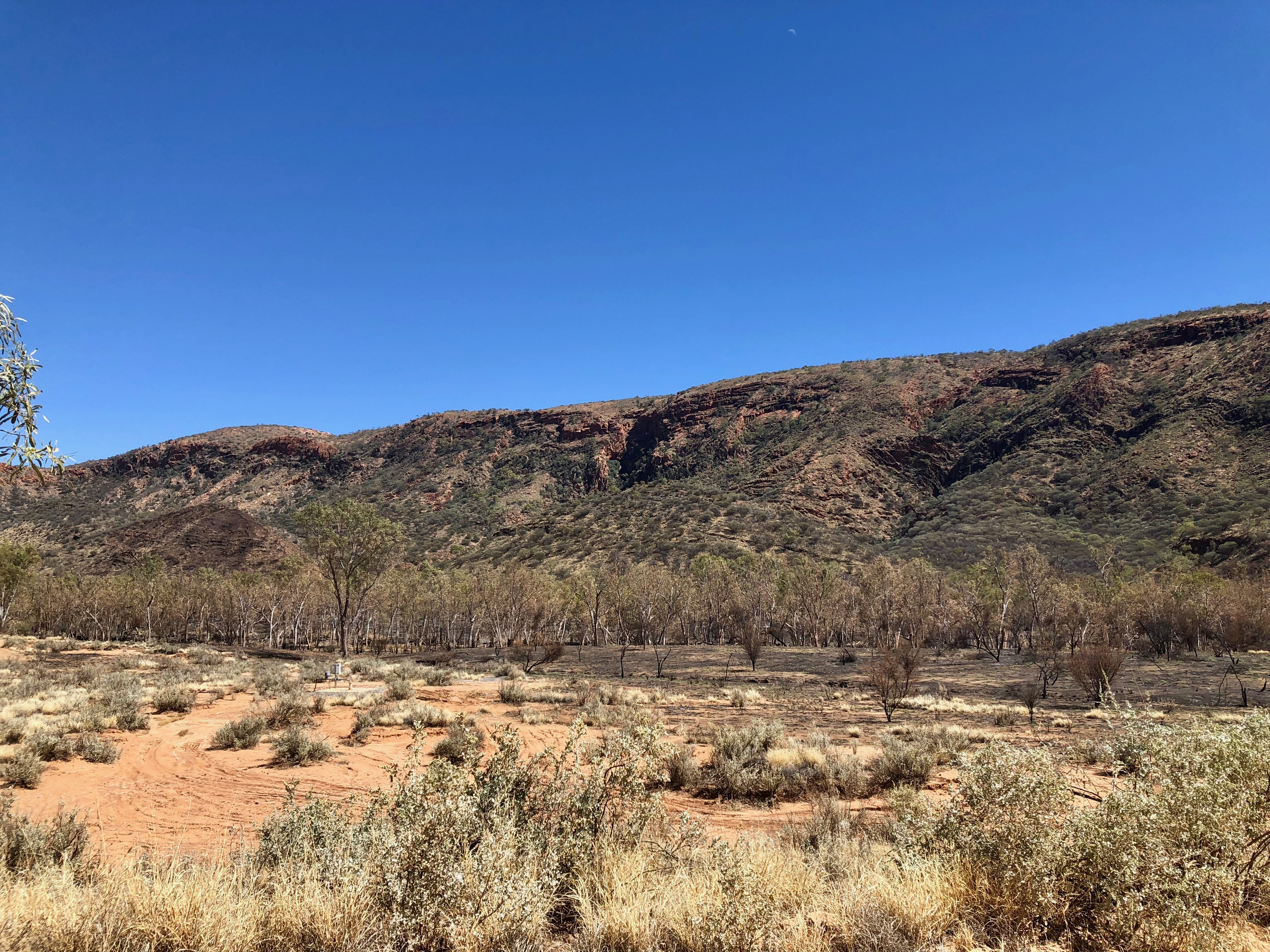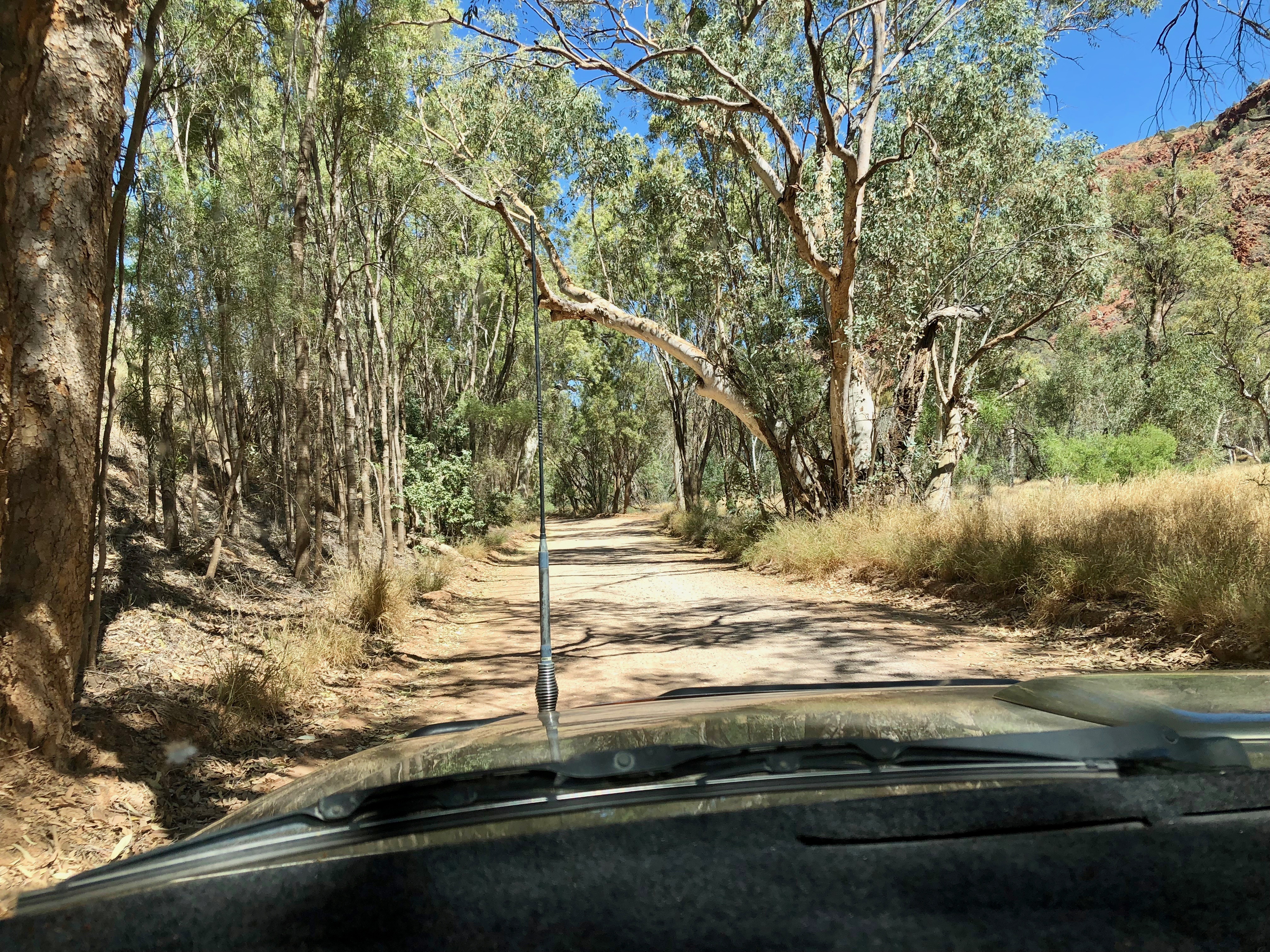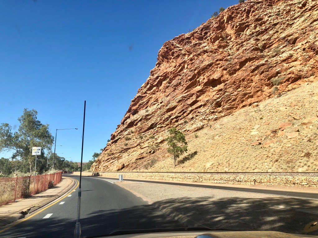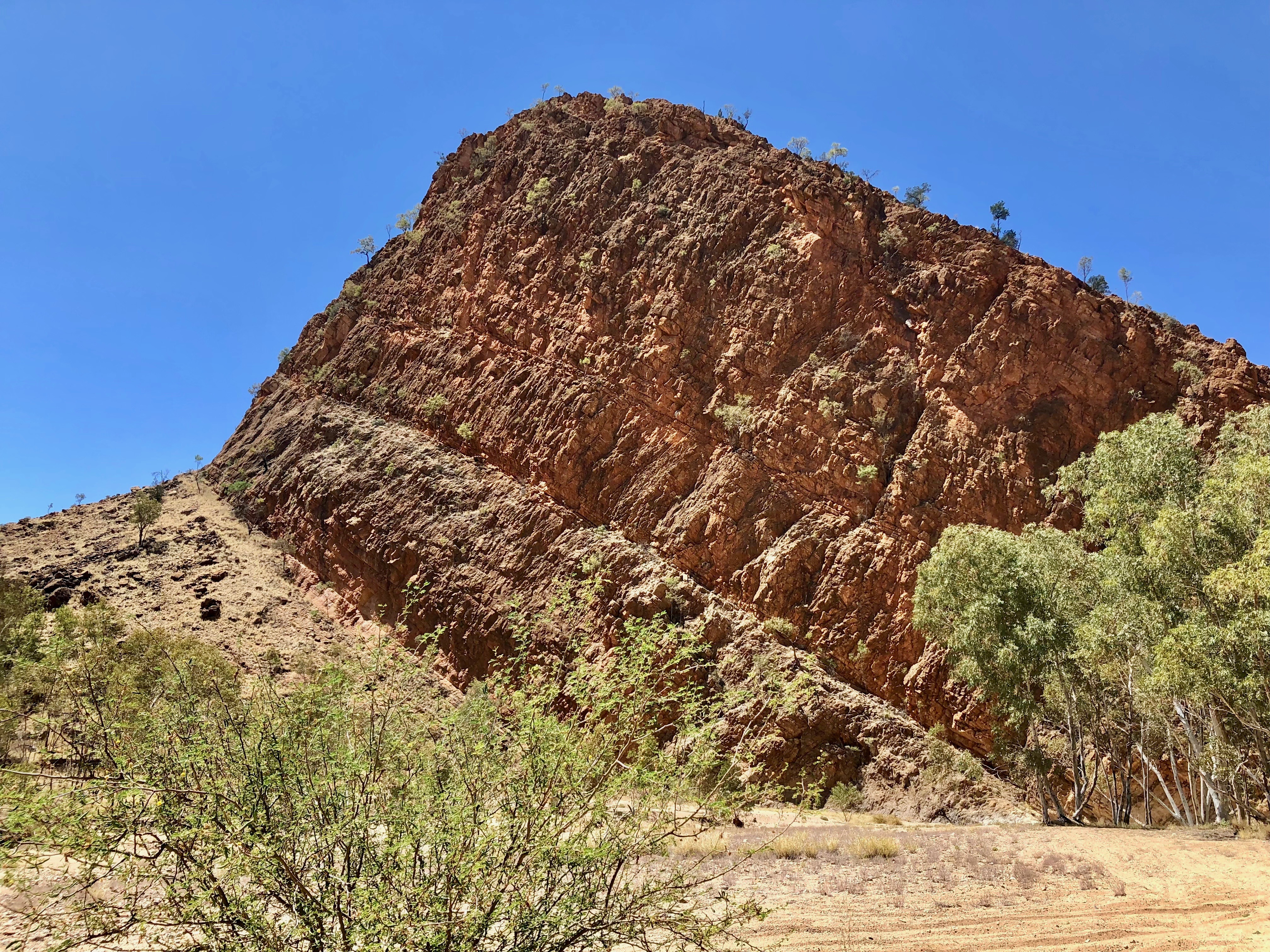 The first section of the next Gorge, N’∂hala just blew us away as we followed the dry river bed of the Ross River, past soaring cliffs and lower more undulating rock faces. The colours were so vivid and brightly lit by the sun. We didn’t drive the full length, turning around when the gorge opened out into a wide, flat riverbed with lower walls. We didn’t get to see any of the very special petroglyphs and other art sites left by the Eastern Arrernte people. It would have taken longer than we could spare to do the gorge justice. Another place to add to our ‘revisit list’.