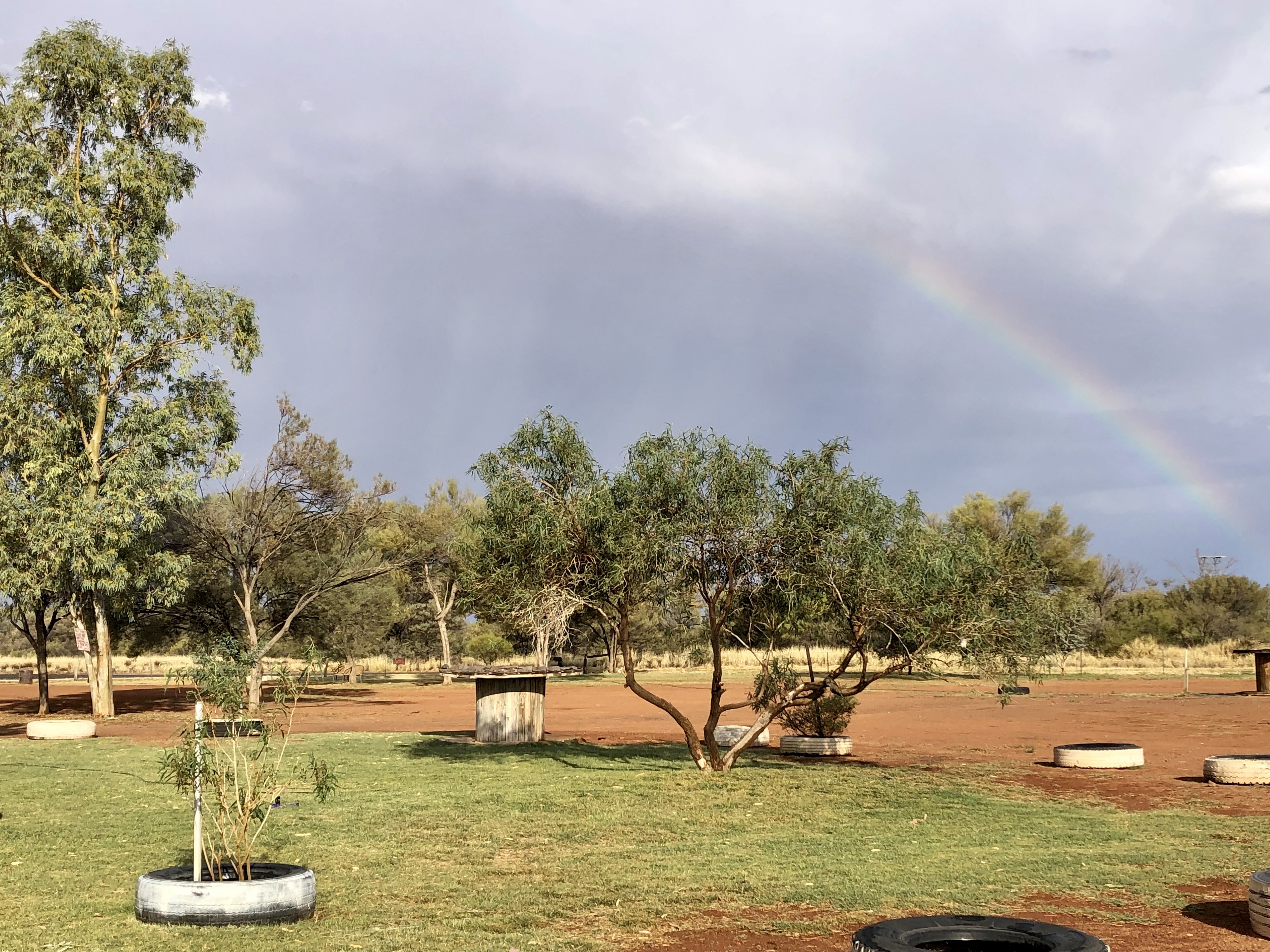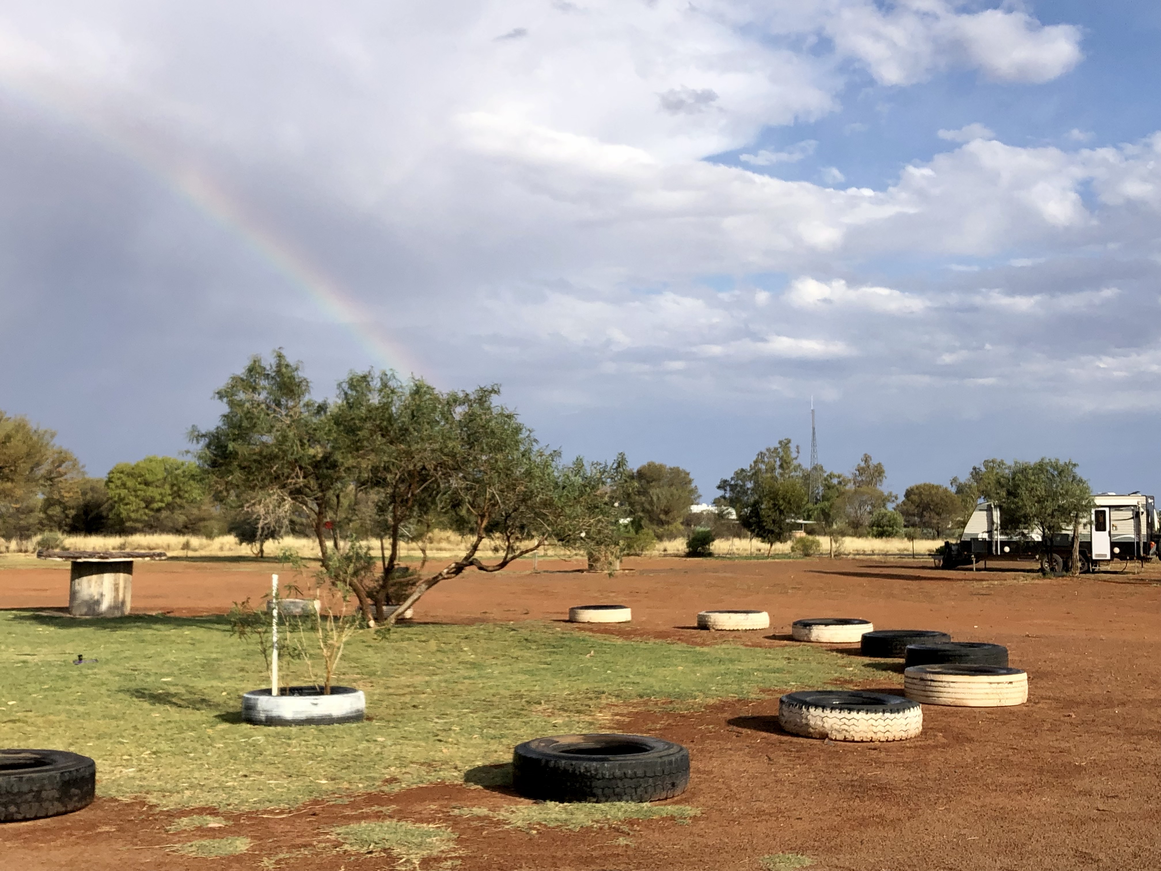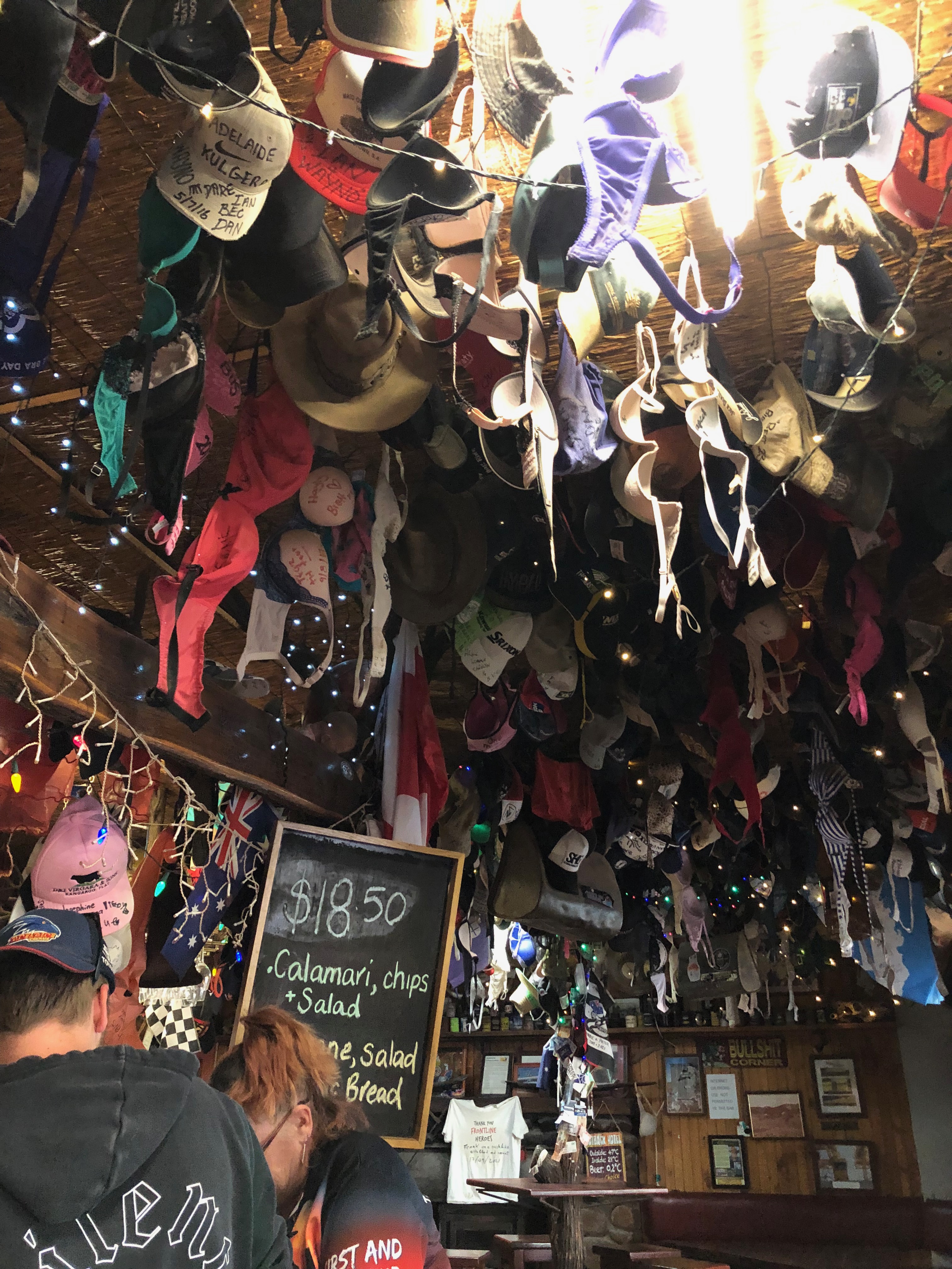 It was sunny when we arrived however shortly after, the skies darkened, thunder roared above and it started to rain – the first real rain for months. During the afternoon we experienced everything from sunshine, rainbows, storms and clear skies. A freezing cold south westerly then blew the storms away. We joined several of our fellow campers at the pub for dinner. The bar was decorated with all manner of underwear hanging from the ceiling. I wondered if the bras and things belonged to the owners of the shoes hanging on the hills hoist out near the fuel bowsers.