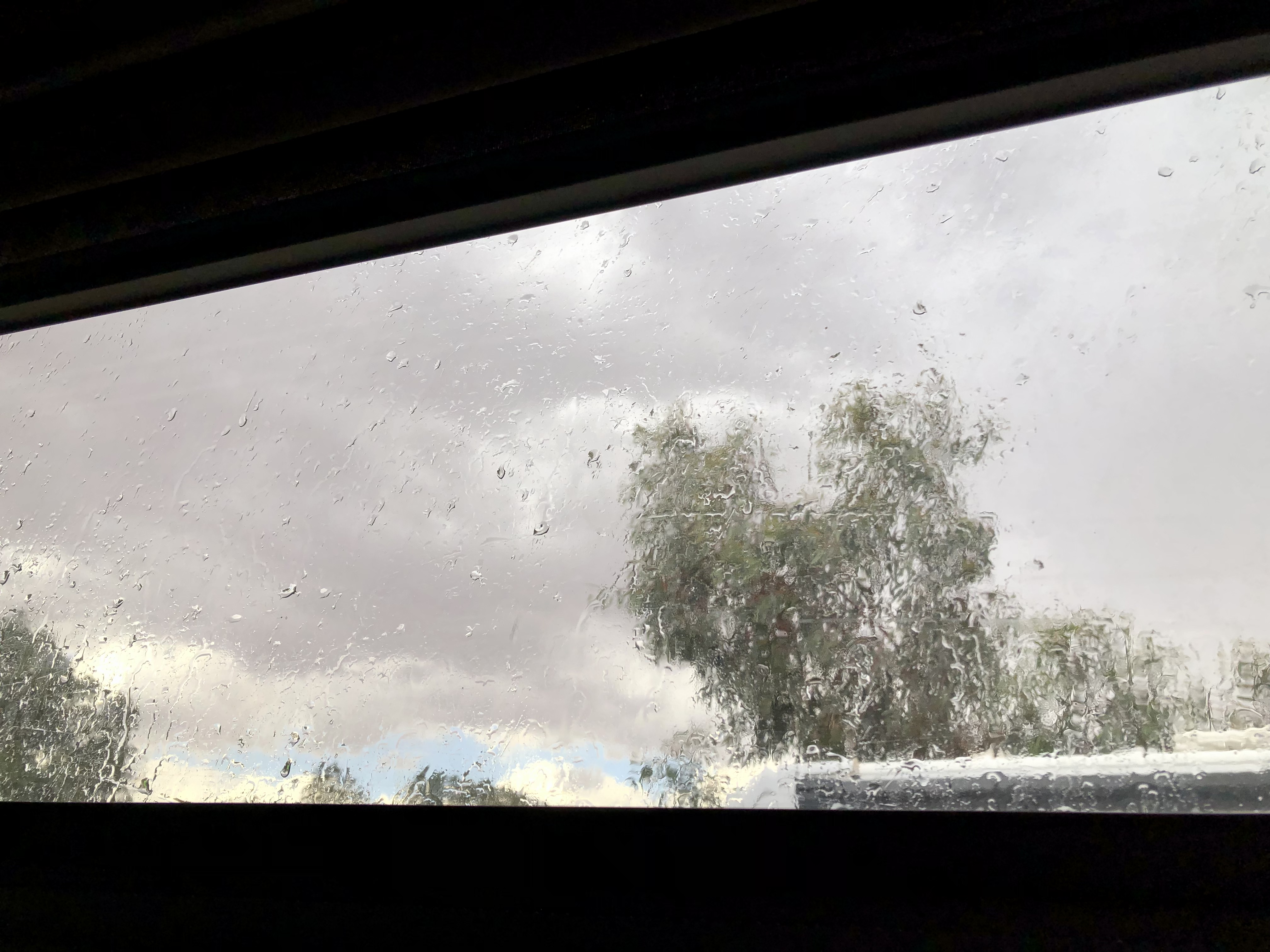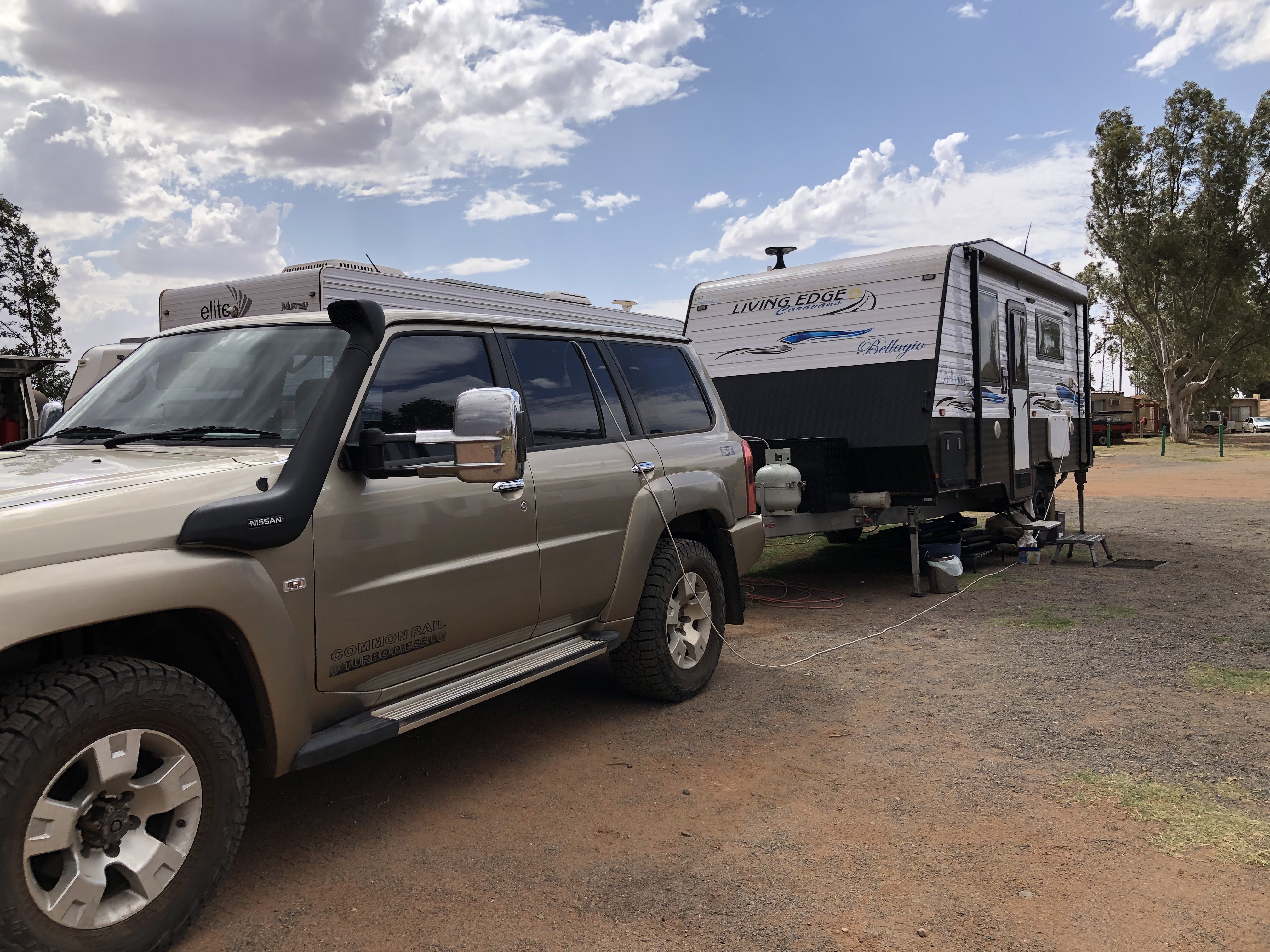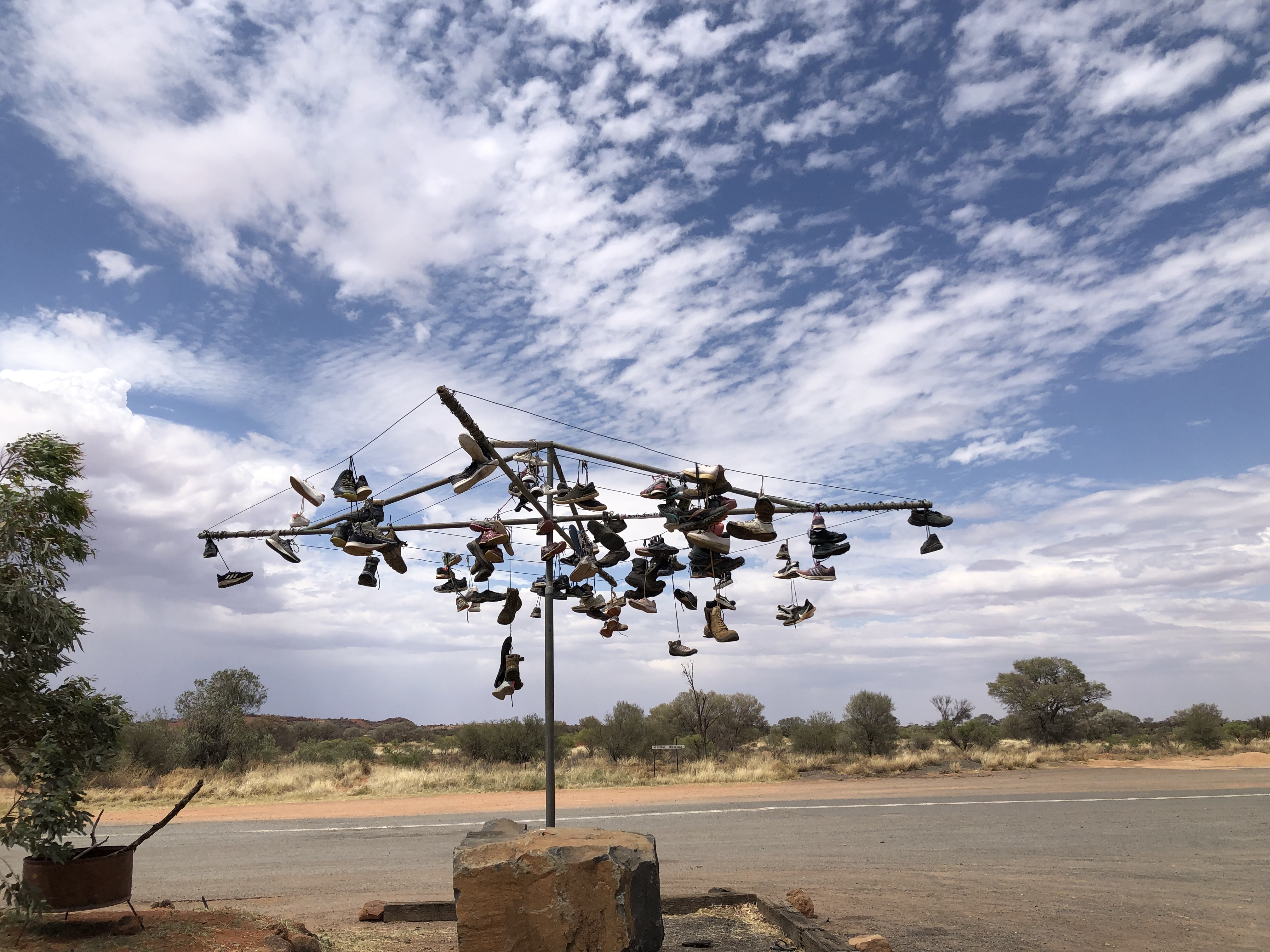 It was sunny when we arrived however shortly after, the skies darkened, thunder roared above and it started to rain – the first real rain for months. During the afternoon we experienced everything from sunshine, rainbows, storms and clear skies. A freezing cold south westerly then blew the storms away. We joined several of our fellow campers at the pub for dinner. The bar was decorated with all manner of underwear hanging from the ceiling. I wondered if the bras and things belonged to the owners of the shoes hanging on the hills hoist out near the fuel bowsers.