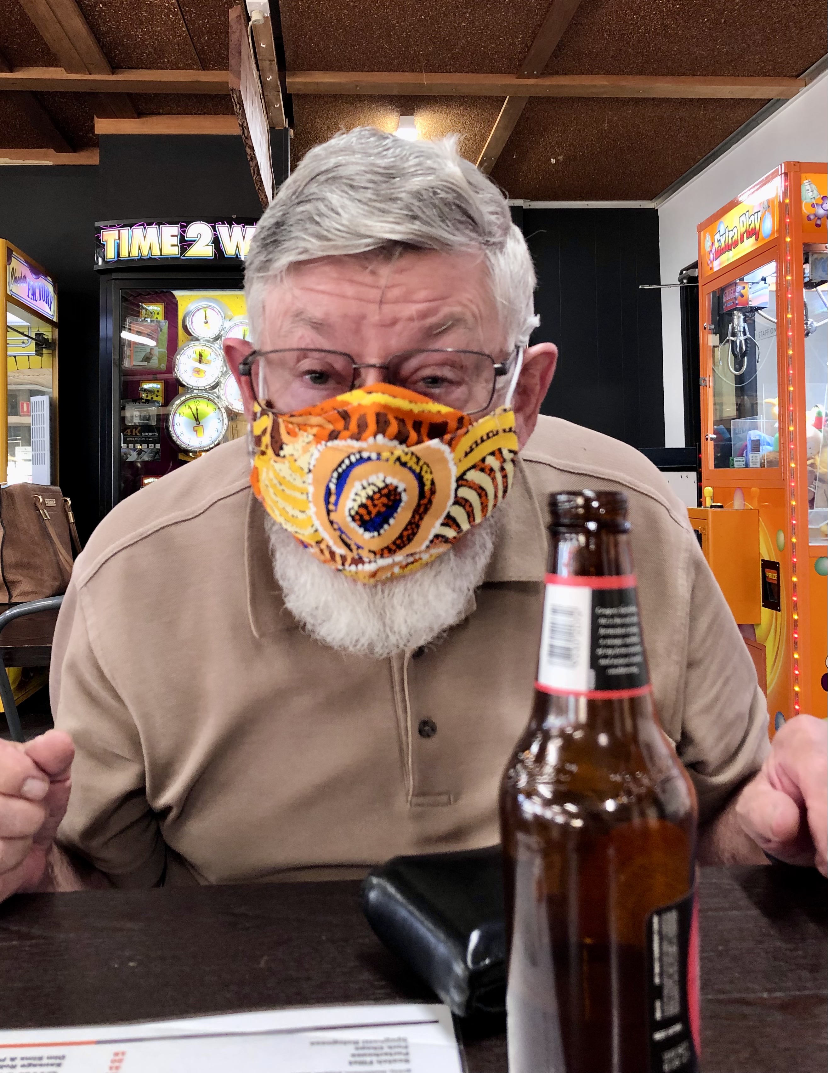 Here in SA they insist on wearing masks everywhere in doors, although it is not a requirement of their state government. ‘No mask, no service’ is the firm notice greeting one at just about all establishments (including public loos). When we dined out at the Marla Pub, Norm was able to test run his new mask which we bought in Darwin more as a souvenir than thinking it would actually be worn.
