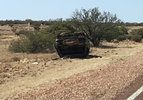 It was only 180 kms of mostly straight, flat, black or red road to the first Hotel/Service Station in South Australia at Marla. The only ‘road kill’ we passed was in the form of dead cars, some burnt out, some upright, others lying on their roofs minus wheels and other vital parts. Norm recalled an episode of the ‘Outback Truckers’ show where the very resourceful Truckers took their truck and car crushing machine out on the road, collecting the discarded wrecks, crushing them into small square blocks and cashing them in at the scrap metal yard. Apparently they made a reasonable living. I could not help wondering how many wrecks it would take for a week’s wages.