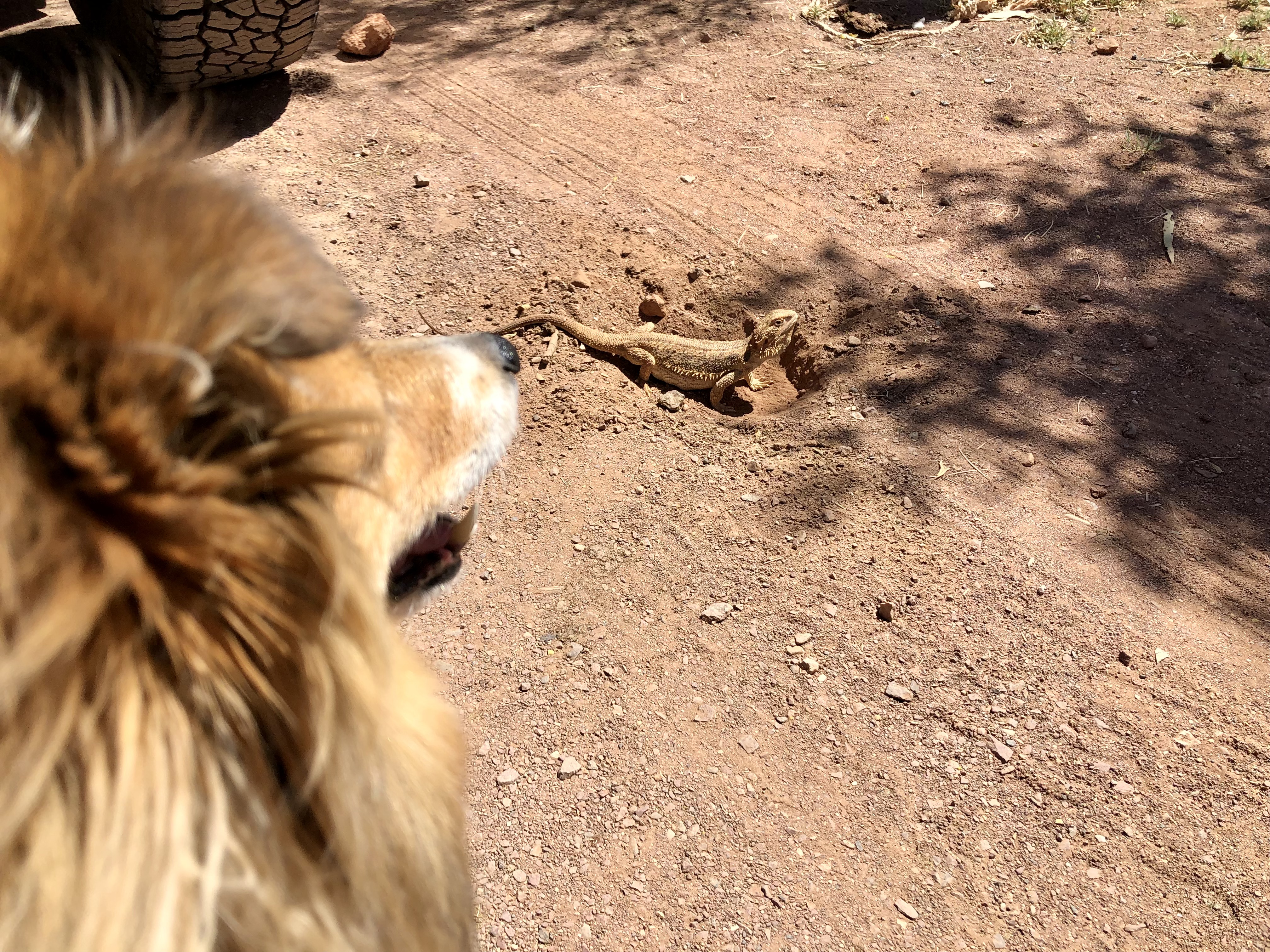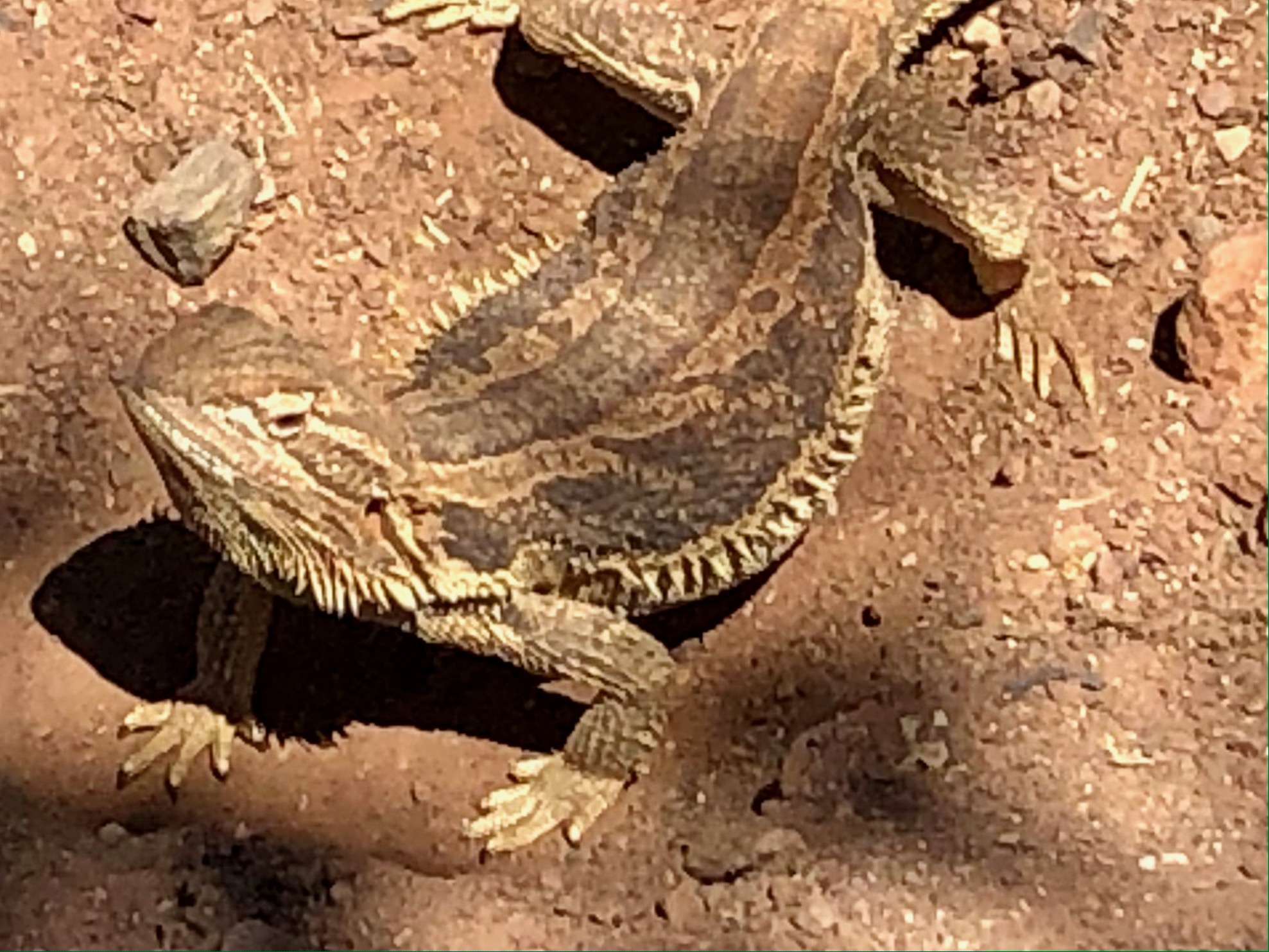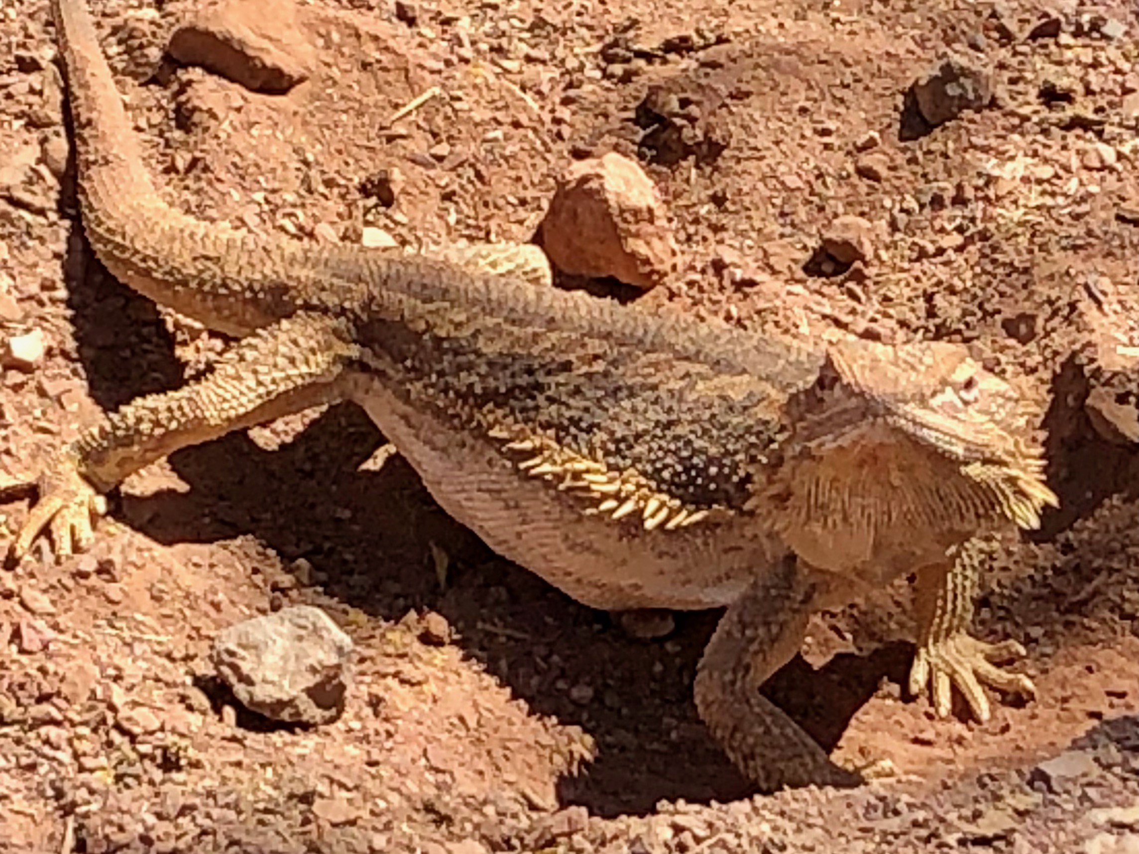 Another easy drive today, 280 kms of mostly straight, flat road with the occasional bend or hill to add variety. When we paused at the Cadney Homestead for a coffee and to change drivers, one of the very cute reptilian locals welcomed us.