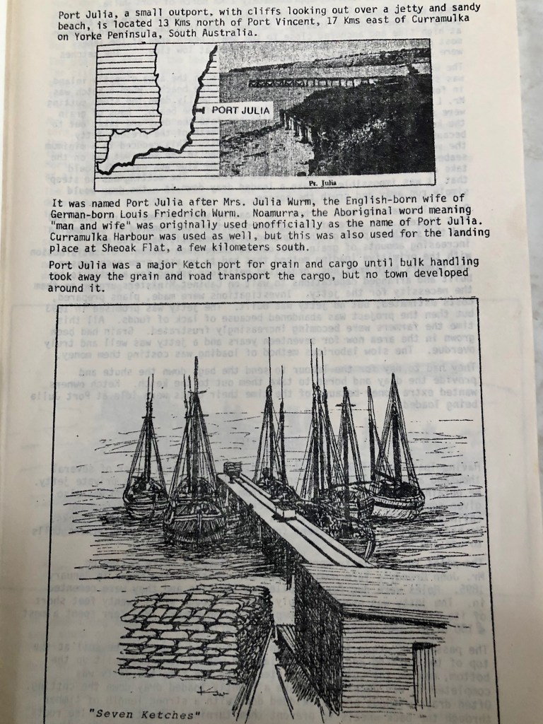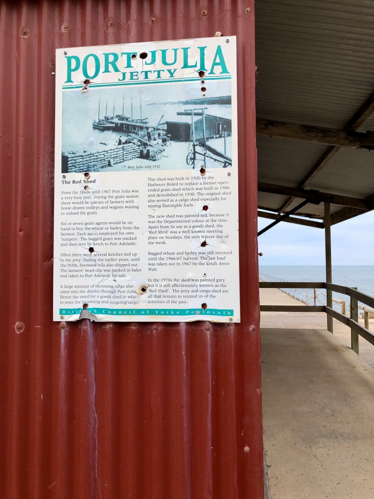 Leaving Point Turton after breakfast on 20 October, we drove across the Peninsular from Spencer Gulf to St Vincent Gulf. The next stop on schedule was at Port Julia, named after Daughter-in-Law Hayley’s GG Grandmother, Julia, an English lady, who married German born, Louis Freiderich Wurm back in the mid 1880’s.