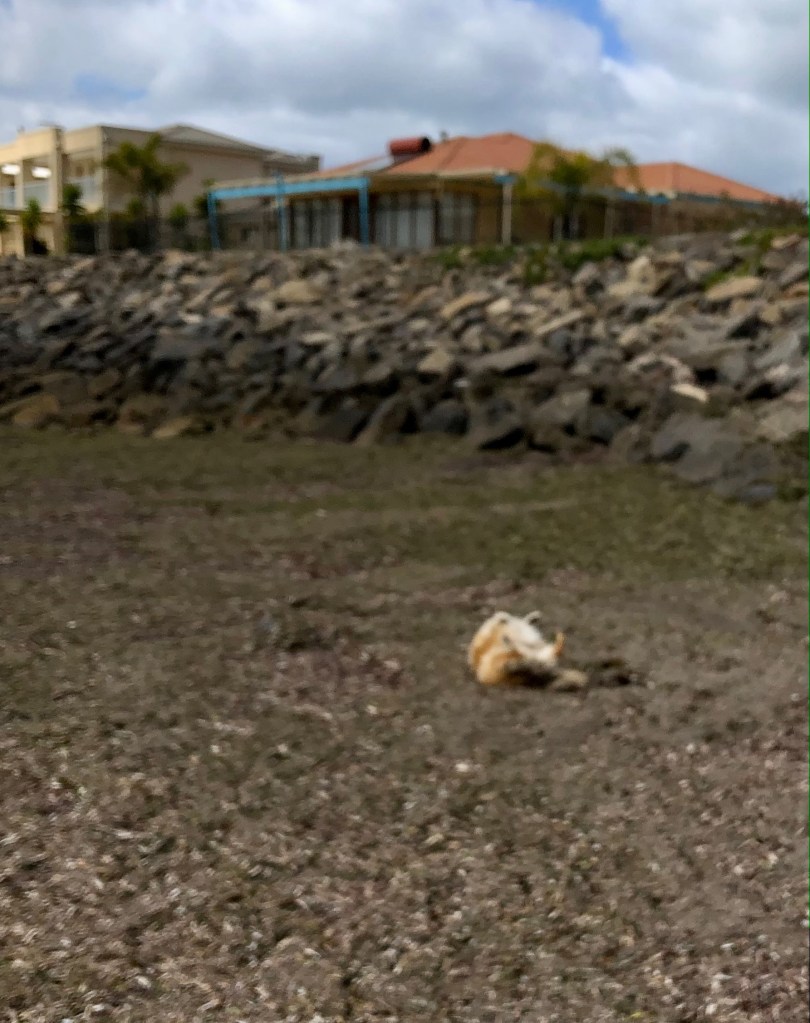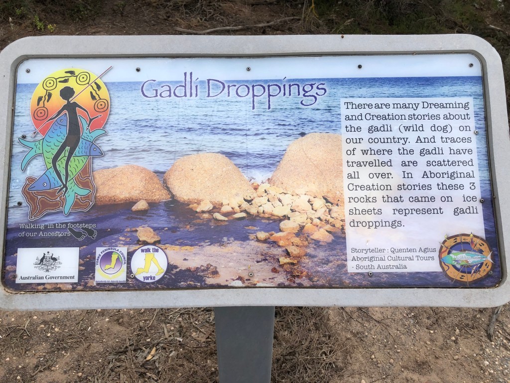 When we stopped to explore the three granite ‘Erratics’ on the beach behind the Marina, Rosie was particularly eager to get down there. I realised why, when she raced out onto the piles of smelly old ribbon weed and rolled in it. It made even more sense as I discovered that the indigenous people described the rocks nearby as dog droppings.