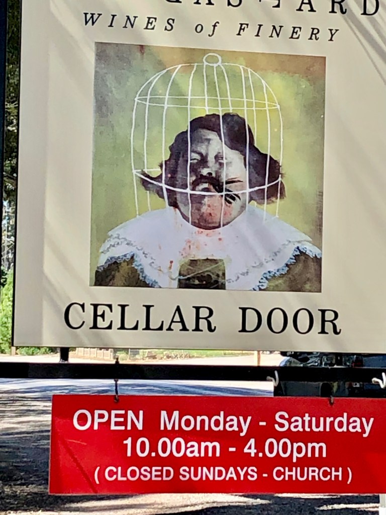 Before returning to Burra this morning, we dropped into the Mad Bastard Winery owned by another of the Barry family, Mark. The drive up to the Cellar Door took us through lovely thick green corridors of trees, and past some amusing signs. We had tried to call in on Sunday, however the sign on the closed gate indicated they were at church. Their ‘sister’ winery, Good Catholic Girl with all their religious icons was, however, open on Sunday.