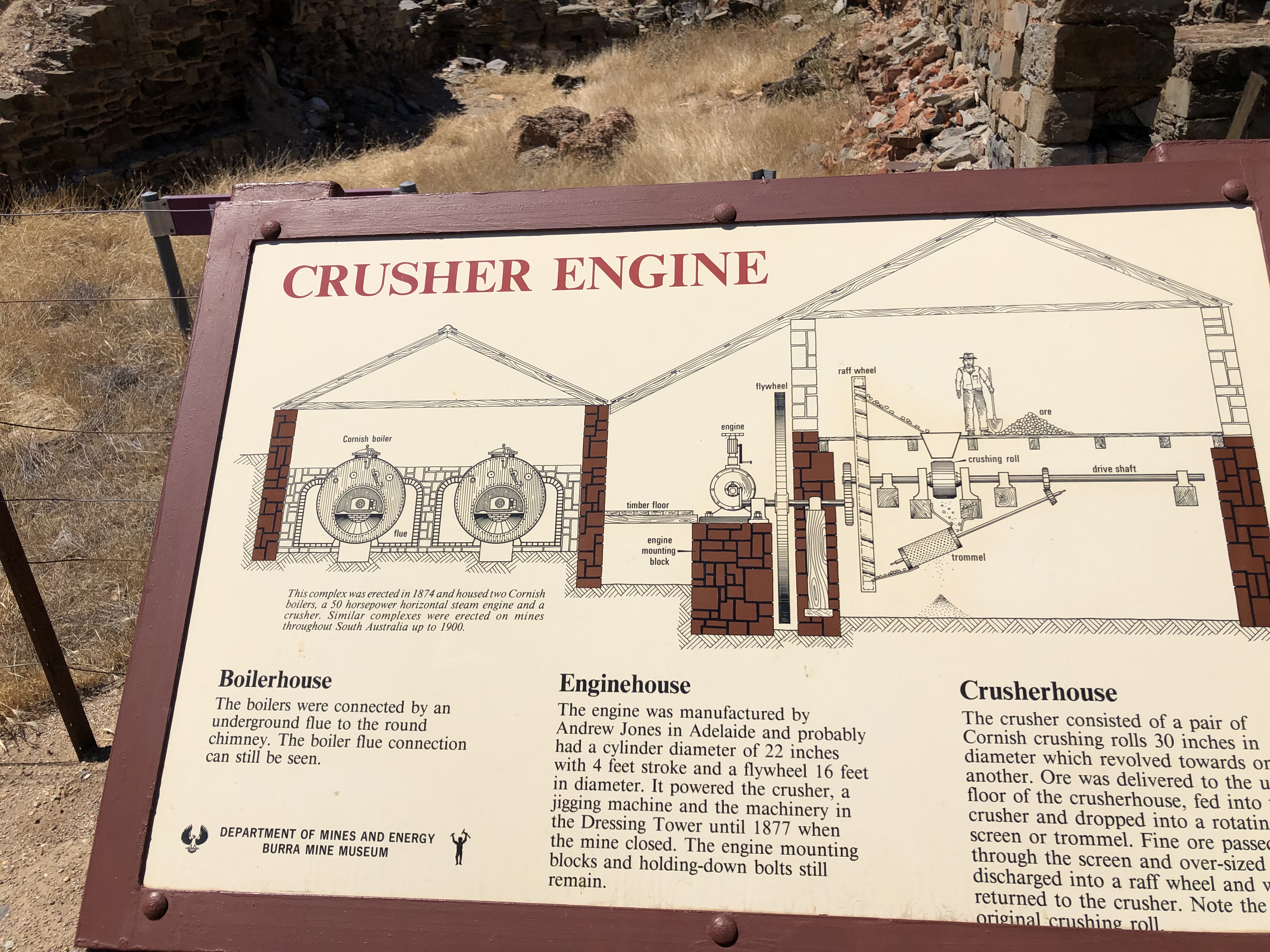 The Burra Mine historic site was so interesting. Although we had previously explored this site, this time there was no personal guide. Entry is via a key that we were given to use at the Tourist Information Centre. There are many informative information signs and this time we were able to go into several of the restored constructions, including: