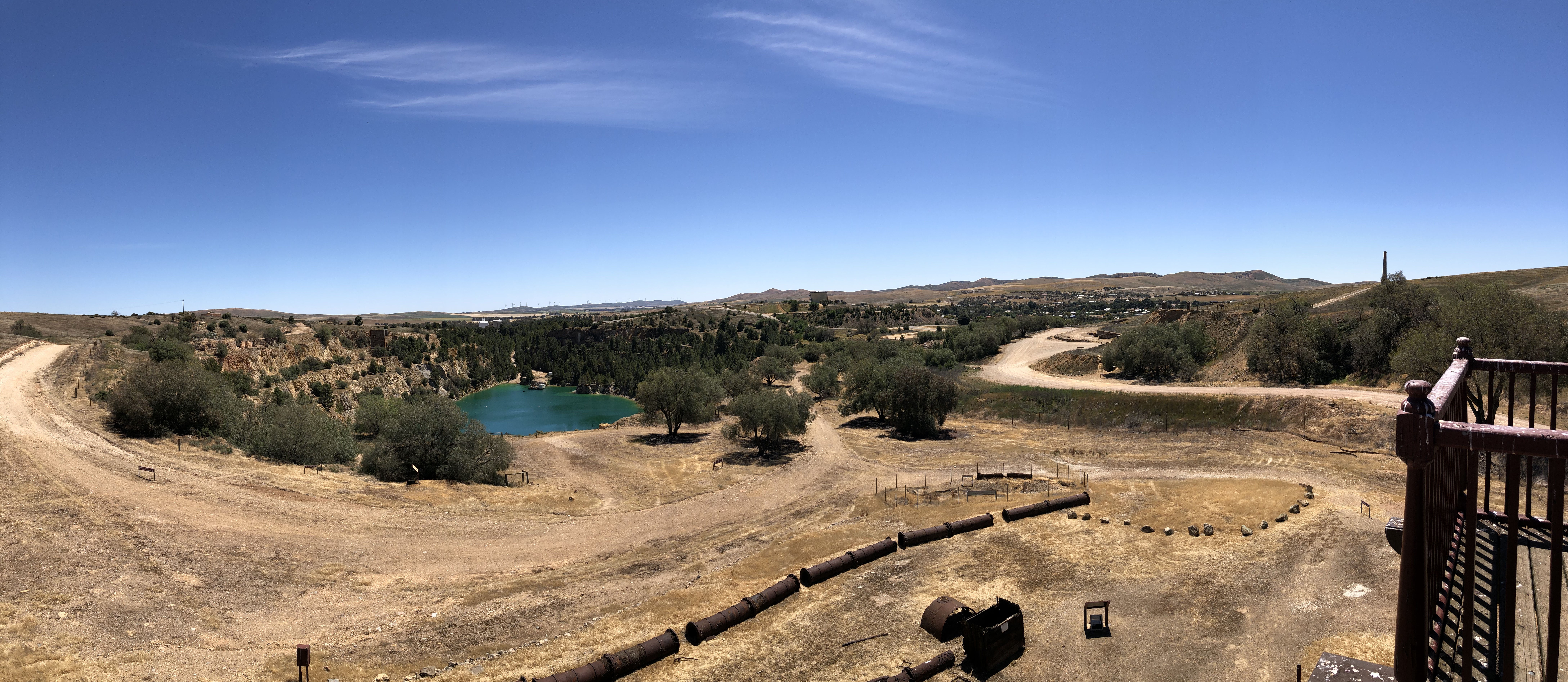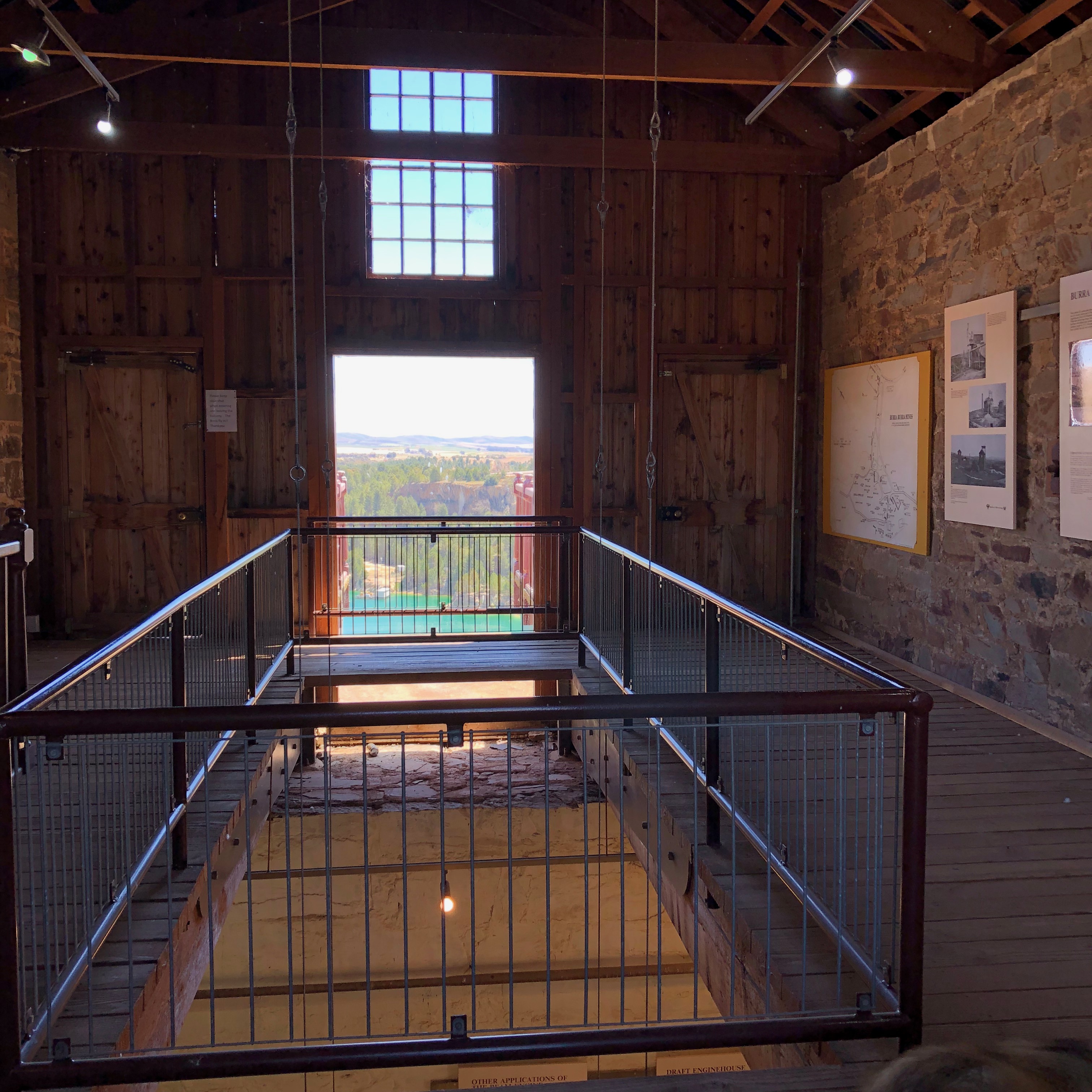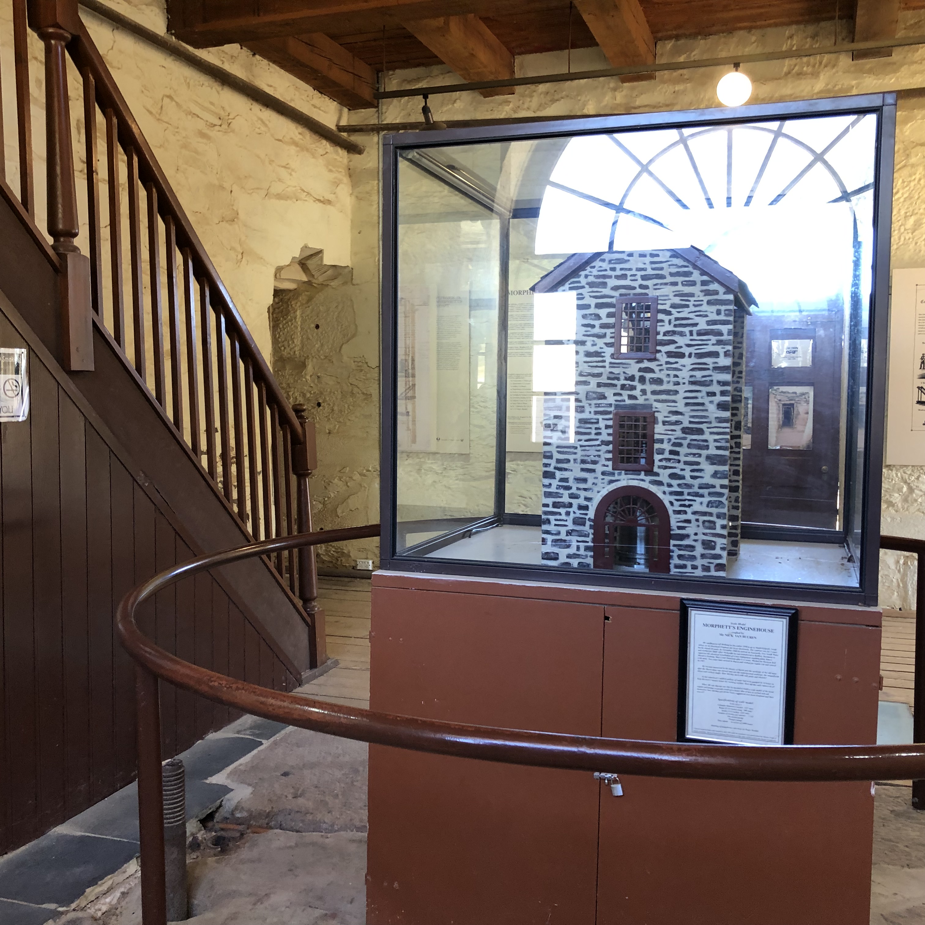 the Enginehouse, originally constructed in 1858, gutted by fire in 1925 and fully restored in 1986. It is thought to be the only reconstructed Cornish enginehouse in the world. There are views from the top of the Pumphouse, back over the beautiful blue open cut water hole; and