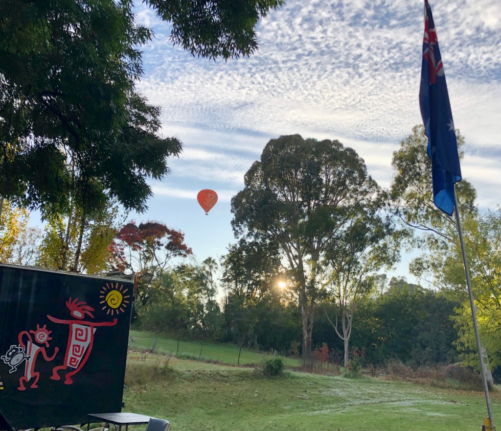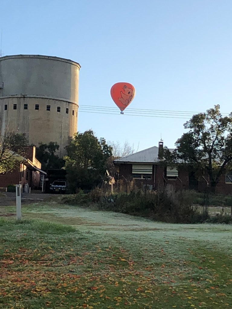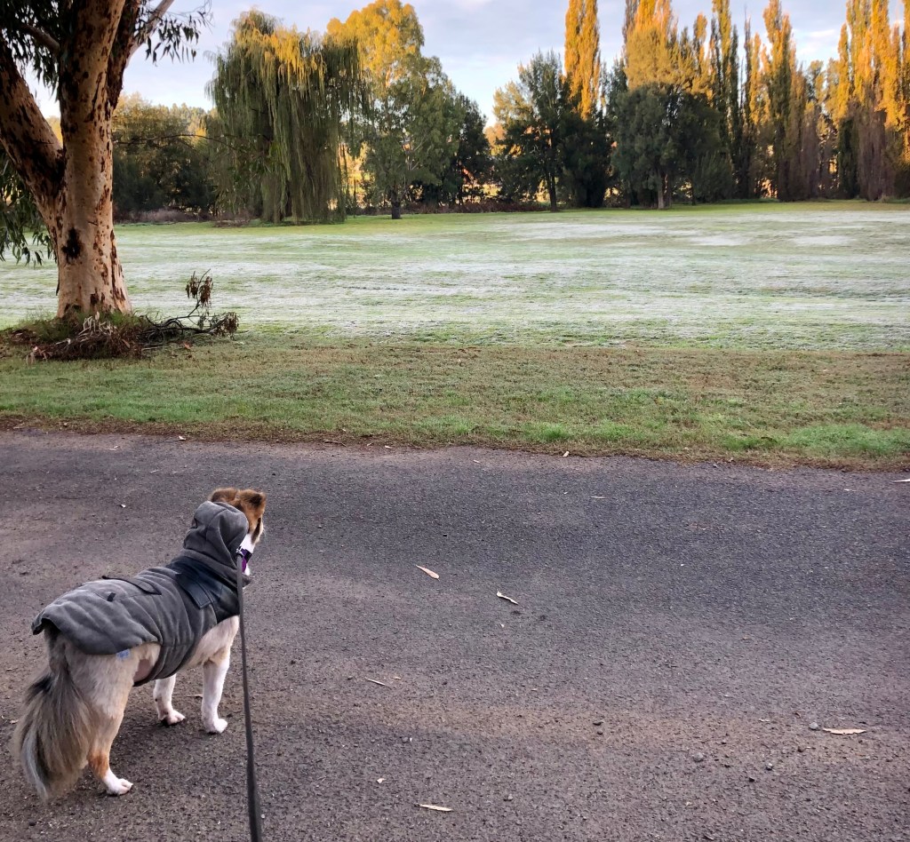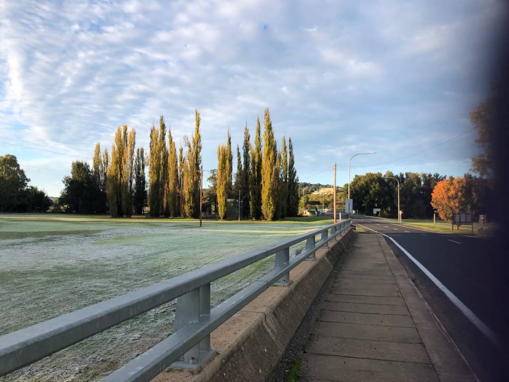 Thank goodness for gas heating – despite the frosty white landscape outside it was toasty warm inside the van this morning. Rosie and I just had to head outside and enjoy a brisk walk before breakfast. A Balloon chaser support truck drove past us as we ambled over the bridge. Soon after, the local dogs started to bark and I could hear the unmistakable huuufff puuufff of a hot air balloon. A bright orange balloon floated up over the town. Unimpressed by the spectacle overhead, Rosie was ready to hurry back ‘home’ for breakfast and the warmth of that gas heater by then.