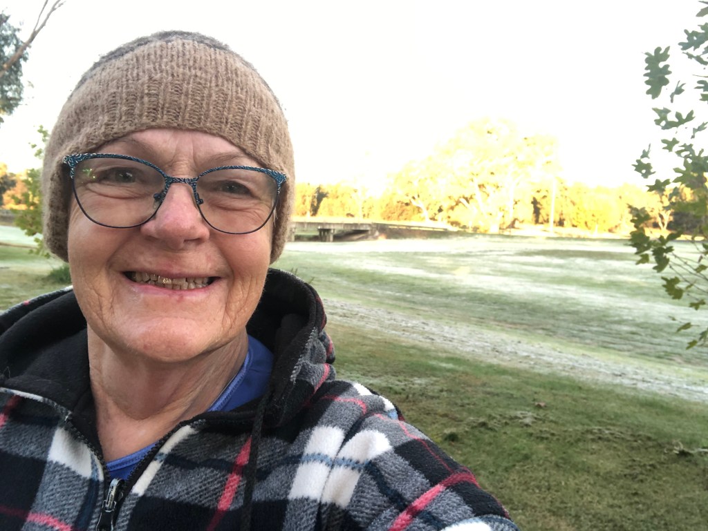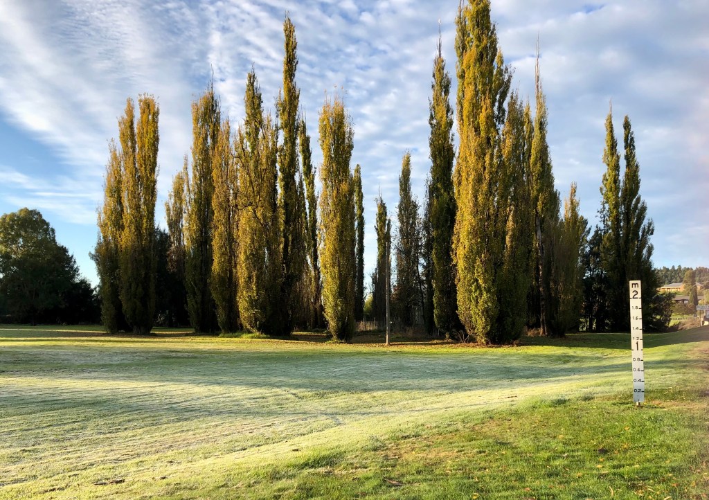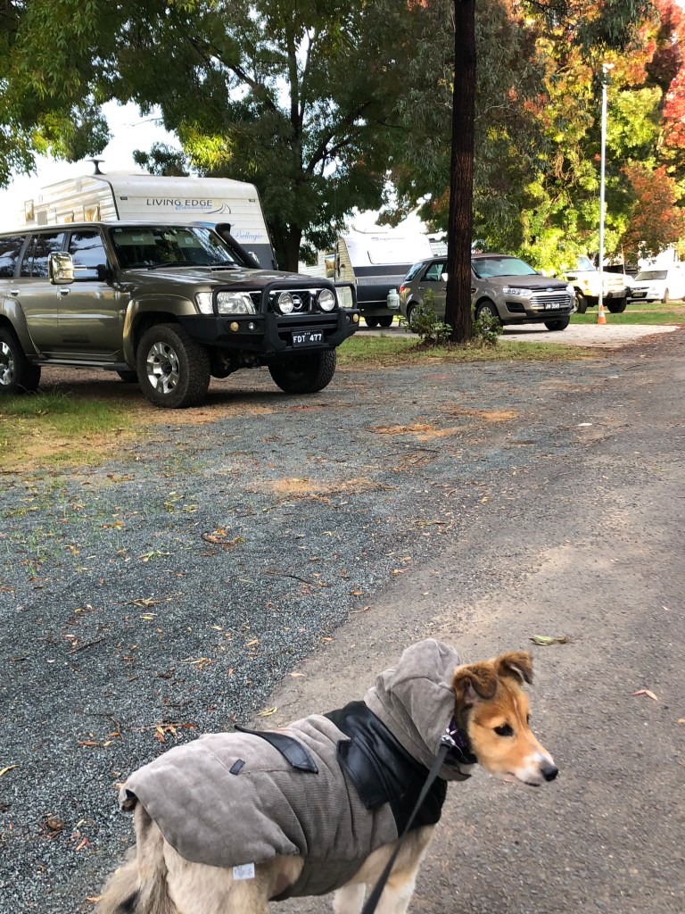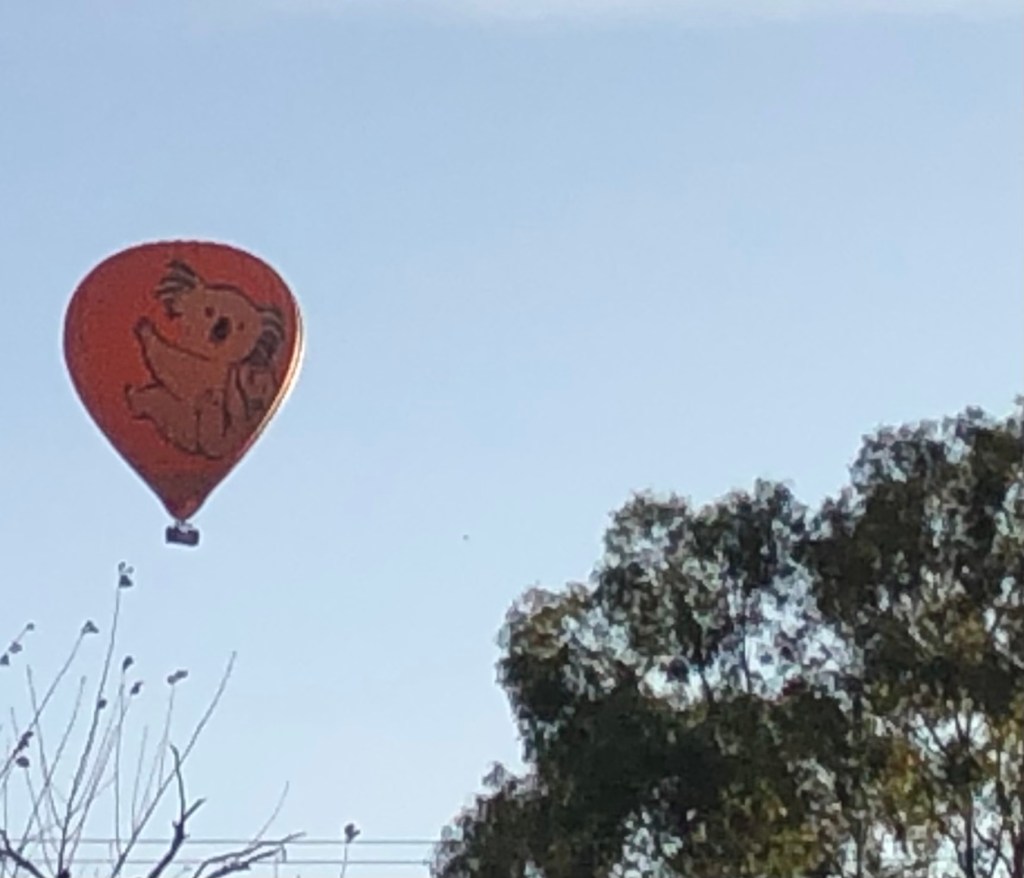 Thank goodness for gas heating – despite the frosty white landscape outside it was toasty warm inside the van this morning. Rosie and I just had to head outside and enjoy a brisk walk before breakfast. A Balloon chaser support truck drove past us as we ambled over the bridge. Soon after, the local dogs started to bark and I could hear the unmistakable huuufff puuufff of a hot air balloon. A bright orange balloon floated up over the town. Unimpressed by the spectacle overhead, Rosie was ready to hurry back ‘home’ for breakfast and the warmth of that gas heater by then.