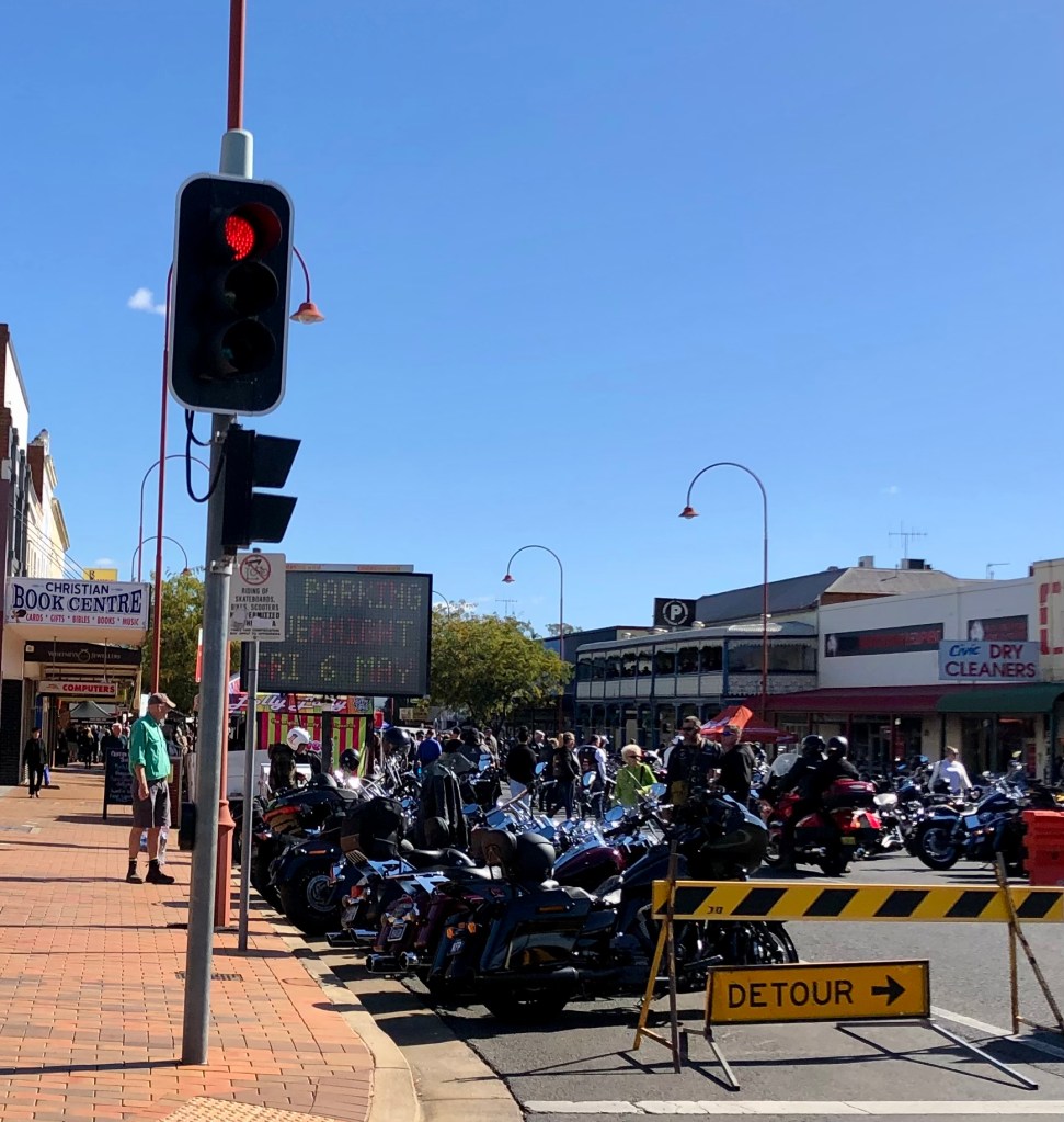 From Canowindra we drove through Cudal, Molong , Wellington and Geurie, then skimmed past Dubbo, which has grown into a huge city. Along the way we shared the road with many more motor bikes than usual. As we drove past the central hub of Dubbo, we discovered that it had been barricaded off for some special celebration or gathering of the bikie clans. Norm has since ’googled’, and we now know that it was ”All about the ride – The Dubbo Motor Bike Rally ”from Harleys to Hondas, Beemers and Piaggios to Posties” etc. We had also noticed that there were many more highway patrol cars than usual along the Mitchell Highway leading into Dubbo.