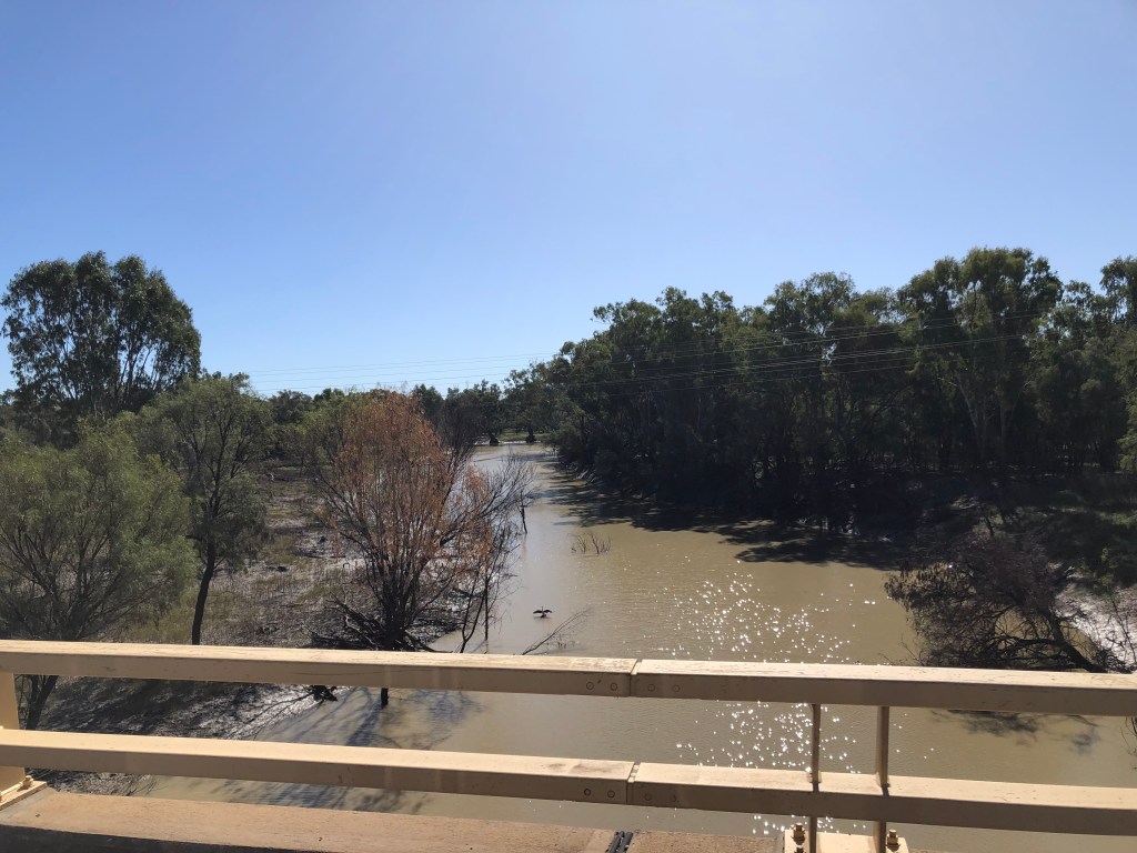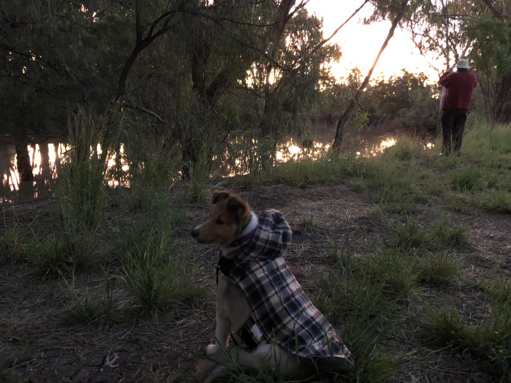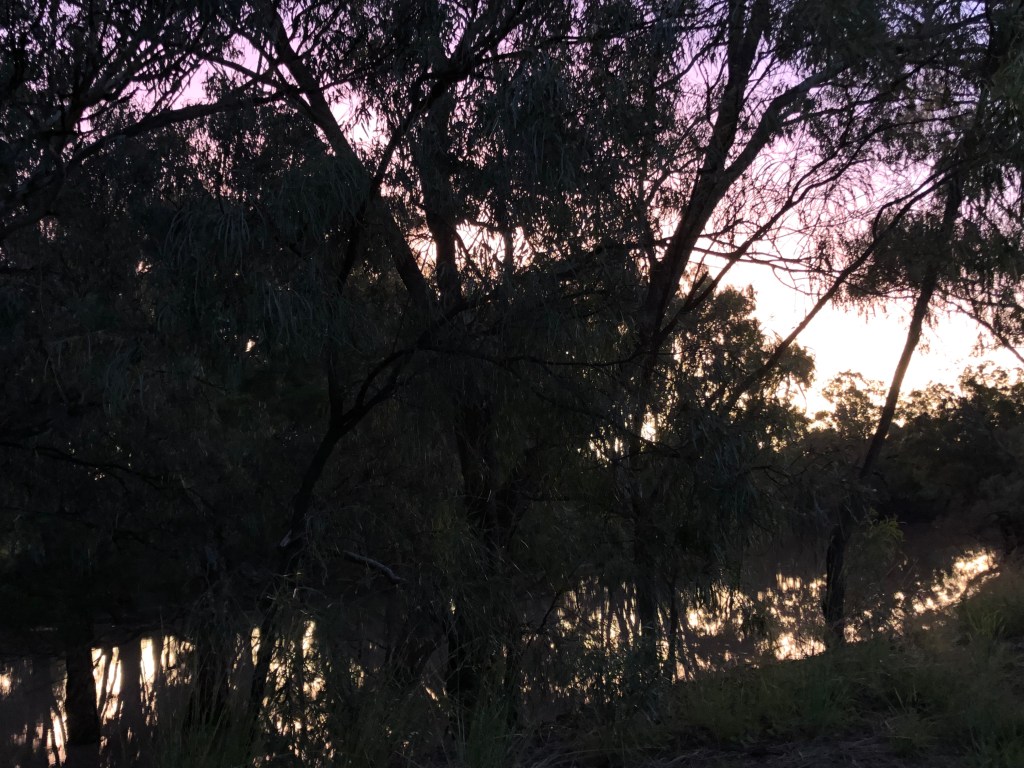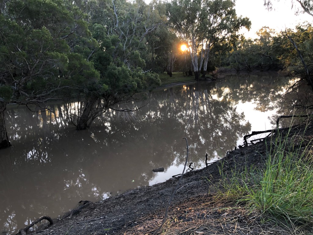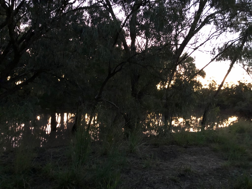 Although there were deep muddy wheel ruts leading into the camp site near the Balonne River Bridge, the surface was firm and dry. In no time camp was set up and we relaxed with a cuppa beside the river, enjoying the bird song as the sun set behind the trees. Many of the lower trees are surrounded by water, indicating that the river is much higher than usual. I had been thinking about my Tony and feeling sad that I would not be hearing from him for mother’s day. However, I was cheered up no end by a call from my youngest daughter, Jennifer as the sunset lit the sky turning it the most delightful crimson red.. I am very blessed.