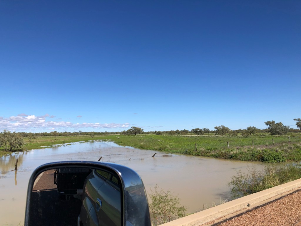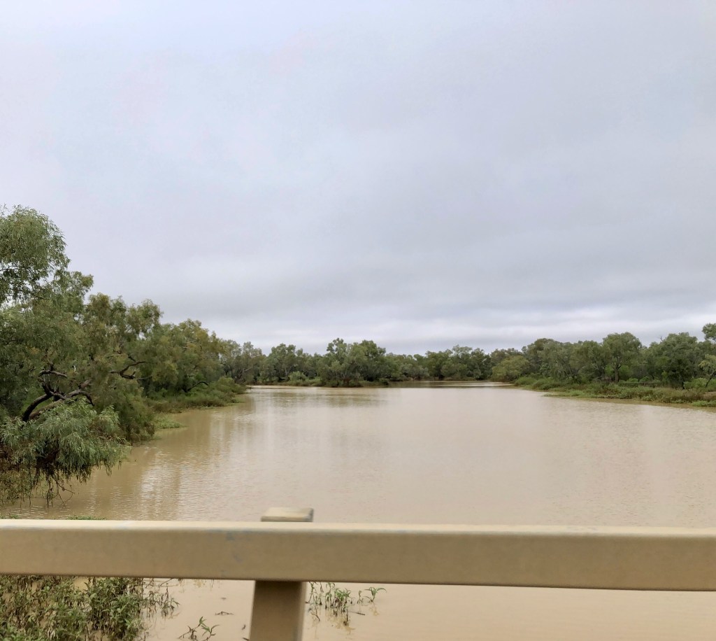Although there hasn’t been any further rain for a couple of days, many roads out here are still closed and camp sites beside rivers are not accessible yet because of the very muddy conditions anywhere off the sealed roads. We had hoped to spend a night camping by our camp fire beside the Darr River, where we enjoyed a wonderful evening last year. However the river was way up higher, and we didn’t dare drive onto the track along the river.