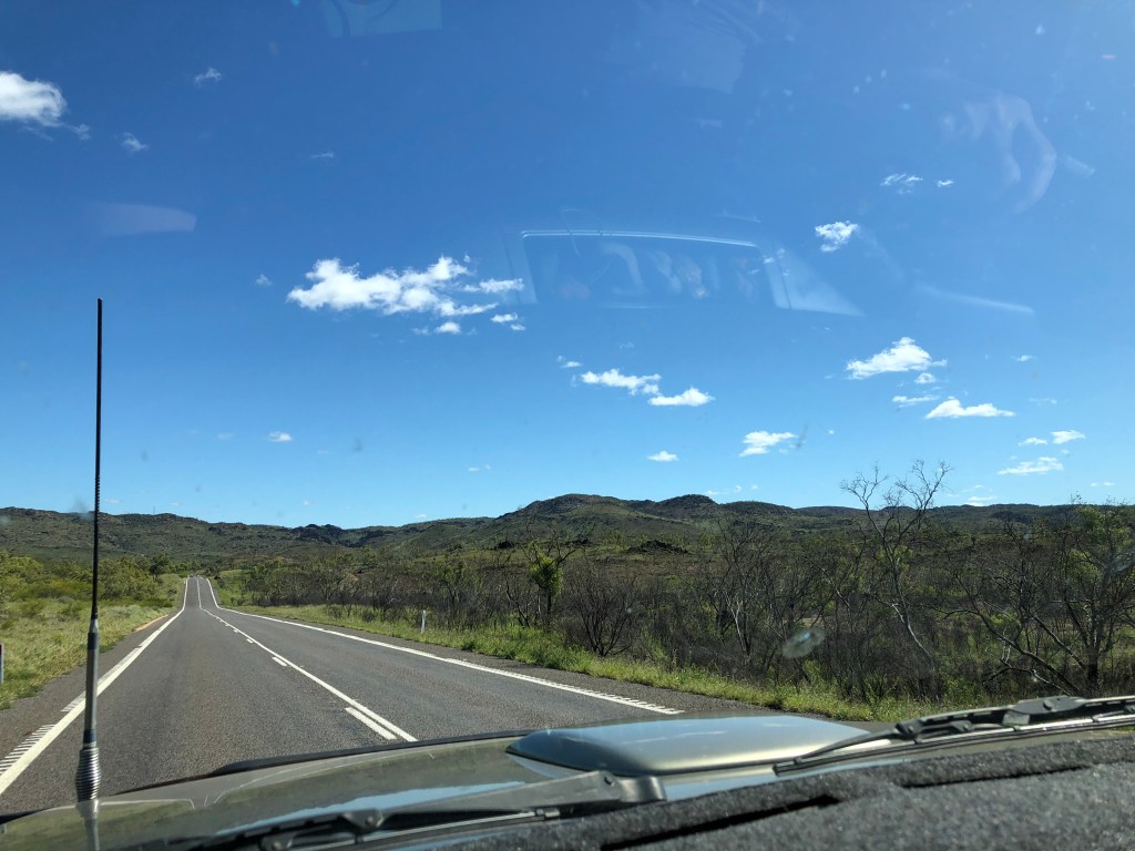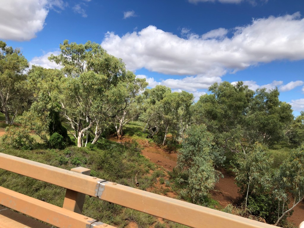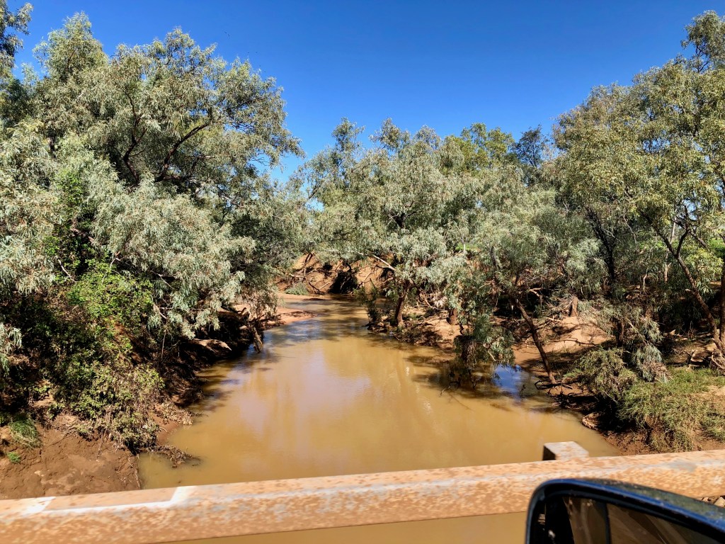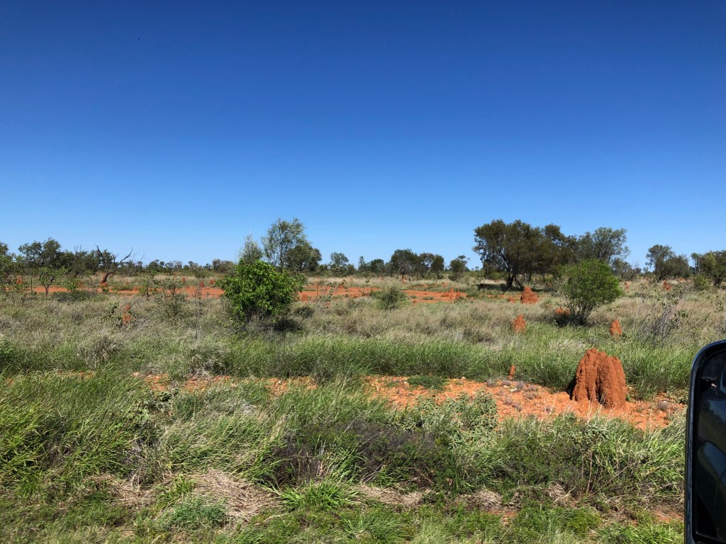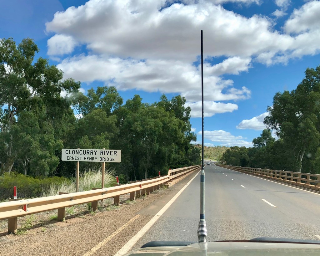 For about the next 20 kilometres the road undulated its way up and down, over the many braided sections of the McKinlay River. We felt like we were out at sea going up and down the waves. Gradually, the landscape changed from brilliant green to the more familiar red dirt and termite mounds, dotted by round green puffs of spinifex.