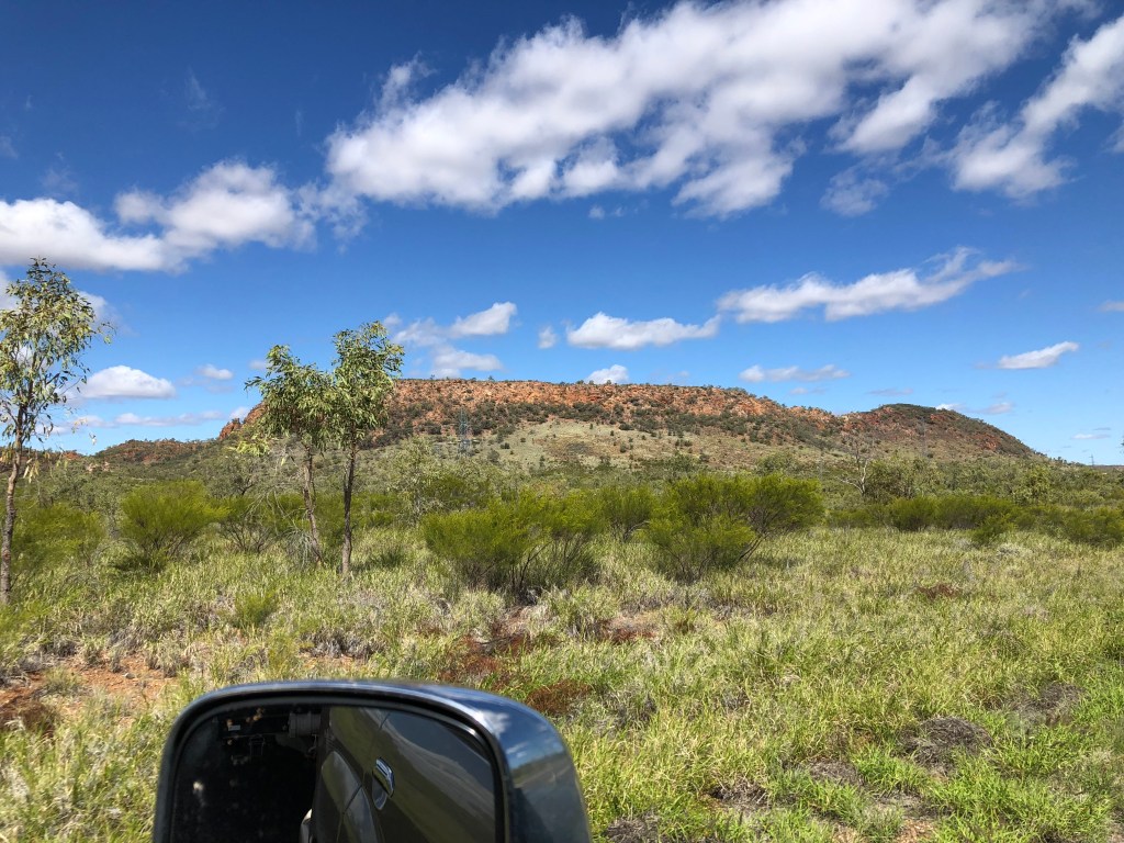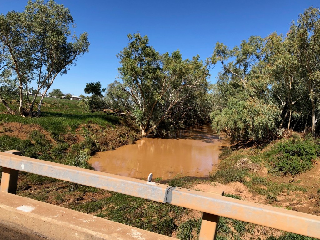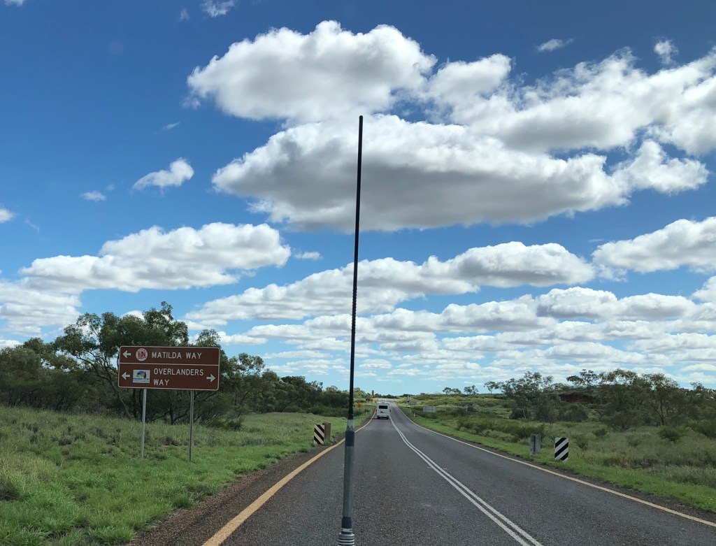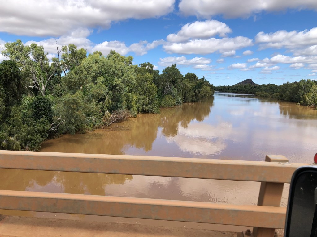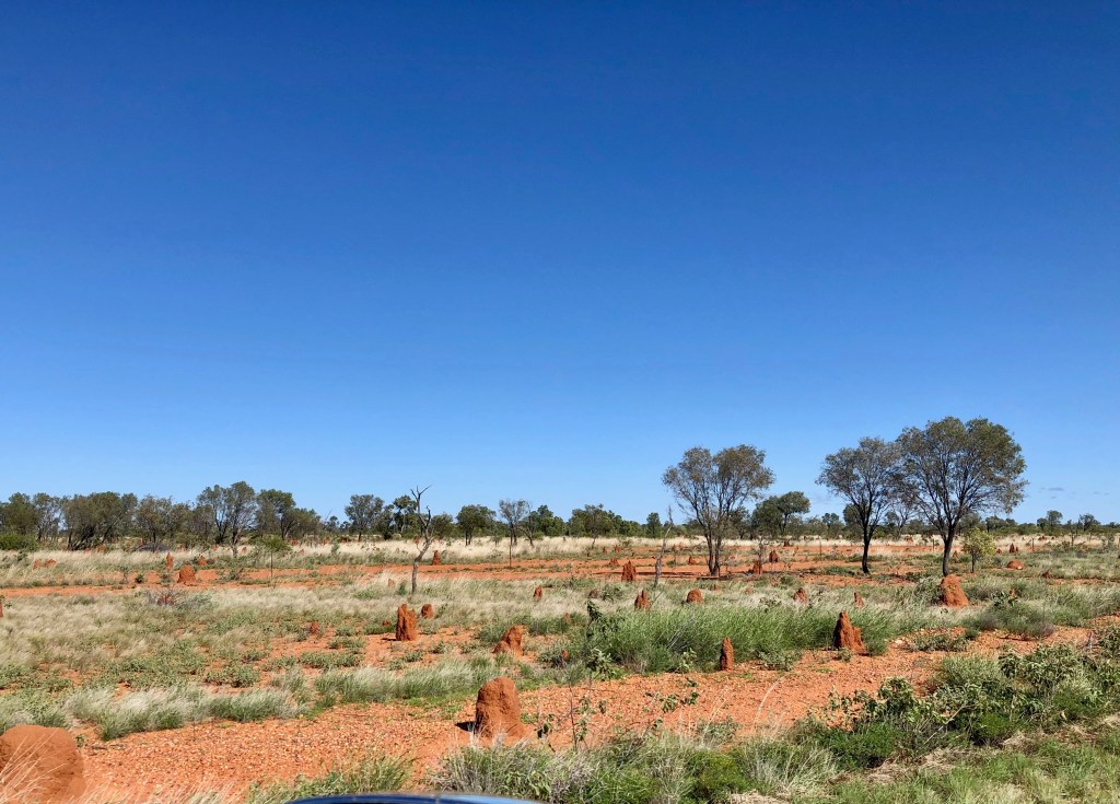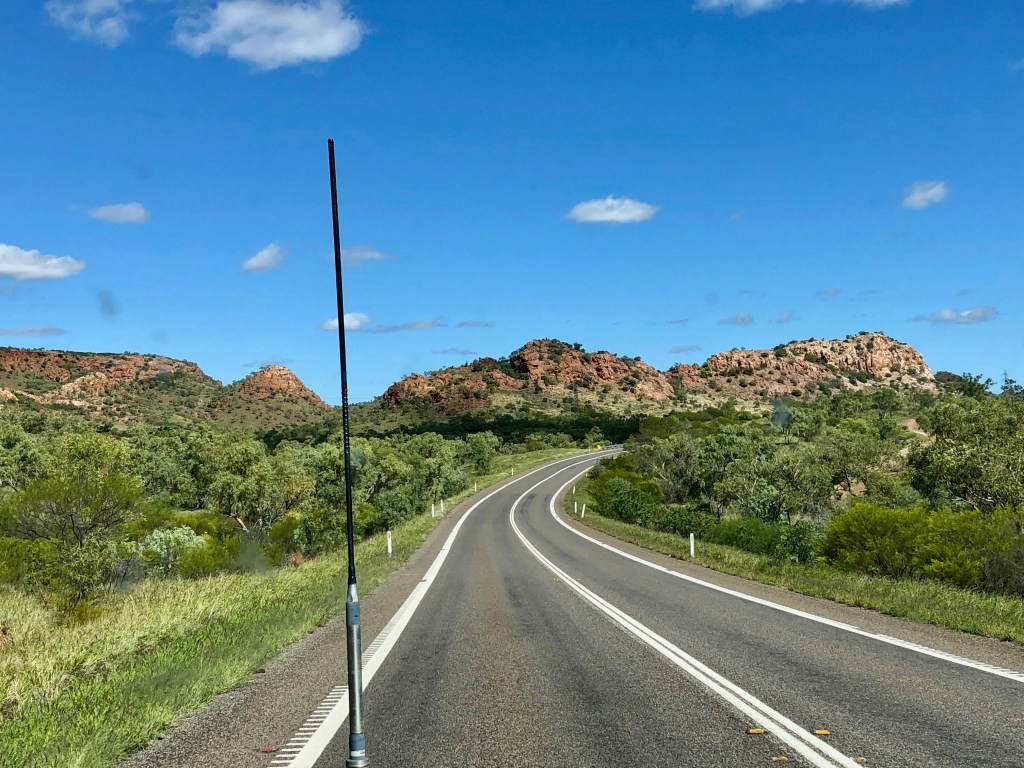 For about the next 20 kilometres the road undulated its way up and down, over the many braided sections of the McKinlay River. We felt like we were out at sea going up and down the waves. Gradually, the landscape changed from brilliant green to the more familiar red dirt and termite mounds, dotted by round green puffs of spinifex.