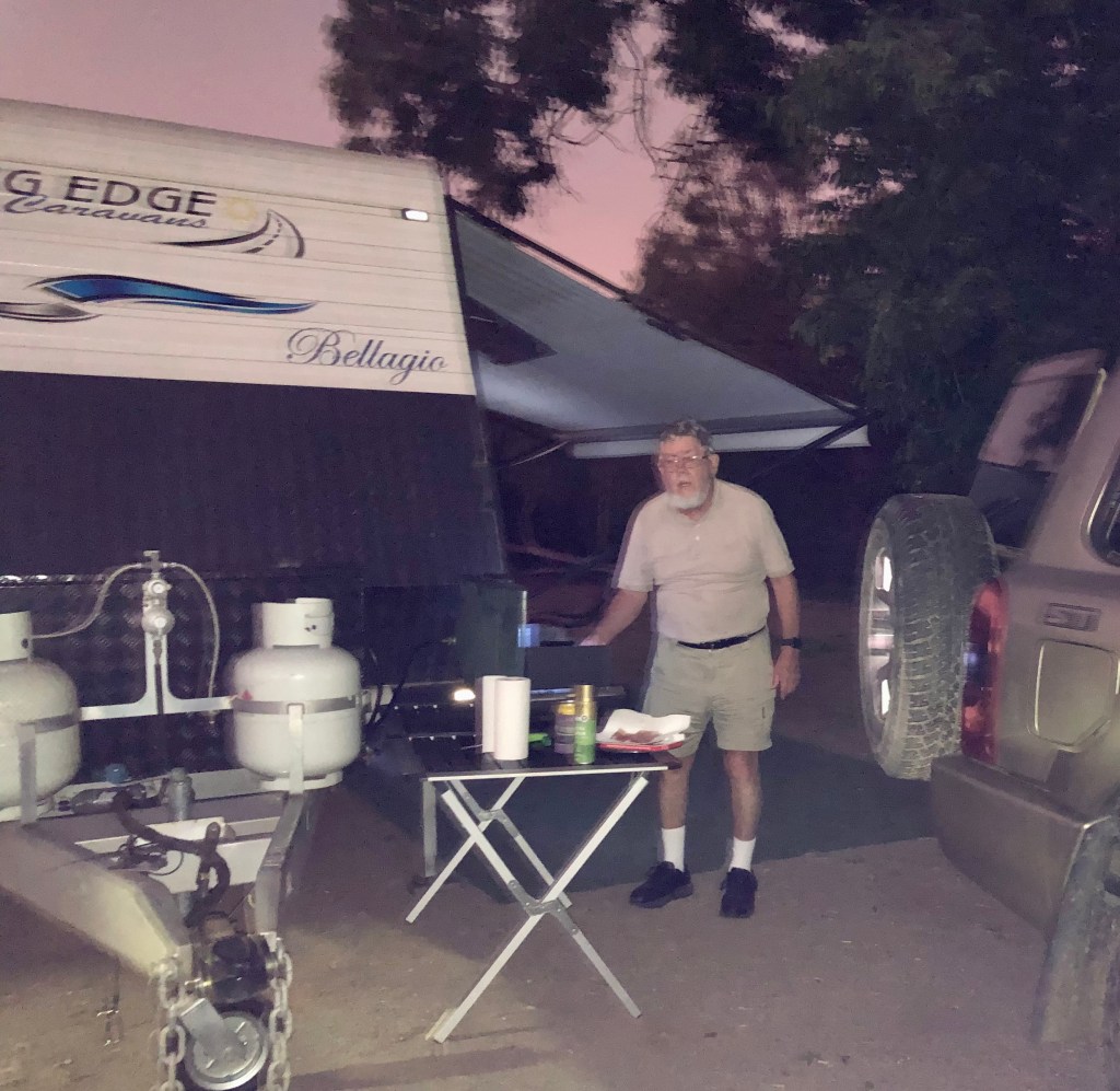 With a great deal of relief that our mechanical problems had been so easily resolved, we settled back in camp to watch the sun set over Sunset Caravan Park, with a refreshing ale/wine. The chef then BBQ’d our first steaks for this trip (They are SO expensive at the moment).