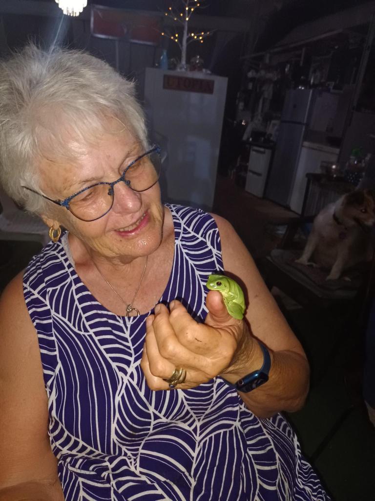 James also introduced me to one of the local frogs that live and croak loudly in Denise’s beautiful potted plants.