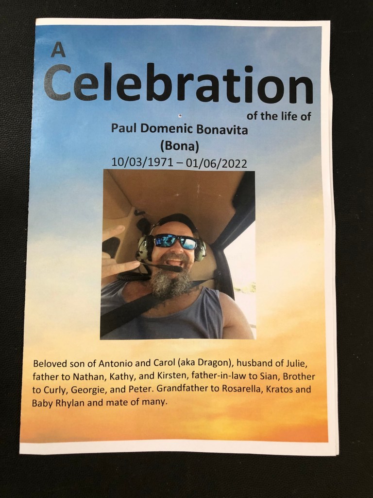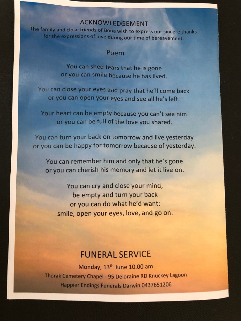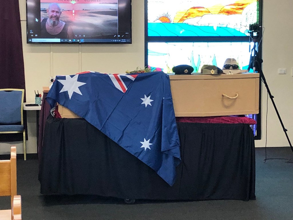 Yesterday was a sombre, emotional but also a happy day, as the time for the funeral of Paul Bonavita finally had arrived. The memorial service was held up in Darwin at the Thorak Cemetery Chapel. Many of Paul’s friends from all parts of his life came, including of course his family, those from his military days and others from his civilian life. Norm and I first met Paul during our visit last year. On the second day of our current visit, Norm joined Paul, James, Richard and others at the Men’s Shed. Paul passed away that evening, leaving so many people devastated.
