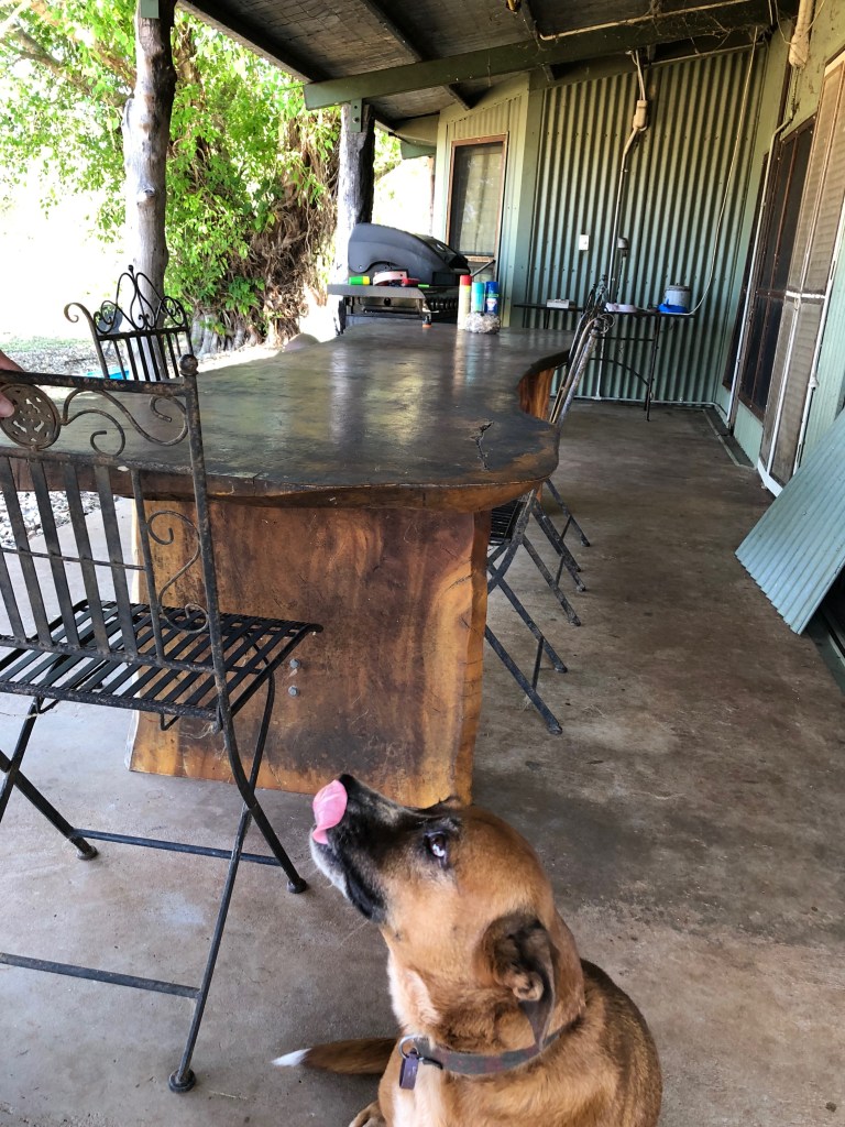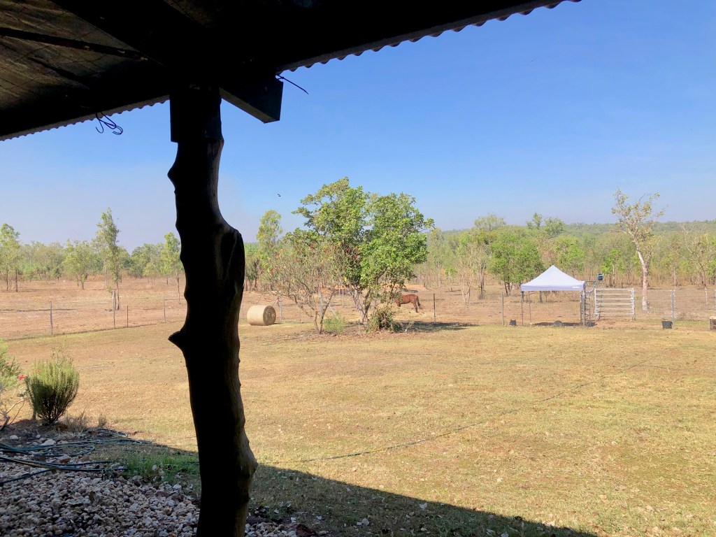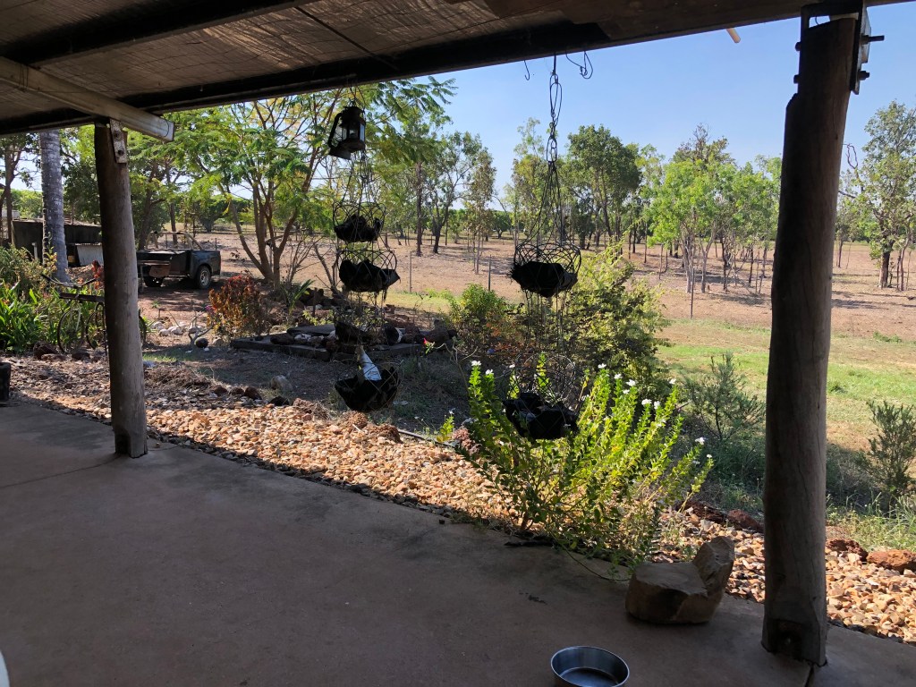 Denise has been house and pet sitting for friends, so we dropped her back to ‘The River Grove’ afterwards. The property is near Berry Springs and the Darwin River. The house is a beautifully quaint cottage with a verandah from which there are sweeping views across the paddock and to the trees beyond.