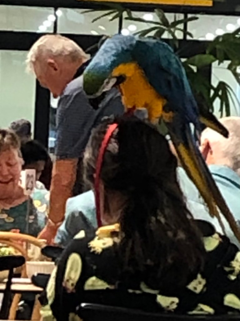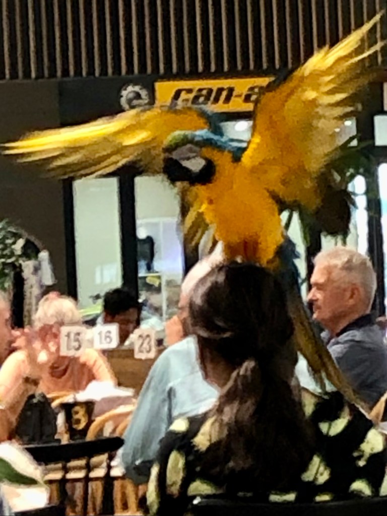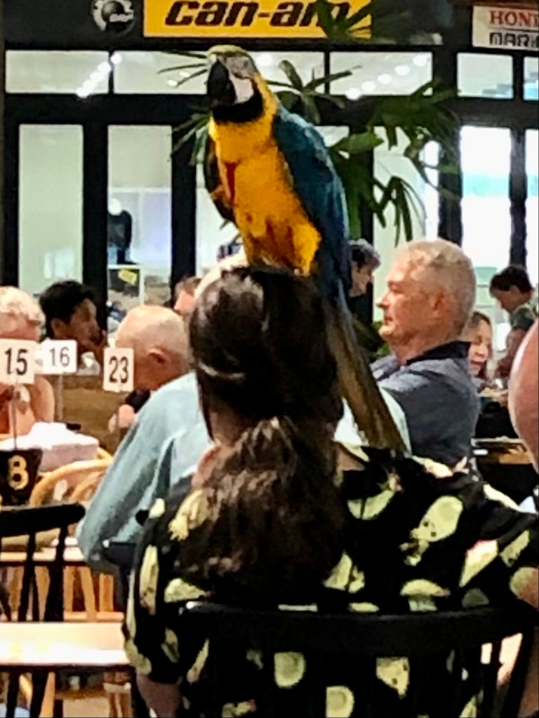 After the visitors flew off Norm and I drove up to Coolalinga. There was the most exotic lady, with an even more exotic bird perched on her head. She was feeding the poor bird french fries, so when the bird dropped one of the chips, its companion had a chip on her shoulder.
